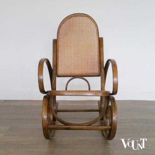Deze schommelstoel in de stijl van Thonet is ca. jaren ’60 geproduceerd door het Spaanse bedrijf Valenti, onder andere bekend door hun opklapbare leren campaign chairs. De stoel is in goede staat. Normale sporen van ouderdom en gebruik. De rotan zitting is onlangs vervangen.