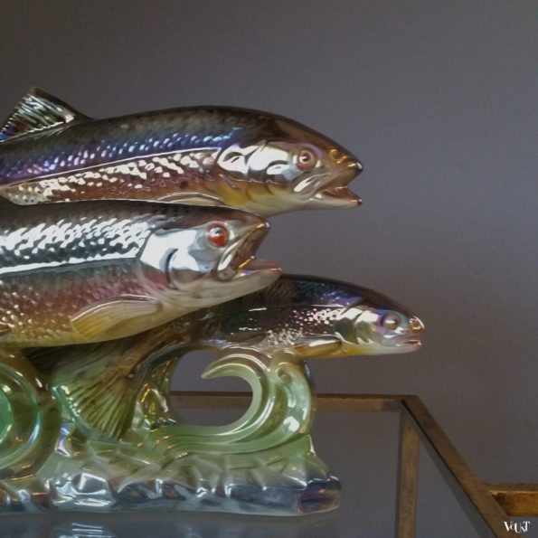 Toegegeven: het hangt er tegenaan, maar we zijn er wel voor gevallen. Deze vissen zijn van aardewerk met tinglazuur en lijken daardoor haast levensecht. Afkomstig van de Belgische firma H. Bequet. Een klein gerepareerd (en nauwelijks zichtbaar) breukje in één van de vinnen (van de middelste vis).