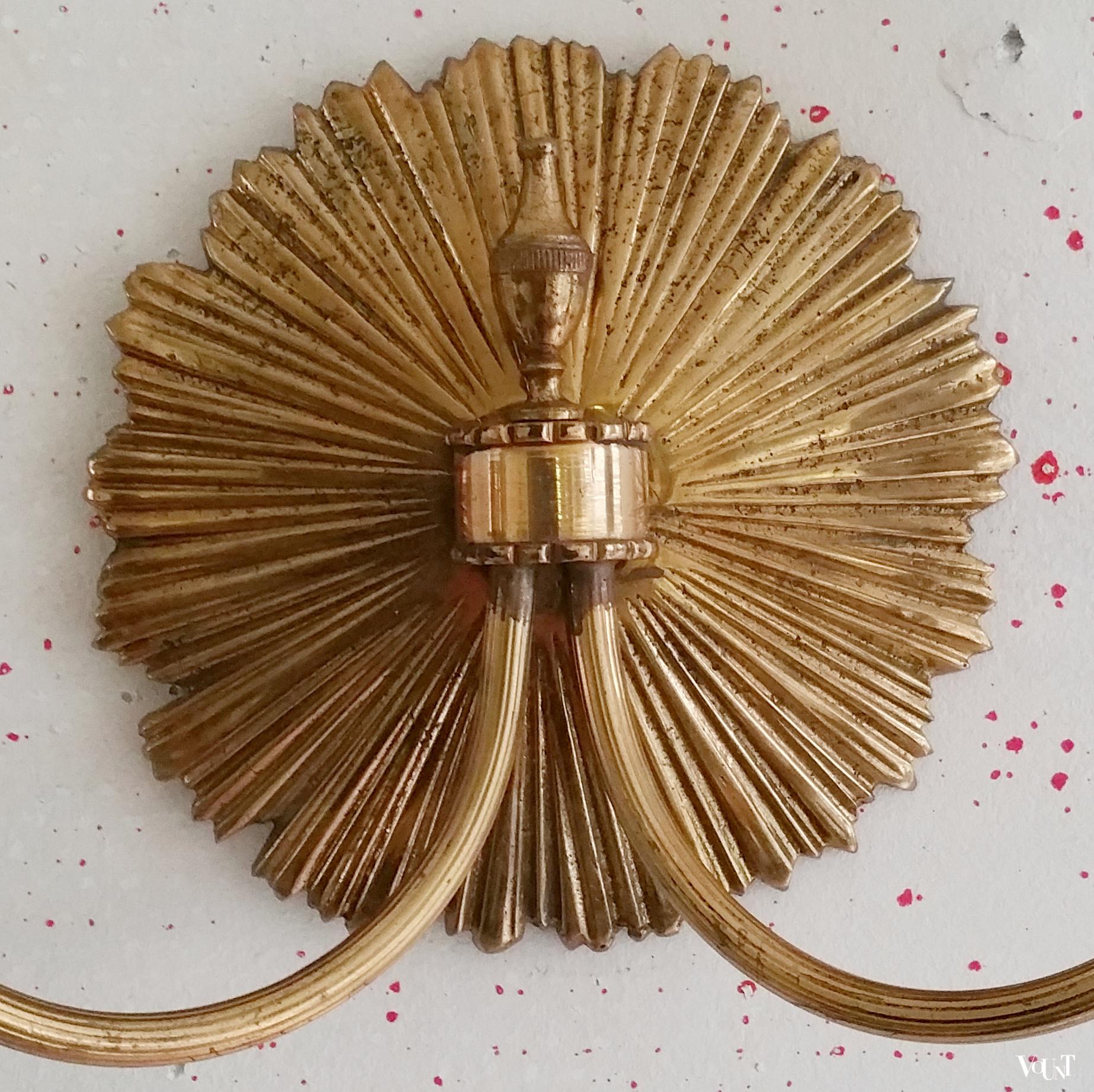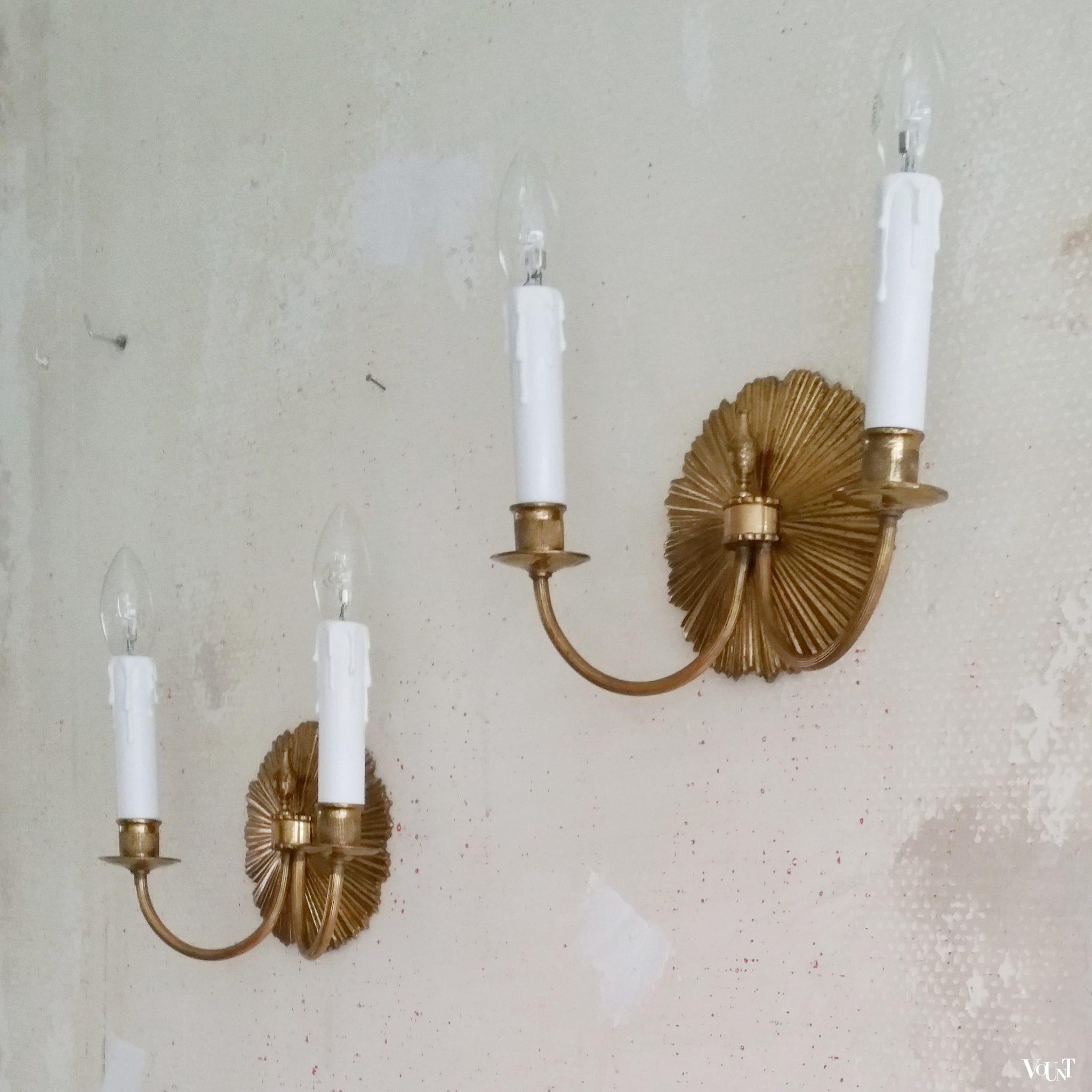 Mooie oude messing wandlampjes die met hun sunburst-motief weer helemaal bij de interieurtrends van nu passen. Voorzien van nieuwe bedrading en dus in werkende staat.