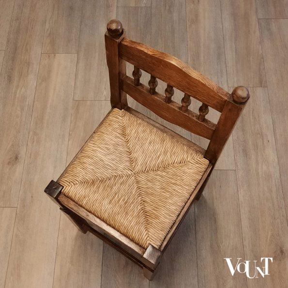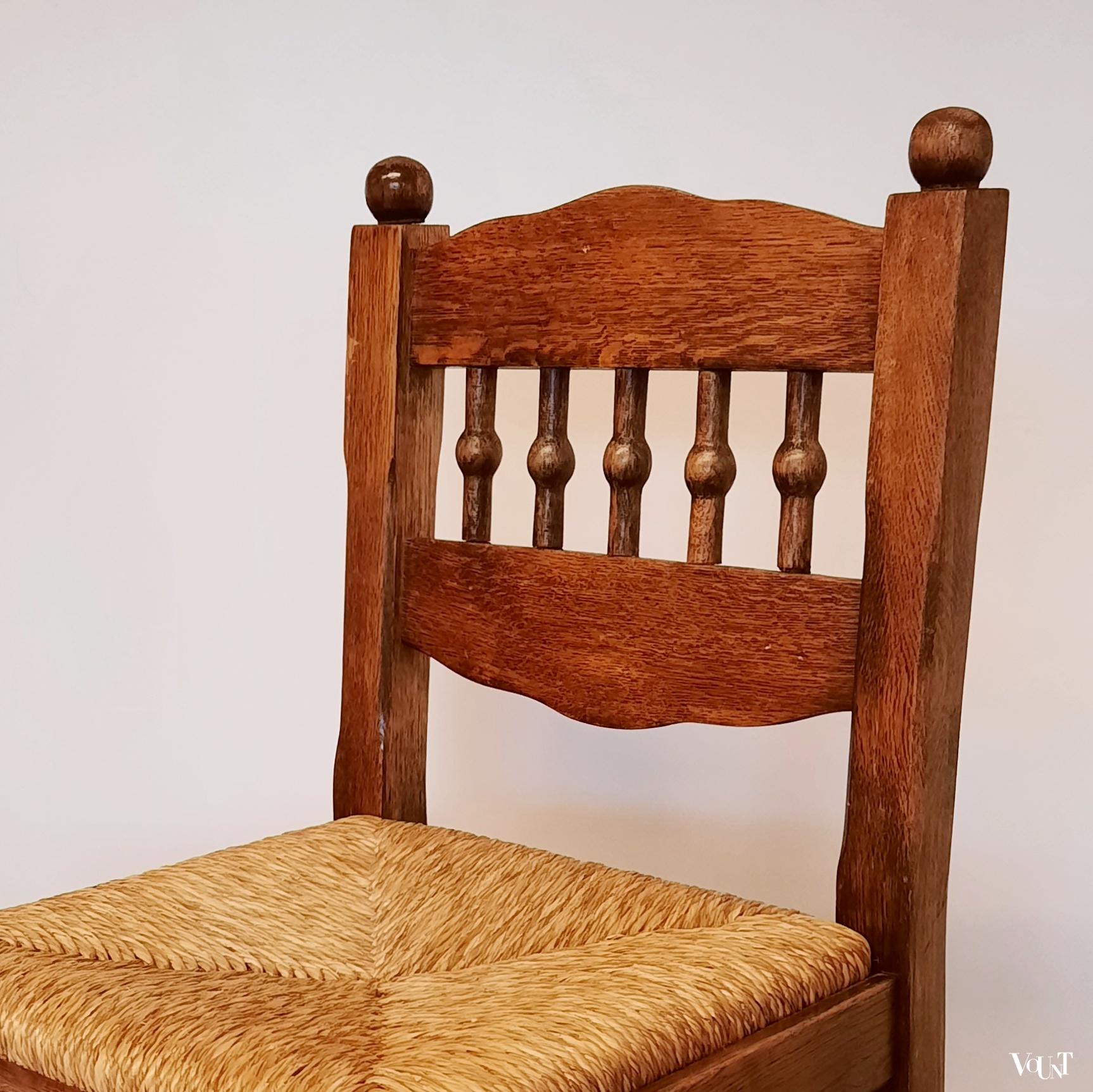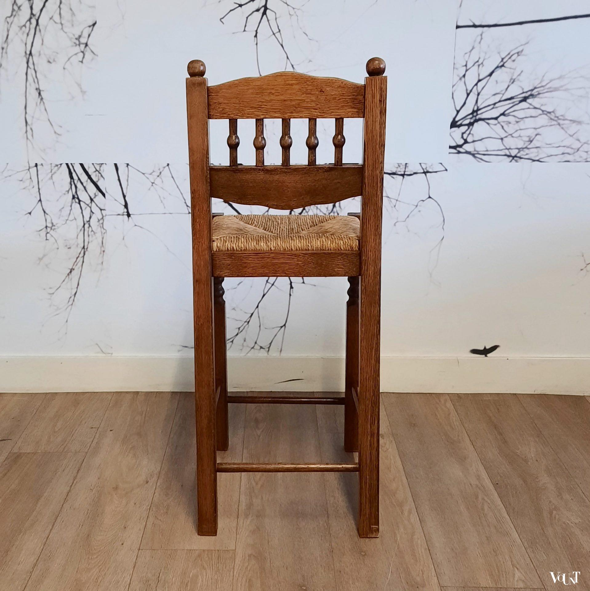 Deze jaren ’60/’70 eikenhouten barkrukken hebben een biezen zitting. De stijl doet Spaans aan, maar de krukken zijn waarschijnlijk afkomstig uit Roemenië. Beide krukken, hout en biezen, zijn in goede conditie met voor de leeftijd normale gebruikssporen.