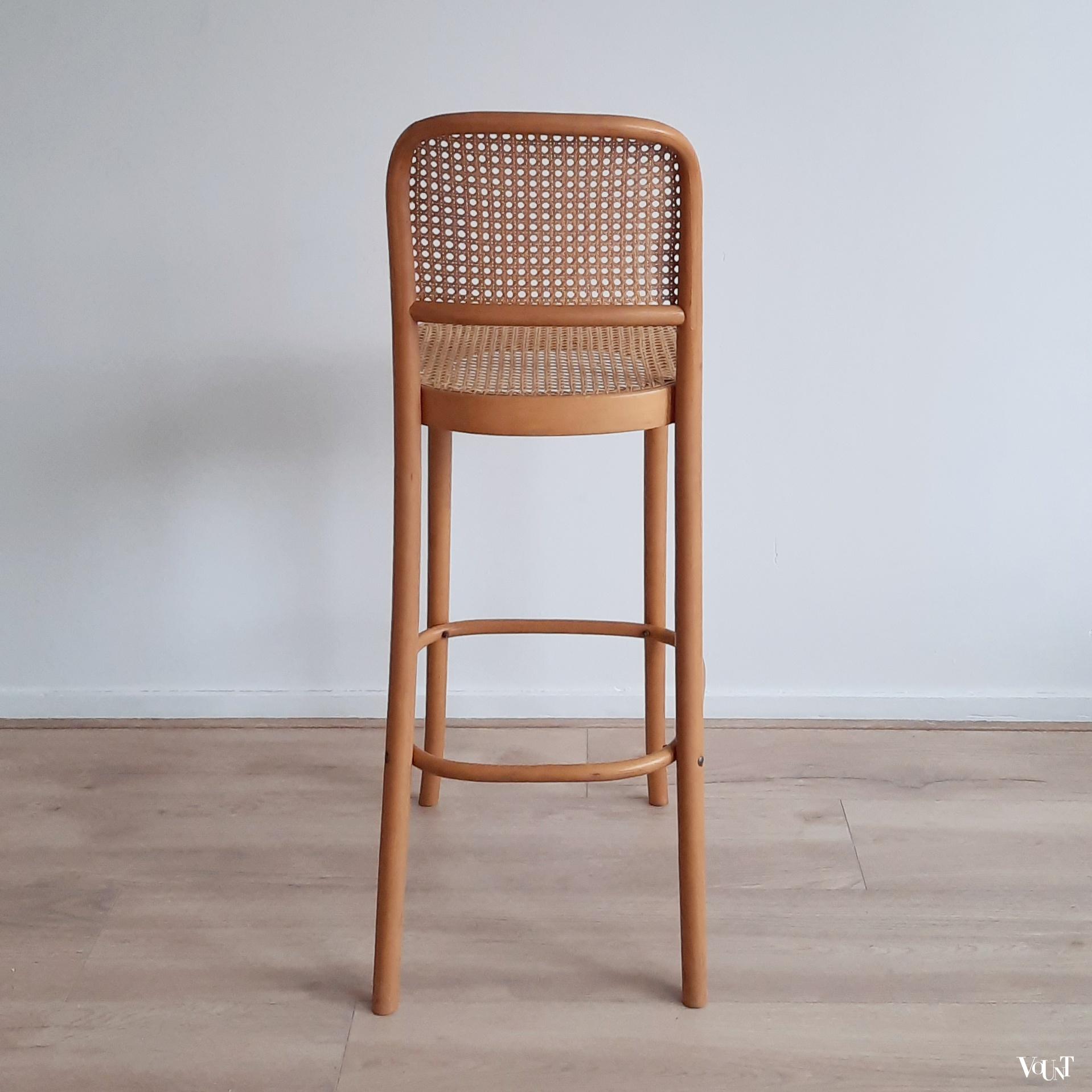 Het ontwerp van deze barkruk is gebaseerd op de Praag- of nr. 811 stoel van de Oostenrijkse architect/ontwerper Josef Hoffmann uit de jaren ’20 van de vorige eeuw. Deze set stoelen dateert uit de jaren ’70 en is gemaakt door FMG een voormalige, na W.O. II genationaliseerde Thonet-fabriek in Polen. De handgeweven rotan webbing van zittingen en rugleuningen is in goede conditie.