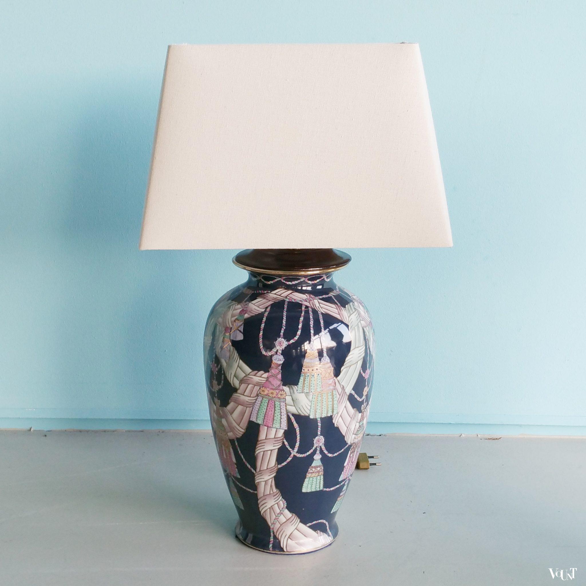 Volgens het stempel onder deze handbeschilderde vaaslampen (wij hebben hiervoor het blauwe vilt losgehaald) komen deze uit Macau (regio van China), waarschijnlijk jaren ’80. Ze zijn in goede, onbeschadigde conditie en in werkende staat. Om er een lamp van te maken zijn de vazen aan de bovenzijde voorzien van een gelakt houten afdekplaatje. De lampenkappen zijn nieuw.