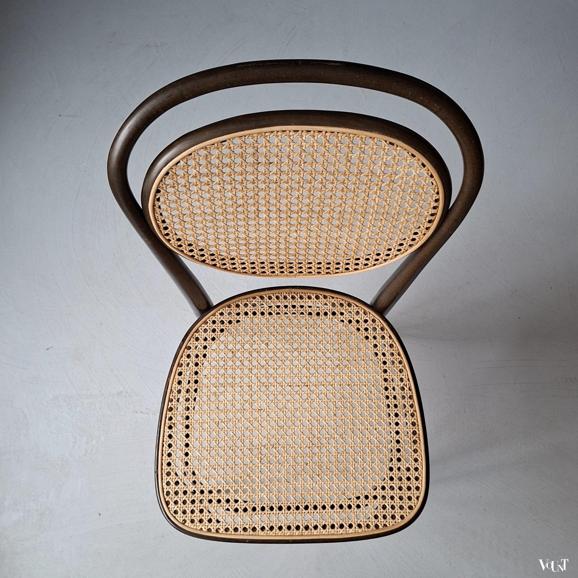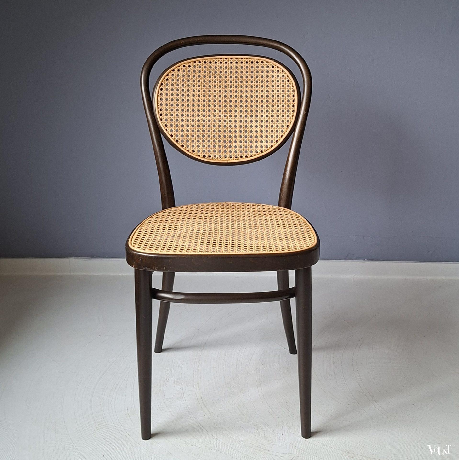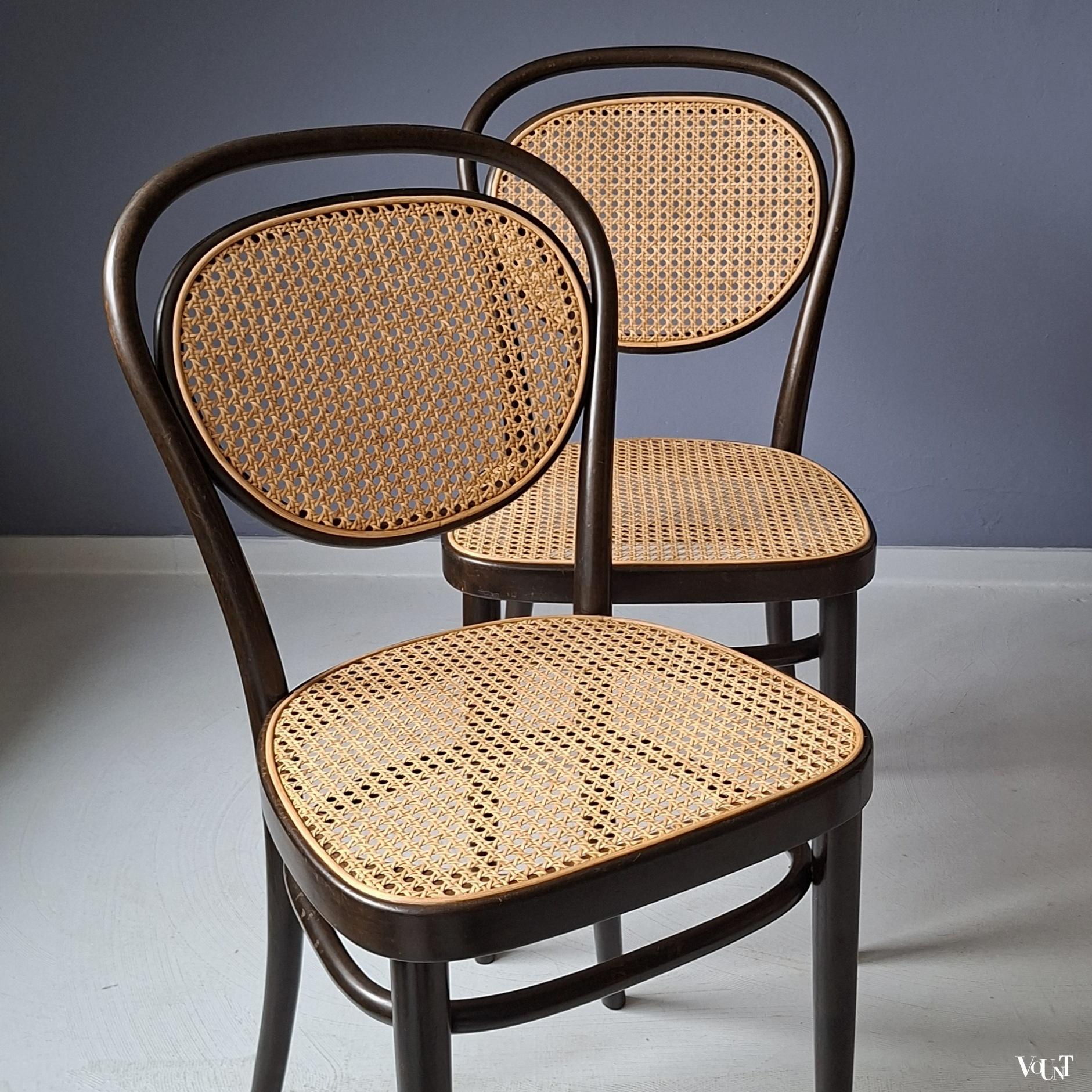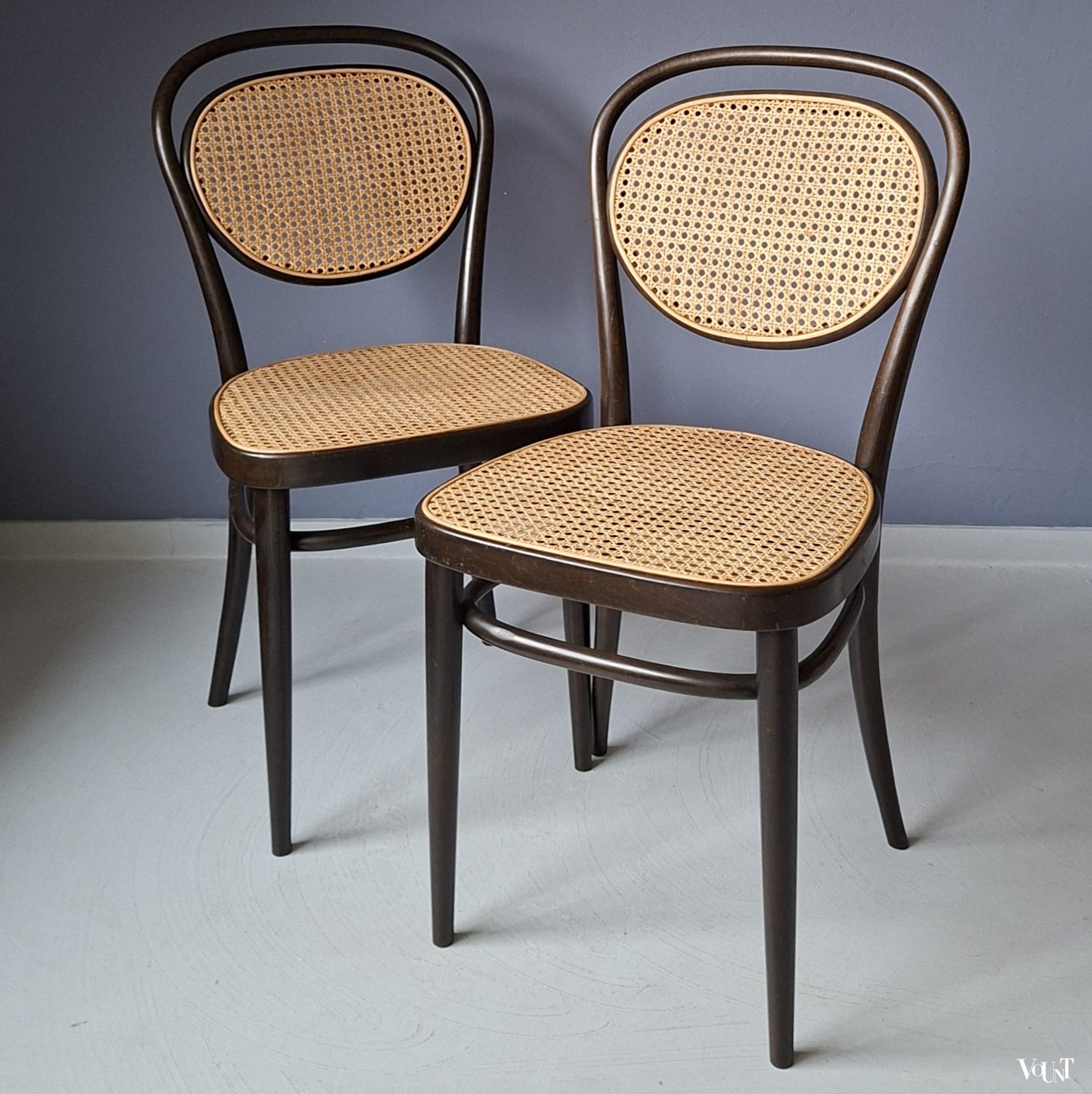 Deze set van 2 nr. 215 R (koffiehuis) stoelen (R staat voor de uitvoering zonder armleuningen) is in 1980 resp. 1981 geproduceerd door Thonet (Duitsland), zoals aangegeven onder de zitting. Kleur is donkerbruin. De stoel werd in 1859 ontworpen door Michael Thonet, de oprichter van Thonet. Beukenhouten frame en een rotan zitting en rugleuning. Daar waar nodig hebben wij de rotan zitting en/of rugleuning laten vervangen. De stoelen, hout en rotan, zijn dus in goede conditie. Normale gebruikssporen.