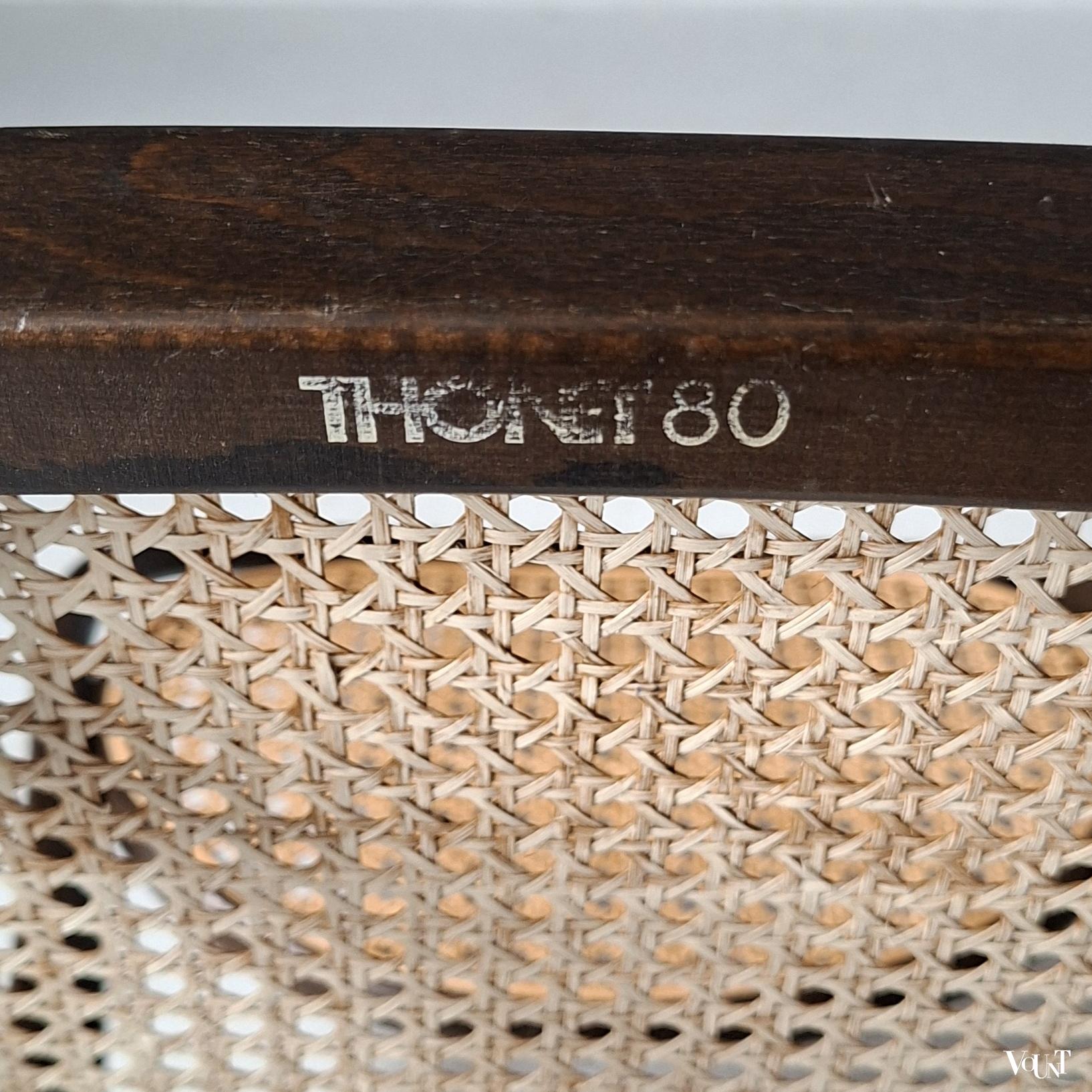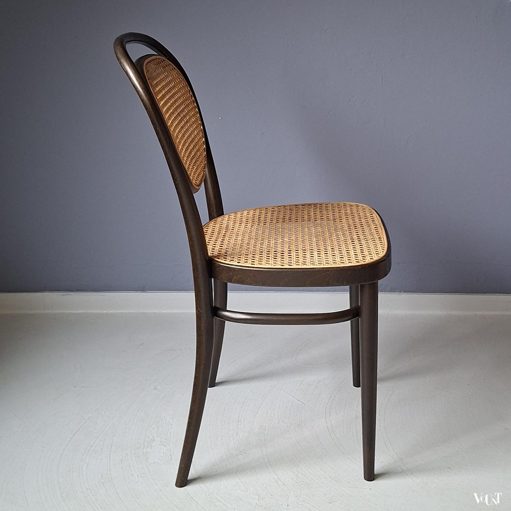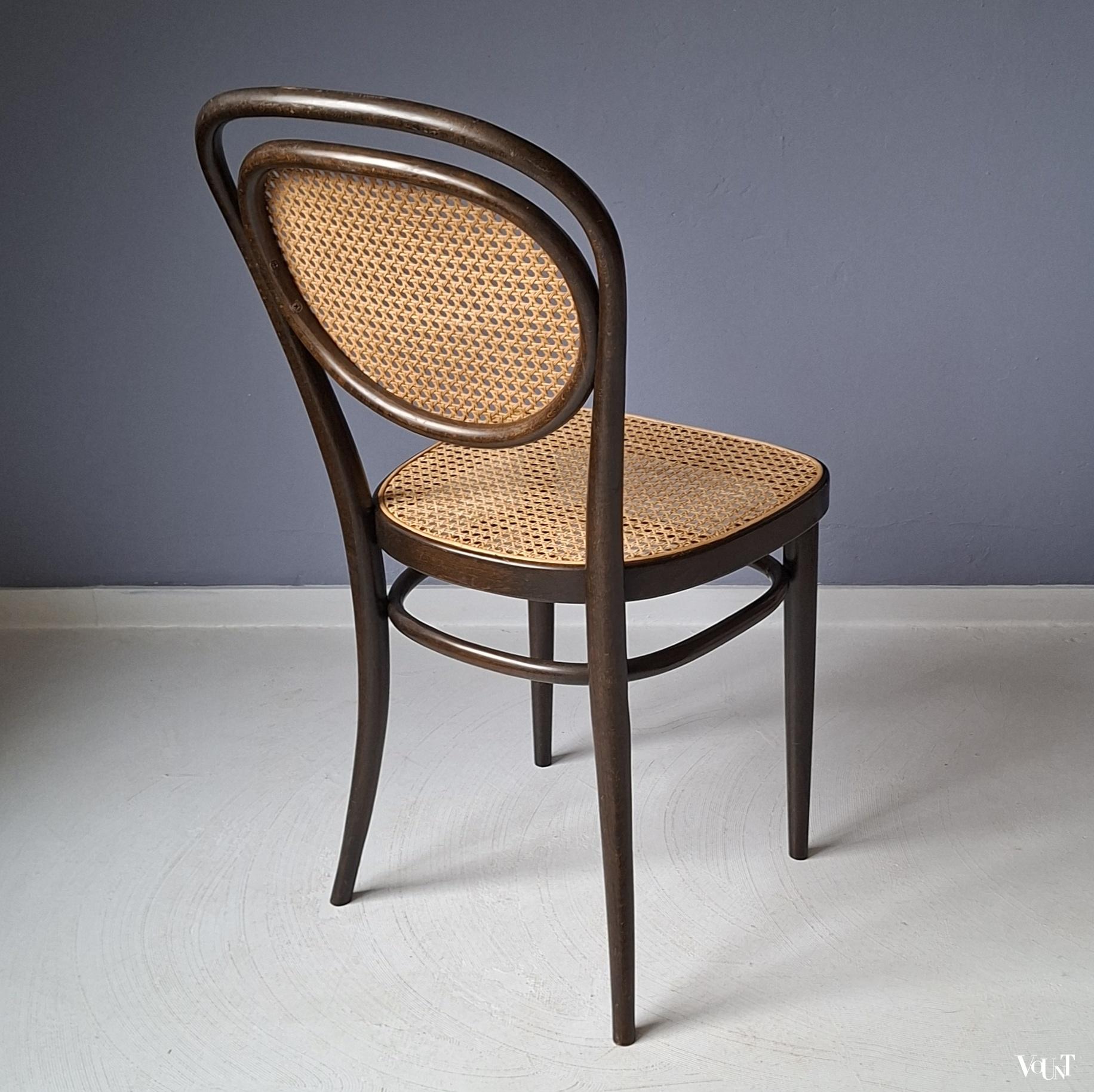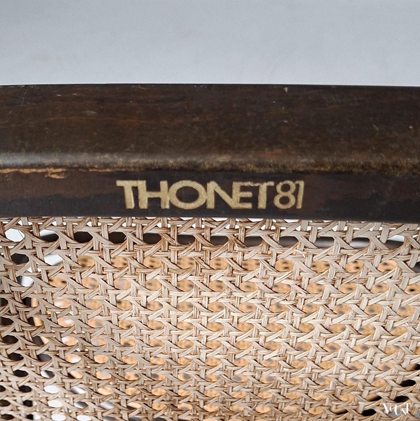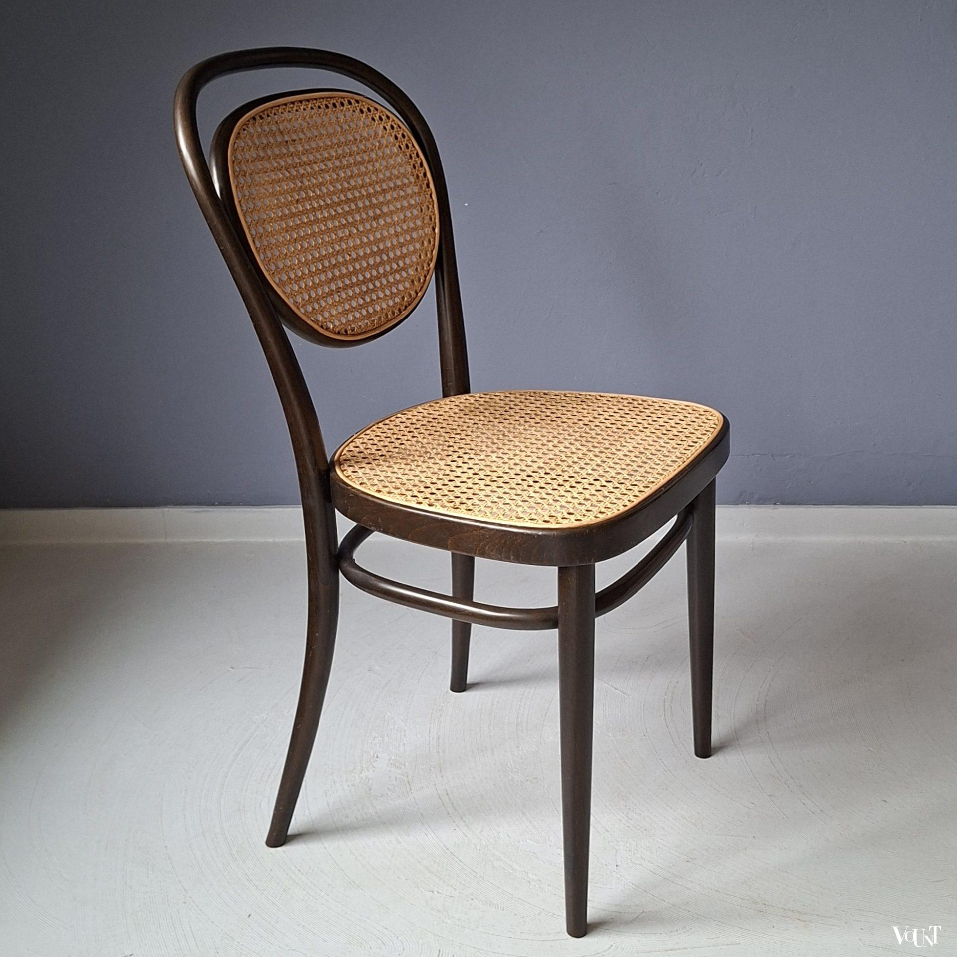 Deze set van 2 nr. 215 R (koffiehuis) stoelen (R staat voor de uitvoering zonder armleuningen) is in 1980 resp. 1981 geproduceerd door Thonet (Duitsland), zoals aangegeven onder de zitting. Kleur is donkerbruin. De stoel werd in 1859 ontworpen door Michael Thonet, de oprichter van Thonet. Beukenhouten frame en een rotan zitting en rugleuning. Daar waar nodig hebben wij de rotan zitting en/of rugleuning laten vervangen. De stoelen, hout en rotan, zijn dus in goede conditie. Normale gebruikssporen.