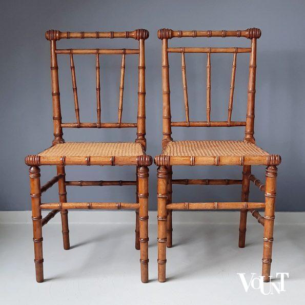 Set van 2 houten faux bamboo stoeltje van rond 1900. De stoeltjes hebben een met de hand geweven rotan zitting. Beide stoeltjes zijn zowel qua hout als rotan in heel goede conditie.