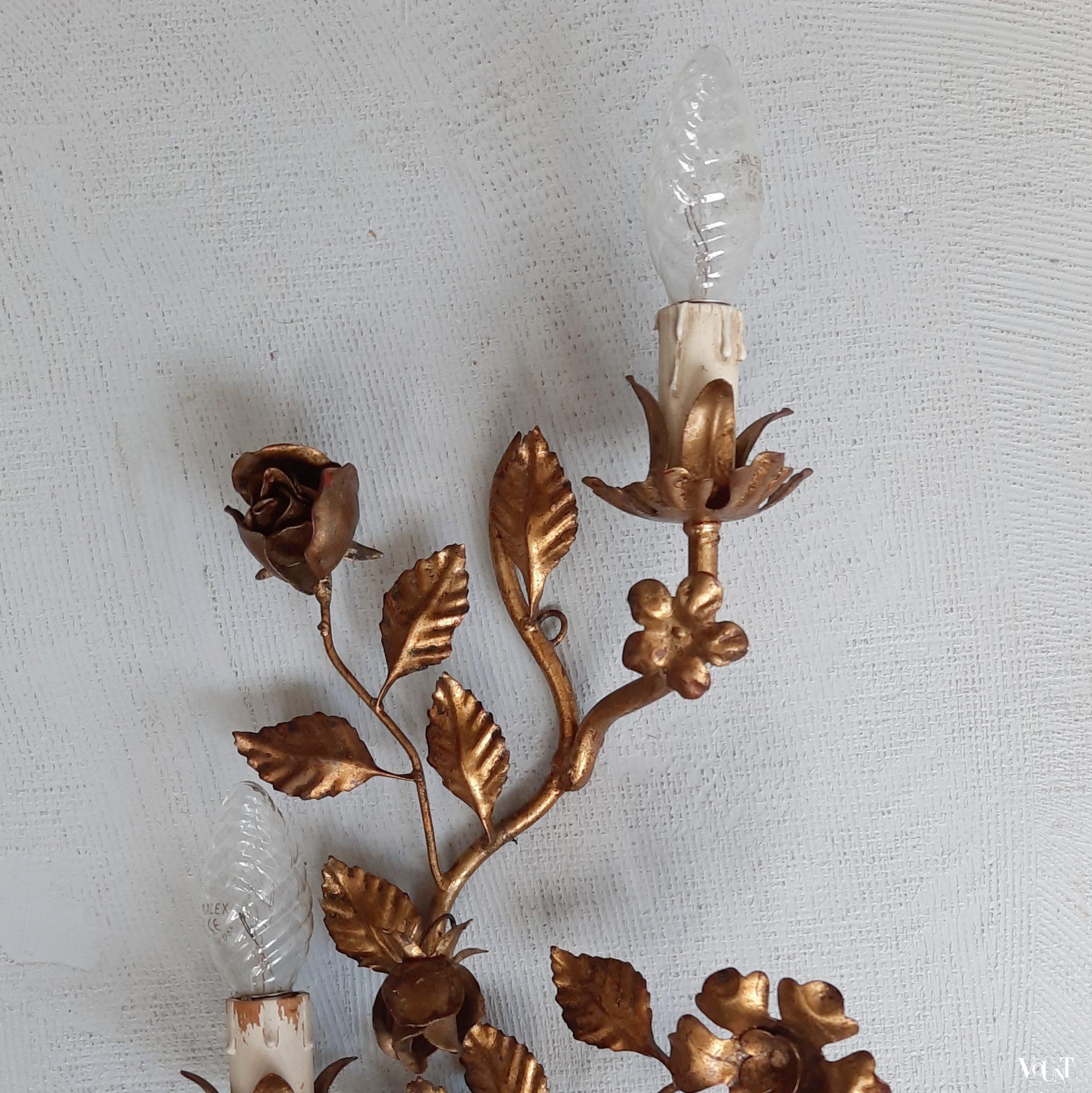 Deze set van 2 “gilt metal” wandlampjes met bladeren en bloemen uit de jaren ’60 is in goede, werkende conditie. Nieuwe bedrading en fittingen. Houten kaarsen. Deze hebben wat slijtagesporen en kunnen, indien gewenst, gemakkelijk door andere vervangen worden. Aan de achterzijde zijn de lampjes voorzien van een oog om deze op te hangen (zie laatste foto voor achterzijde lampen).