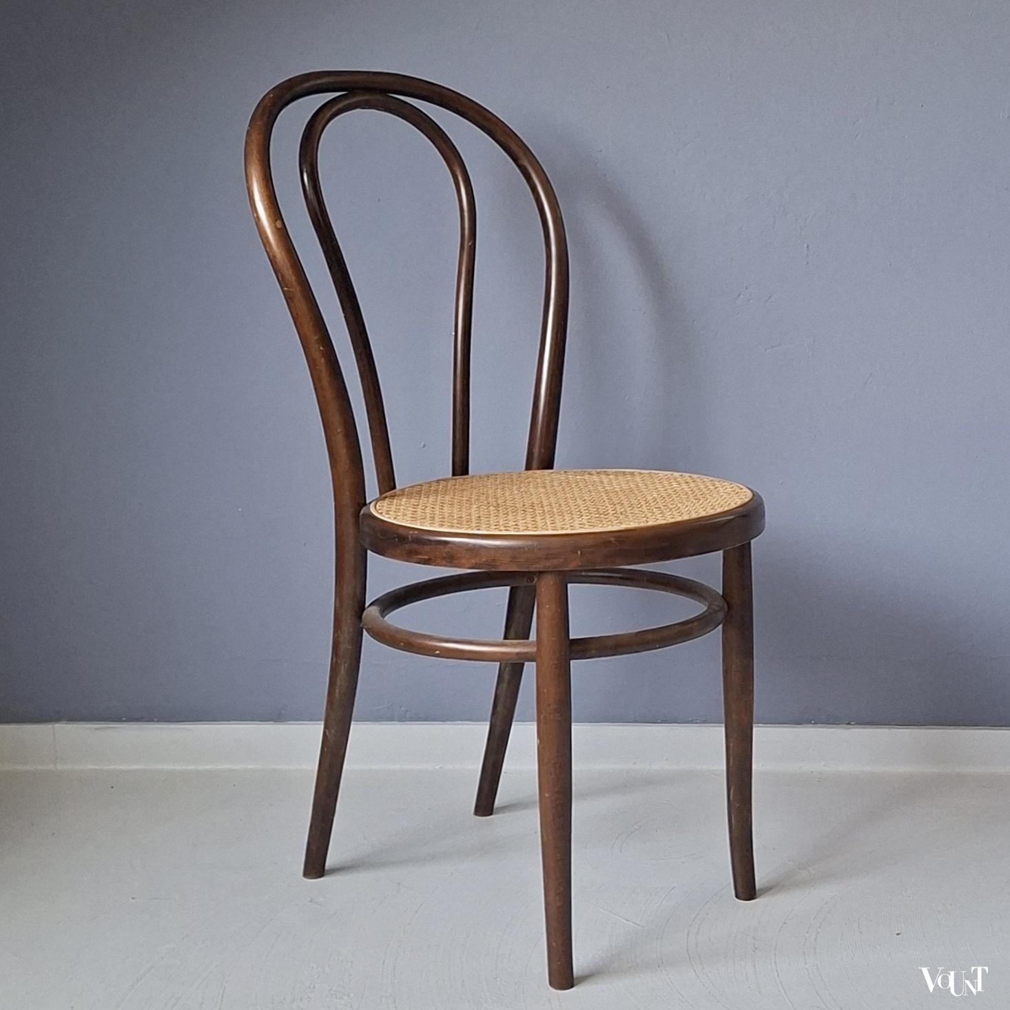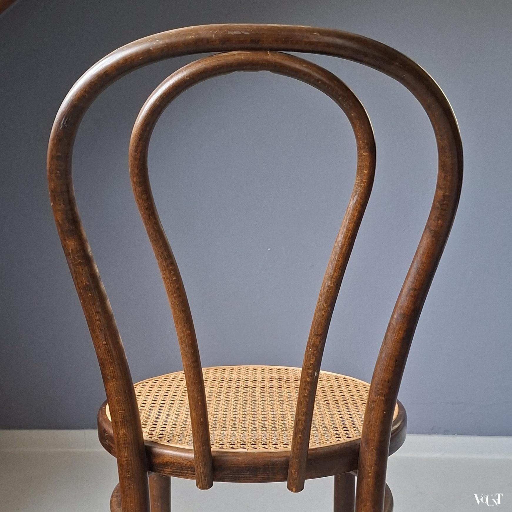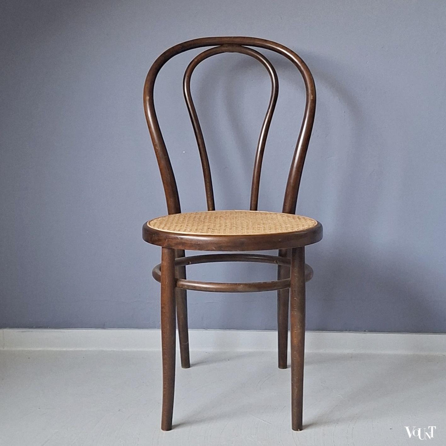 Stoel nr. 18 (ook wel bistrostoel genoemd) werd rond 1875 ontworpen door Gebrüder Thonet (Wenen) en was naast nr. 14 (die een “halve binnenboog” heeft in de rugleuning) een van de populairste stoelen van Thonet. Deze set stoelen is geproduceerd door ZPM Radomsko of FMG in Polen, voormalige na W.O. II genationaliseerde Thonet-fabrieken. In goede conditie. Voor leeftijd en gebruik normale, lichte gebruikssporen. Beide stoelen hebben een nieuwe (2026) rotan zitting.
