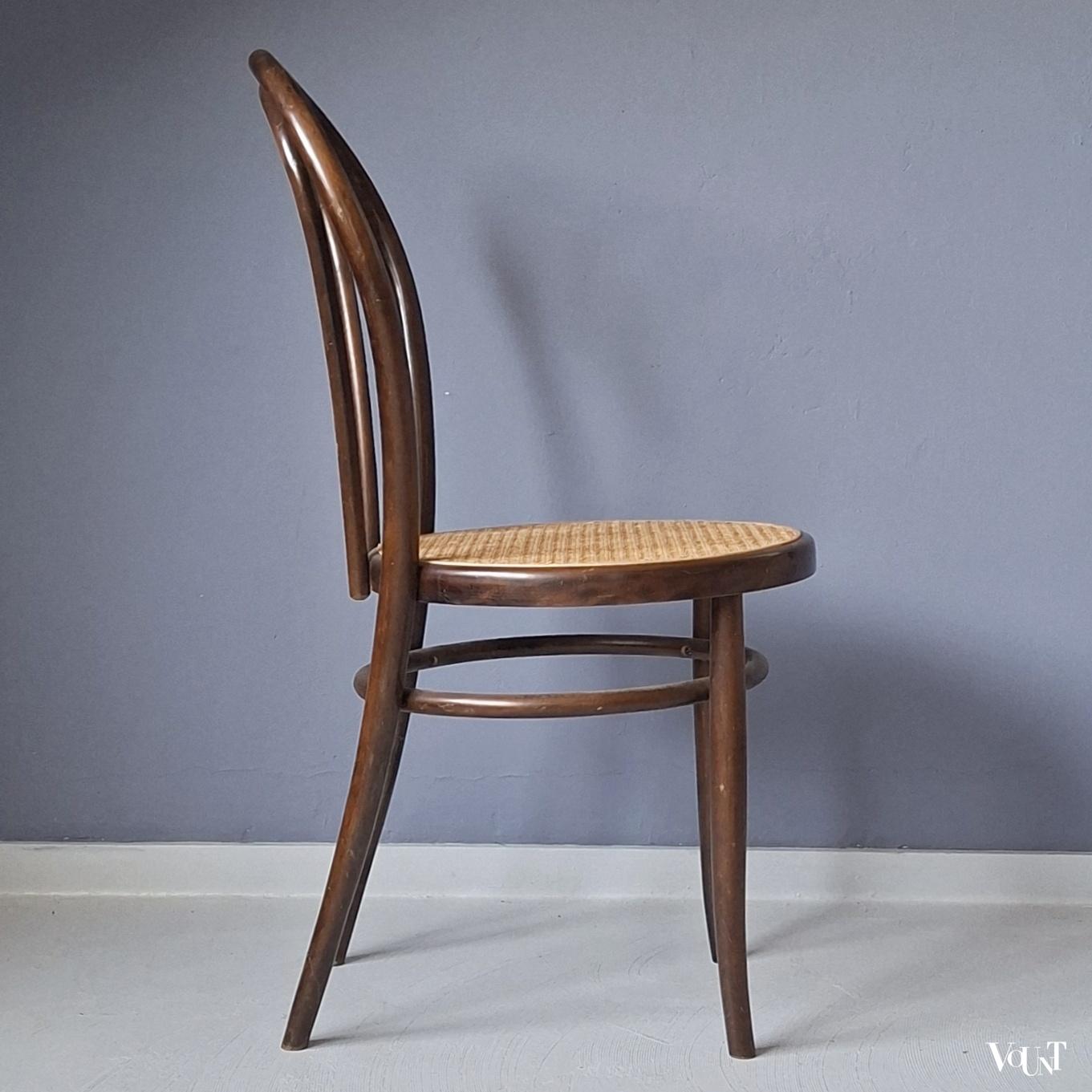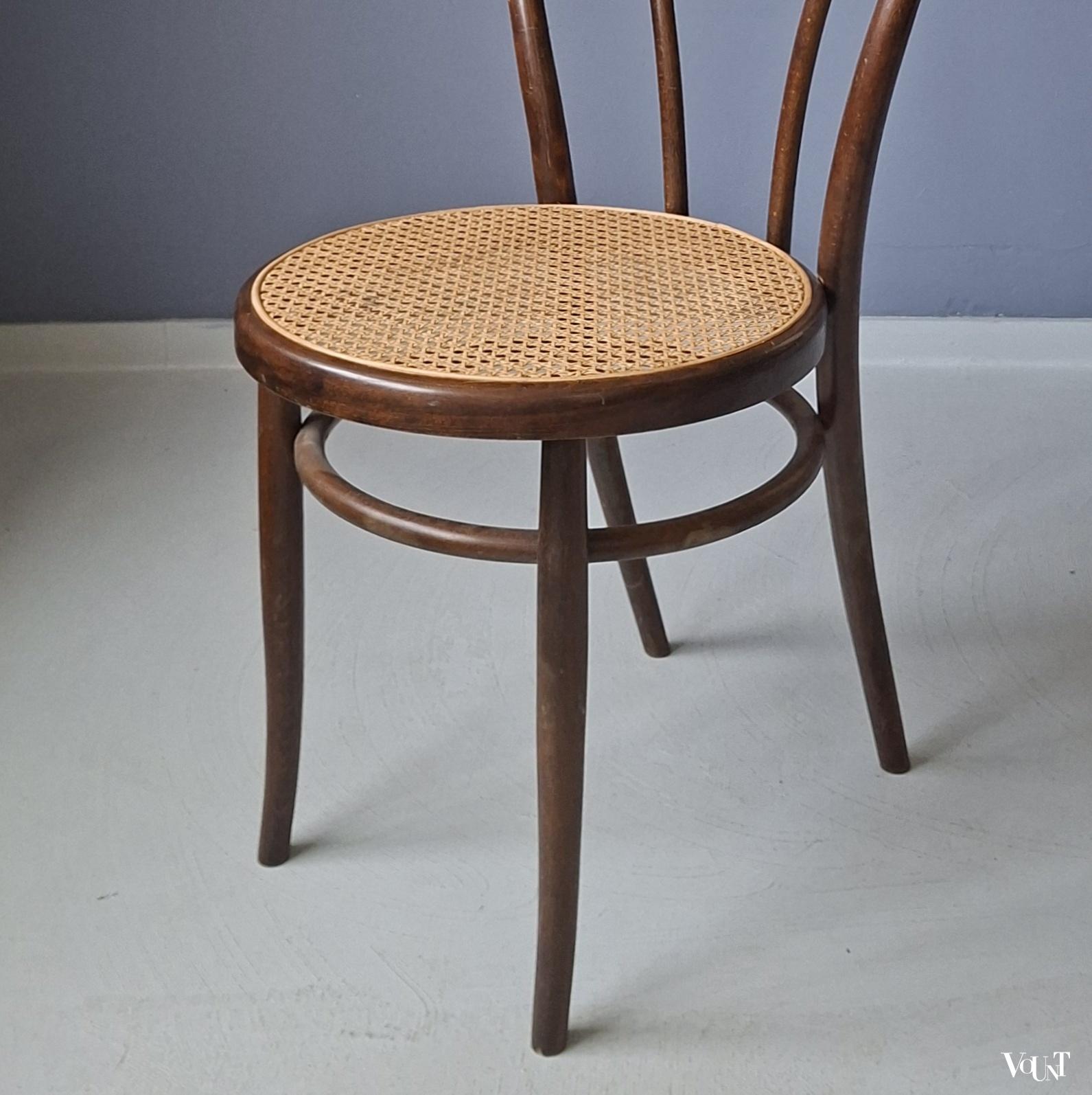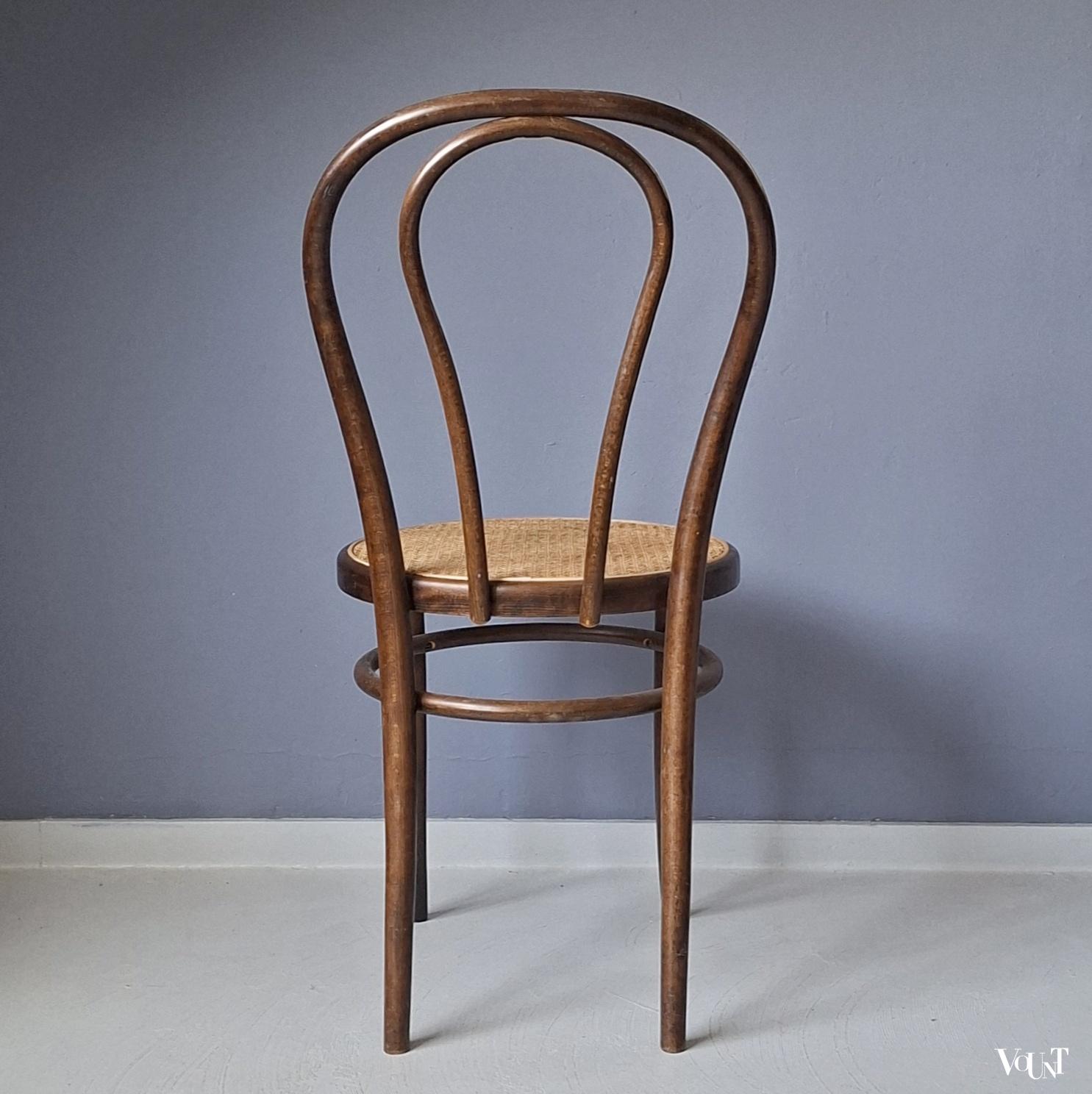 Stoel nr. 18 (ook wel bistrostoel genoemd) werd rond 1875 ontworpen door Gebrüder Thonet (Wenen) en was naast nr. 14 (die een “halve binnenboog” heeft in de rugleuning) een van de populairste stoelen van Thonet. Deze set stoelen is geproduceerd door ZPM Radomsko of FMG in Polen, voormalige na W.O. II genationaliseerde Thonet-fabrieken. In goede conditie. Voor leeftijd en gebruik normale, lichte gebruikssporen. Beide stoelen hebben een nieuwe (2026) rotan zitting.