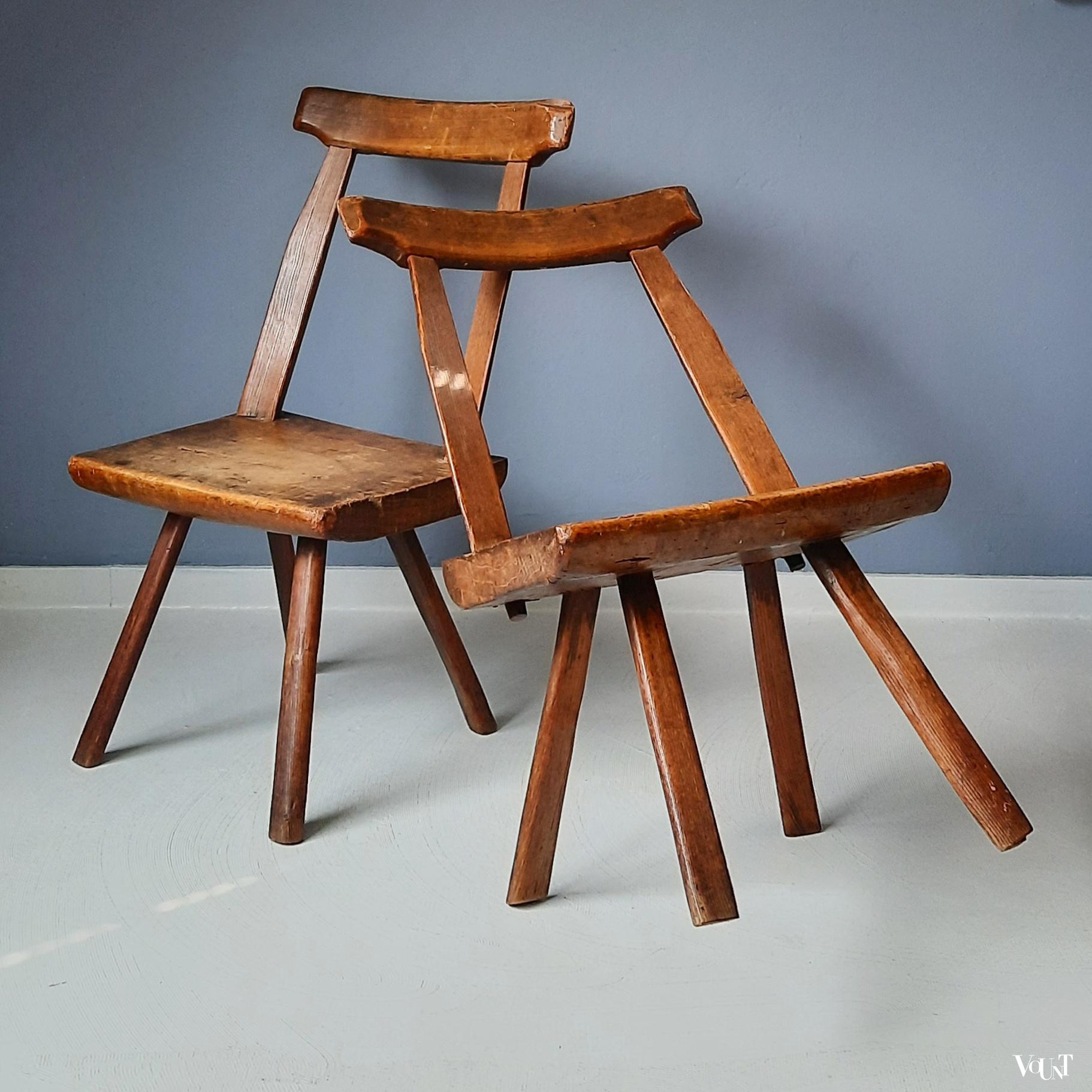 Precieze herkomst van deze 2 Afrikaanse stoeltjes vooralsnog niet bekend. Mooier geleefd kan je ze haast niet krijgen. Leefijd- en gebruiksgerelateerde slijtage- en oude houtwormsporen, maar constructief in orde en stevig. Datering 1e helft 20e eeuw, mogelijk ook iets vroeger. Ook bijzonder omdat het een set van 2 is. Evenals in de jaren ’50/’60 populair in een modern/eclectisch interieur. Wellicht was het ontwerp van deze stoelen een voorbeeld voor modernistische/brutalist meubels van bijvoorbeeld Mobichalet (België, jaren ’50).