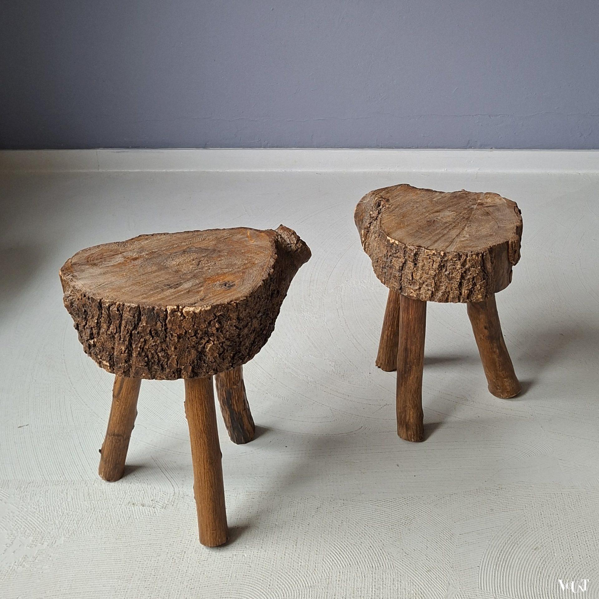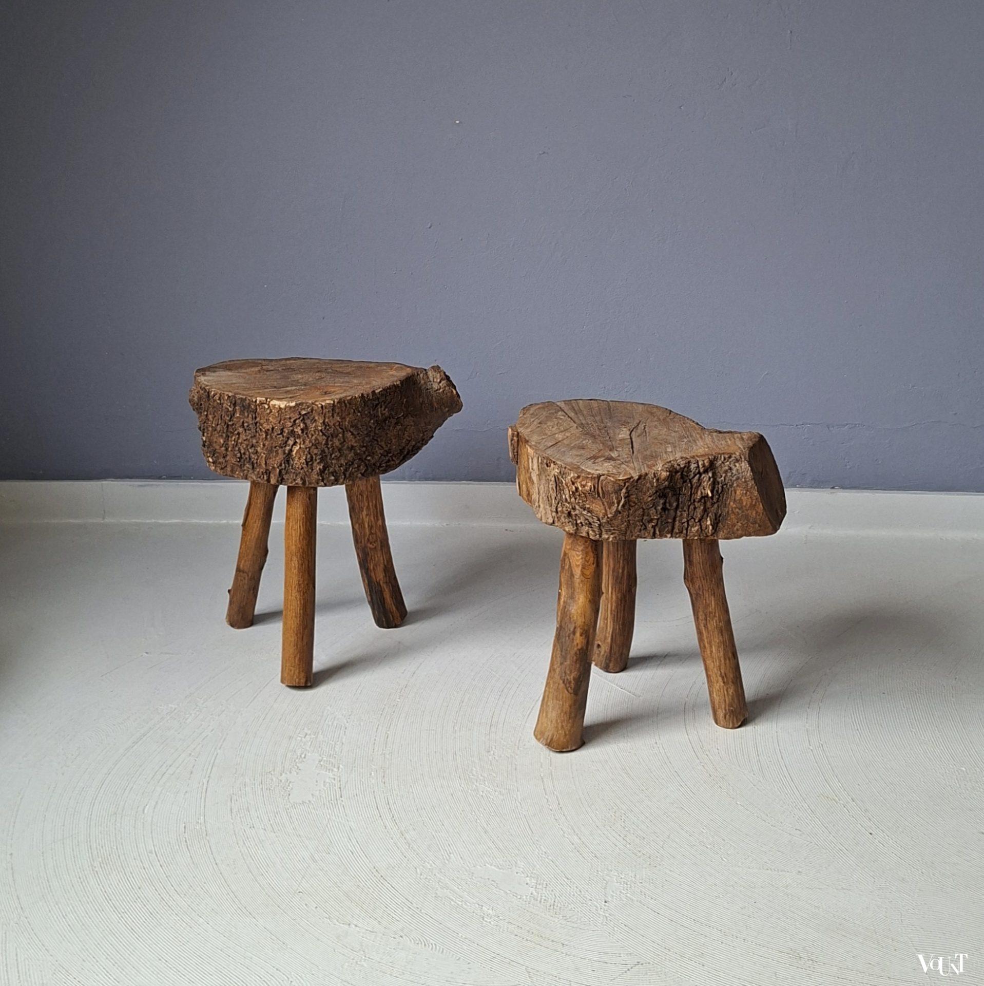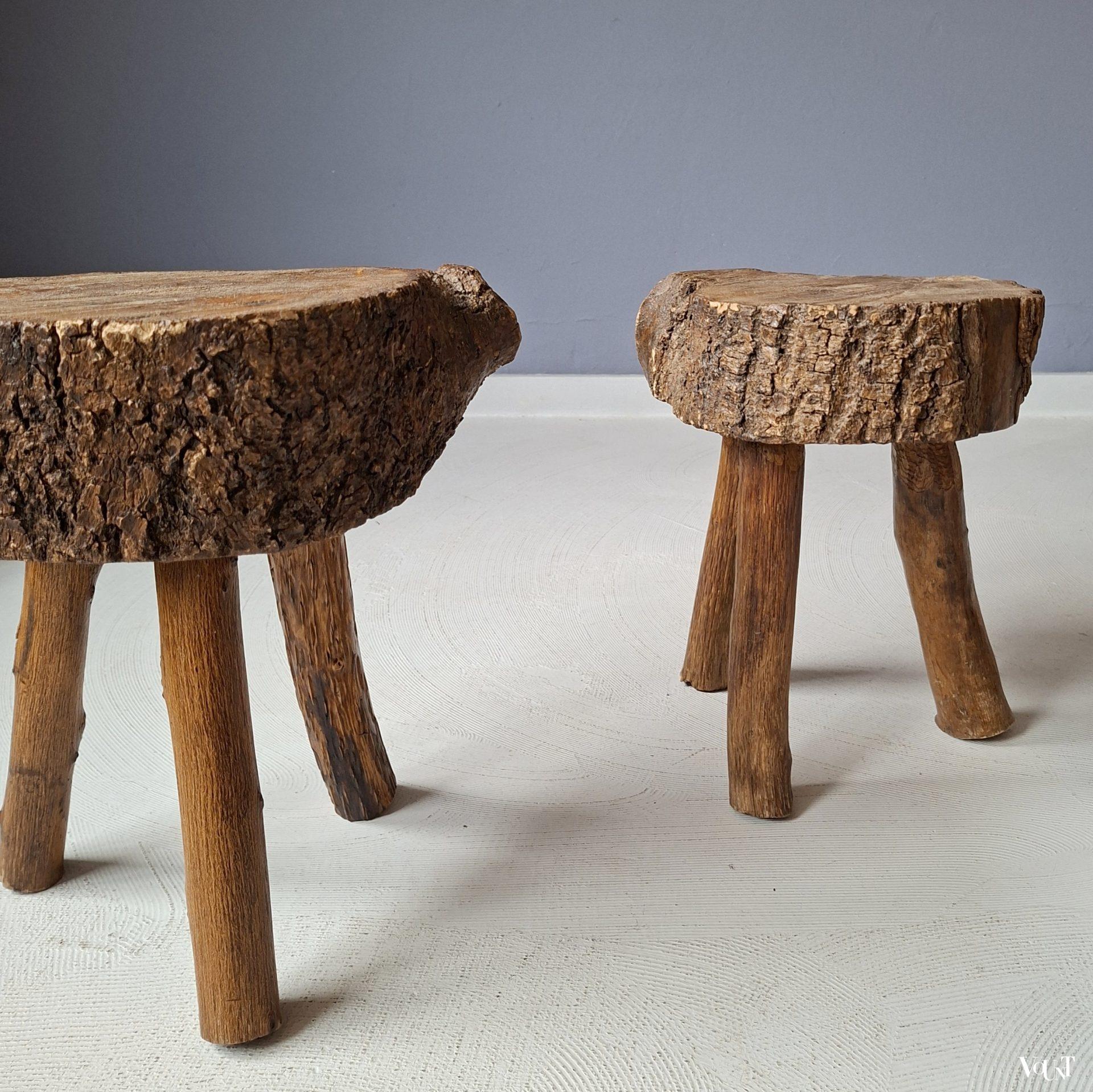 Set van 2 oude Franse boomstamtafeltjes/-krukjes