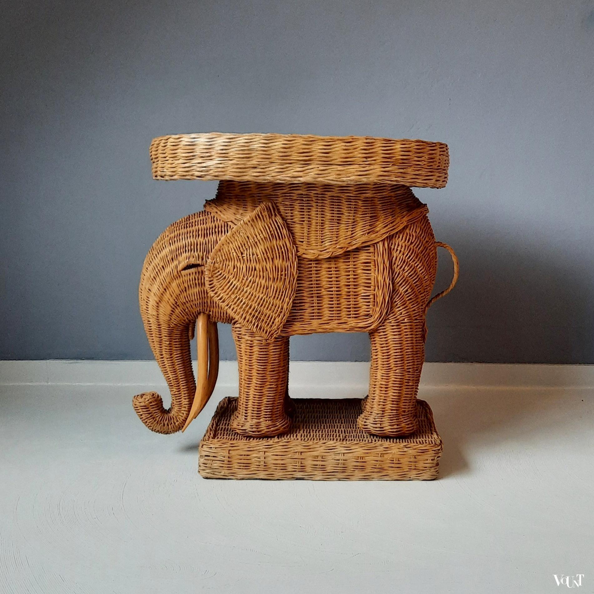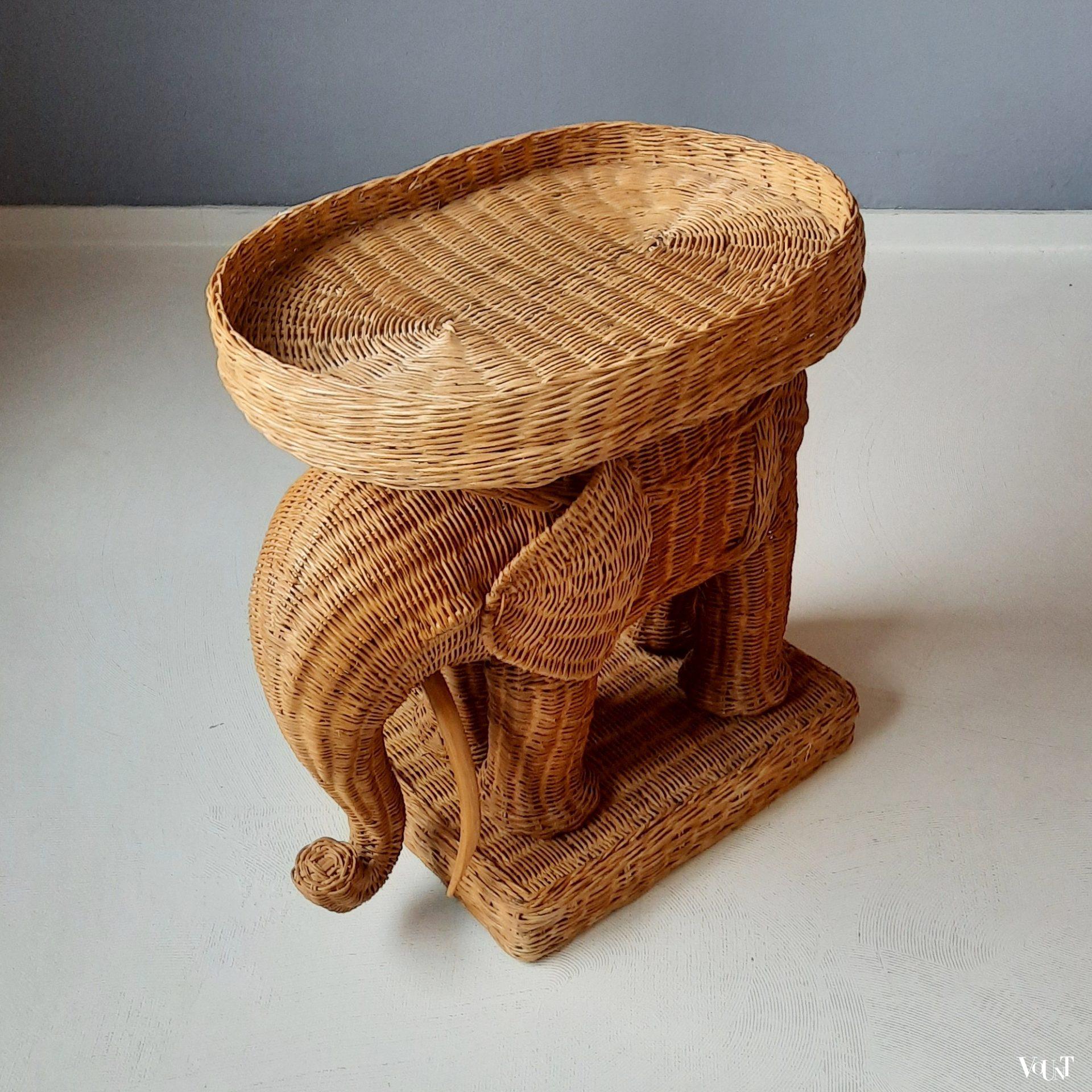 Deze set van 2 rotan bijzettafels in de vorm van olifanten is in goede vintage-conditie. Voor de leeftijd normale gebruiks- en ouderdomssporen.