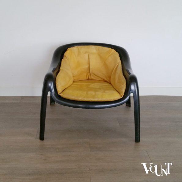 Bijzondere set van 2 zwarte space age fiberglas fauteuils met gele leren kussens.  Deze worden ook wel toegeschreven aan de Italiaans designer en mede-oprichter van Artemide, Sergio Mazza. De stoelen zijn nog helemaal in originele staat en hebben voor de leeftijd normale gebruikssporen: het fiberglas heeft wat krassen, maar geen ernstige beschadigingen; de leren kussens hebben craquelé. Imposante stoelen. Goede, zware kwaliteit.