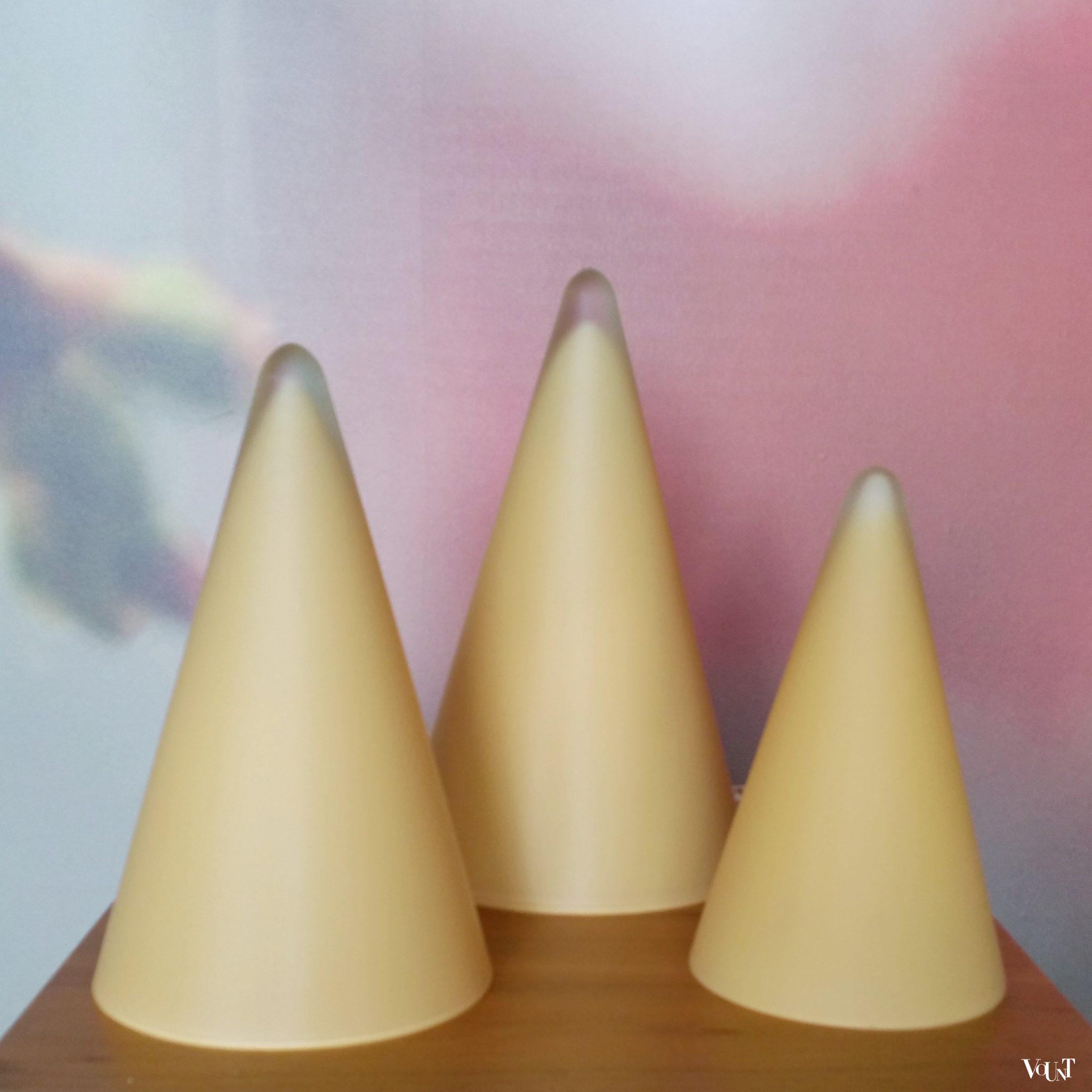 Deze geel glazen set lampen in tipi-vorm komt uit Frankrijk (SCE, sinds 1953). Individueel voorzien van draad met schakelaar. In goede conditie (geen chips o.i.d.). De lampen geven mooi warm licht. Deze gele editie van de lamp kom je minder vaak tegen. Alle drie gemerkt met sticker aan de binnenkant van de lamp.