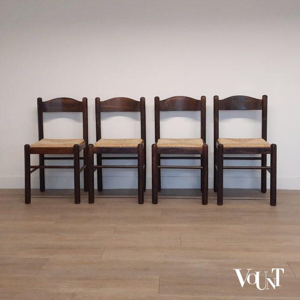 Set van 4 donkerbruine houten stoelen met biezen zitting, jaren ’70