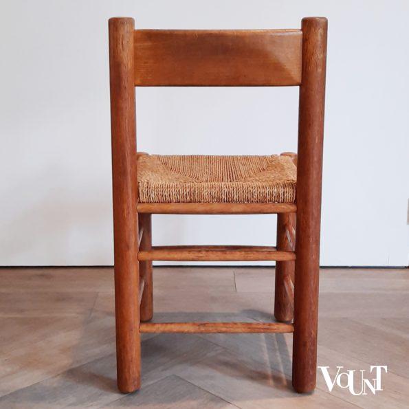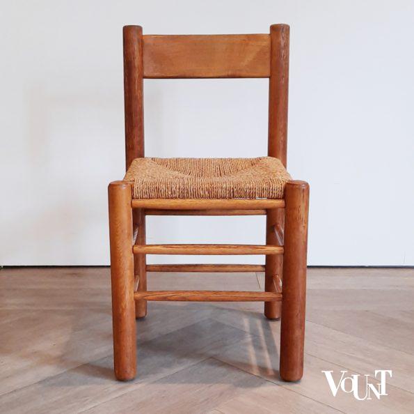 Deze stoelen zijn zeker 60 jaar oud en zullen nog weer 60 jaar meegaan. Gemaakt van eikenhout, met een zitting van touw. Zitten heel comfortabel. Doen qua stijl denken aan de Meribel-stoelen van Charlotte Perriand uit de jaren ’50. In goede conditie. Zittingen intact. Voor de leeftijd normale gebruikssporen.
