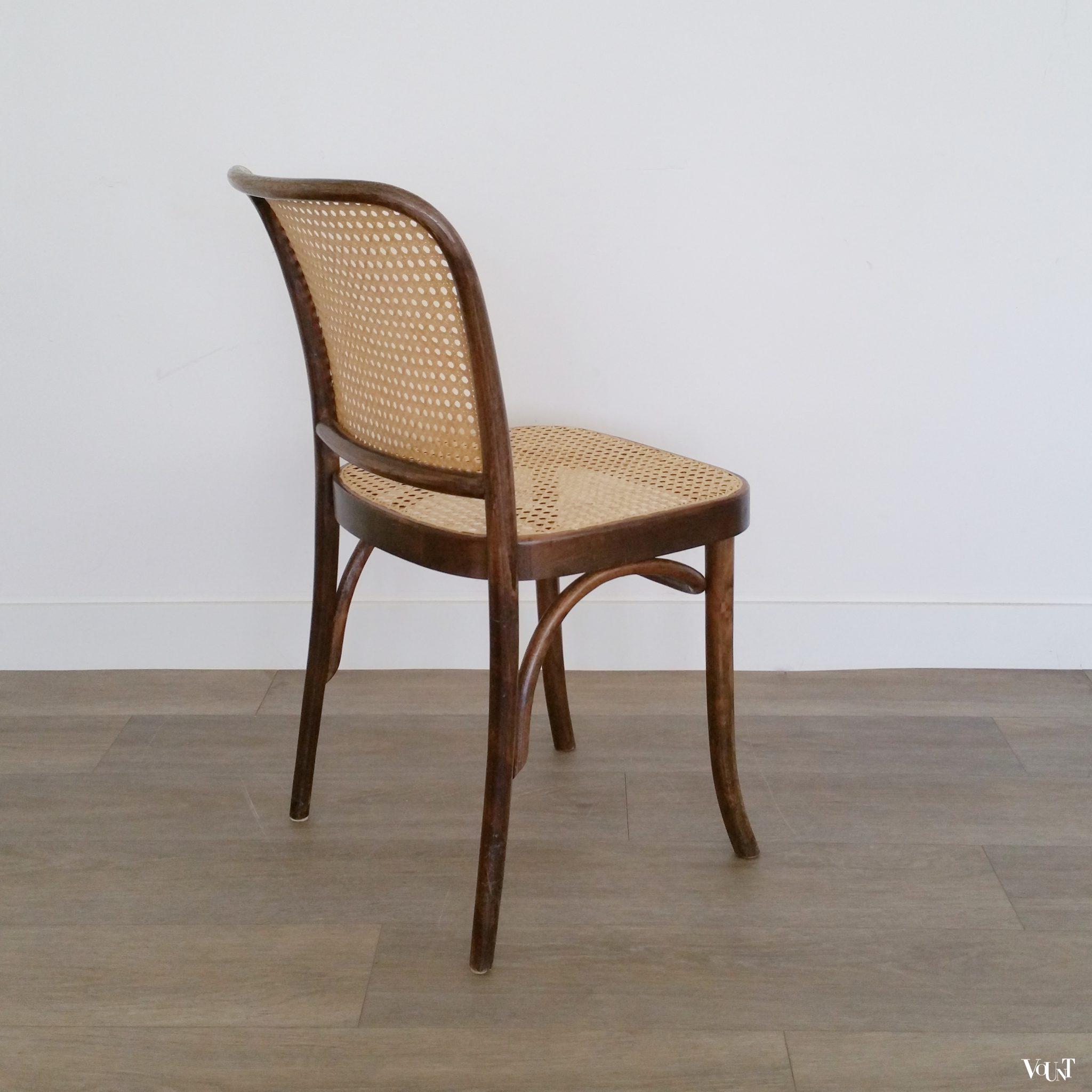 Het ontwerp van deze Praag of 811 stoel is van de Oostenrijker Josef Hoffmann, die de stoel in de jaren ’20 heeft ontworpen voor Thonet. Tijdloos design: de stoel was zowel in de jaren ’30 als in de jaren ’50/’60 populair (onder anderen onder architecten) en is ook nu weer erg gewild. Deze stoelen zijn gemaakt door FMG (volgens Thonet overigens zonder licentie), een voormalige Thonet-fabriek in Polen die is genationaliseerd na de 2e Wereldoorlog. 2 van de 4 stoelen hebben een nieuwe handgeweven rotan webbing. In goede conditie.