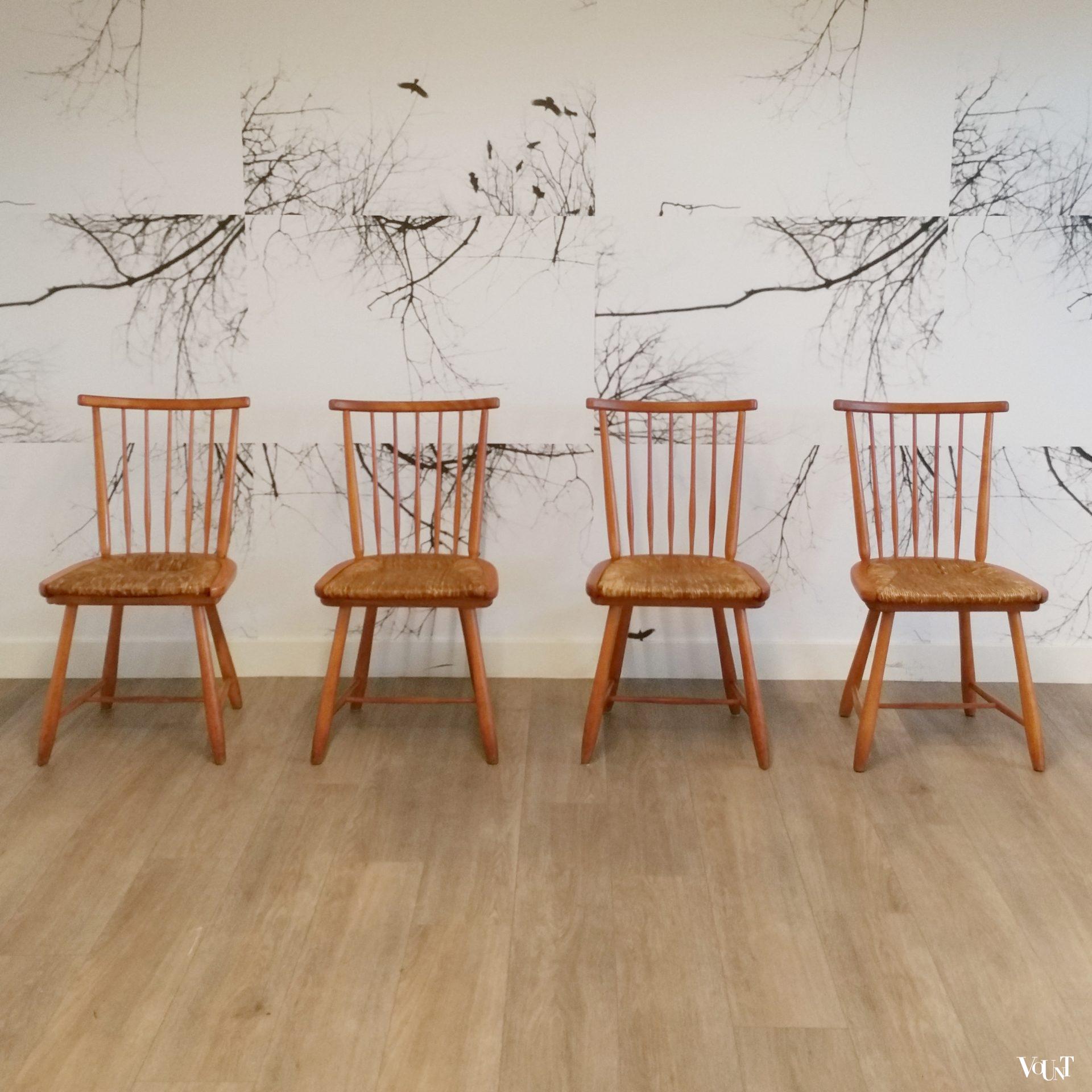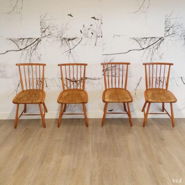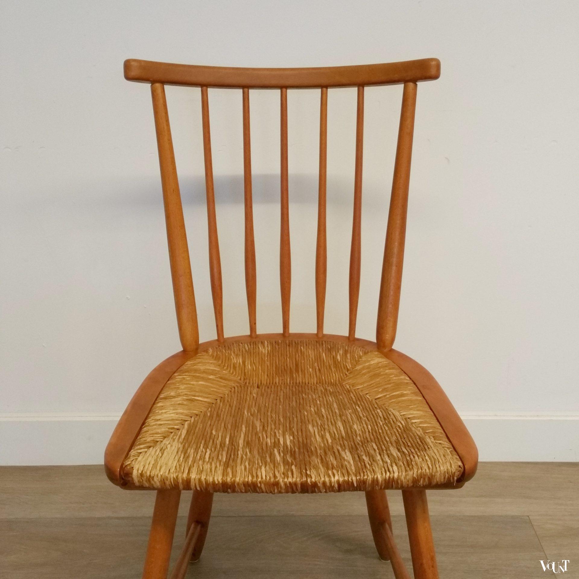 Deze stoelen zijn een ontwerp uit de jaren ’50 van de Duitse architect/designer Arno Lambrecht voor het eveneens Duitse WK Möbel (1912 opgericht, tegenwoordig WK Wohnen). De stoelen bestaan uit een beukenhouten frame en een biezen zitting. In goede conditie.