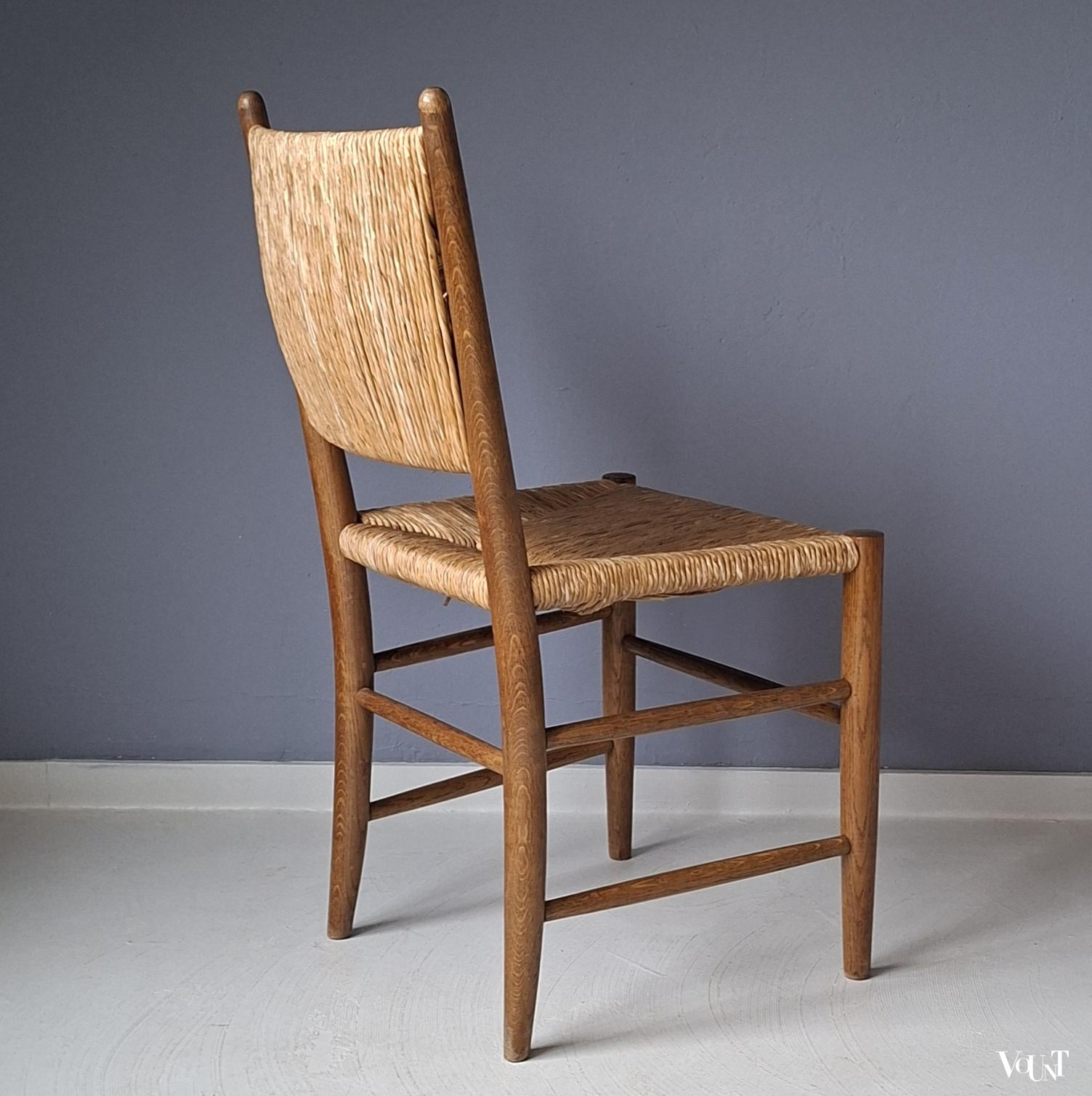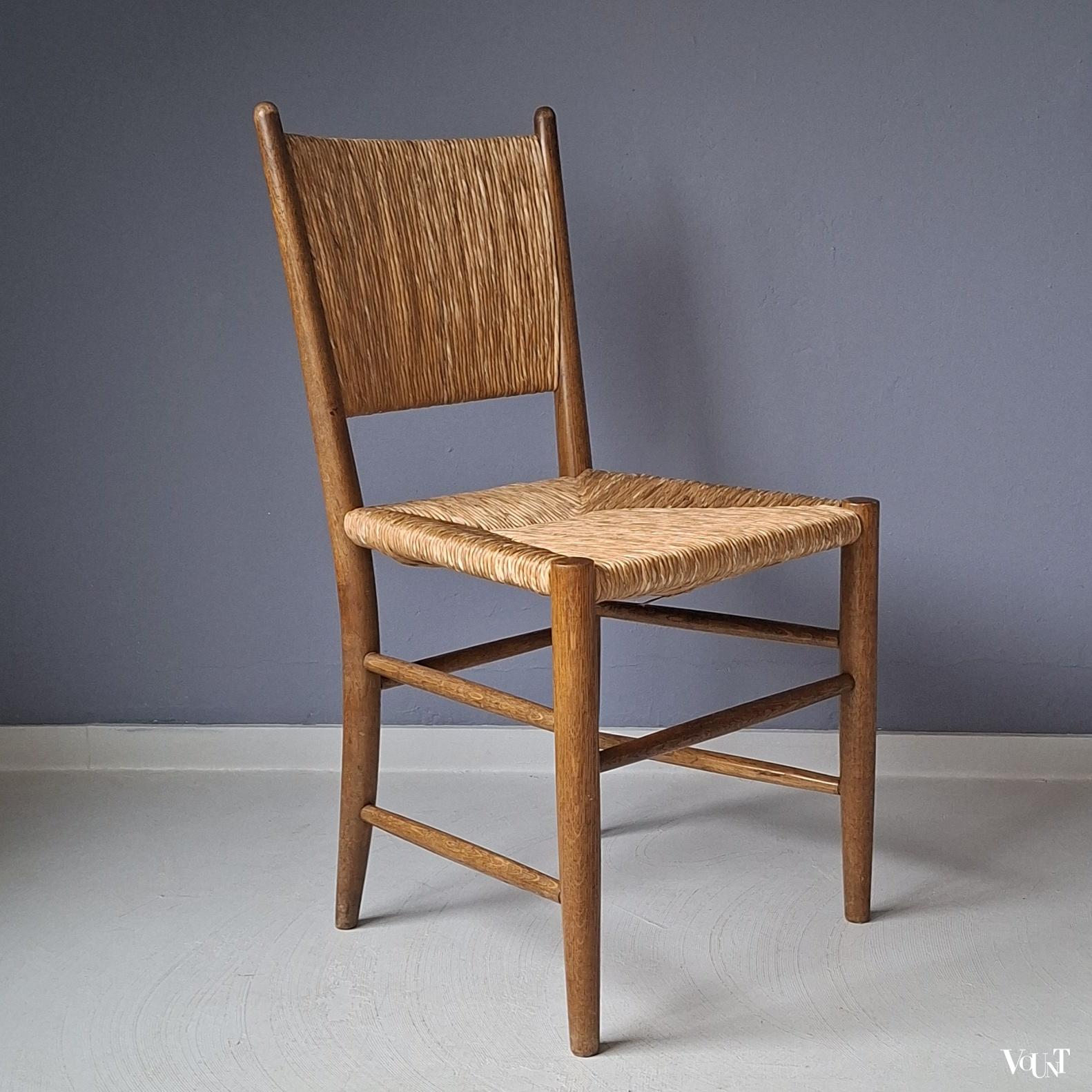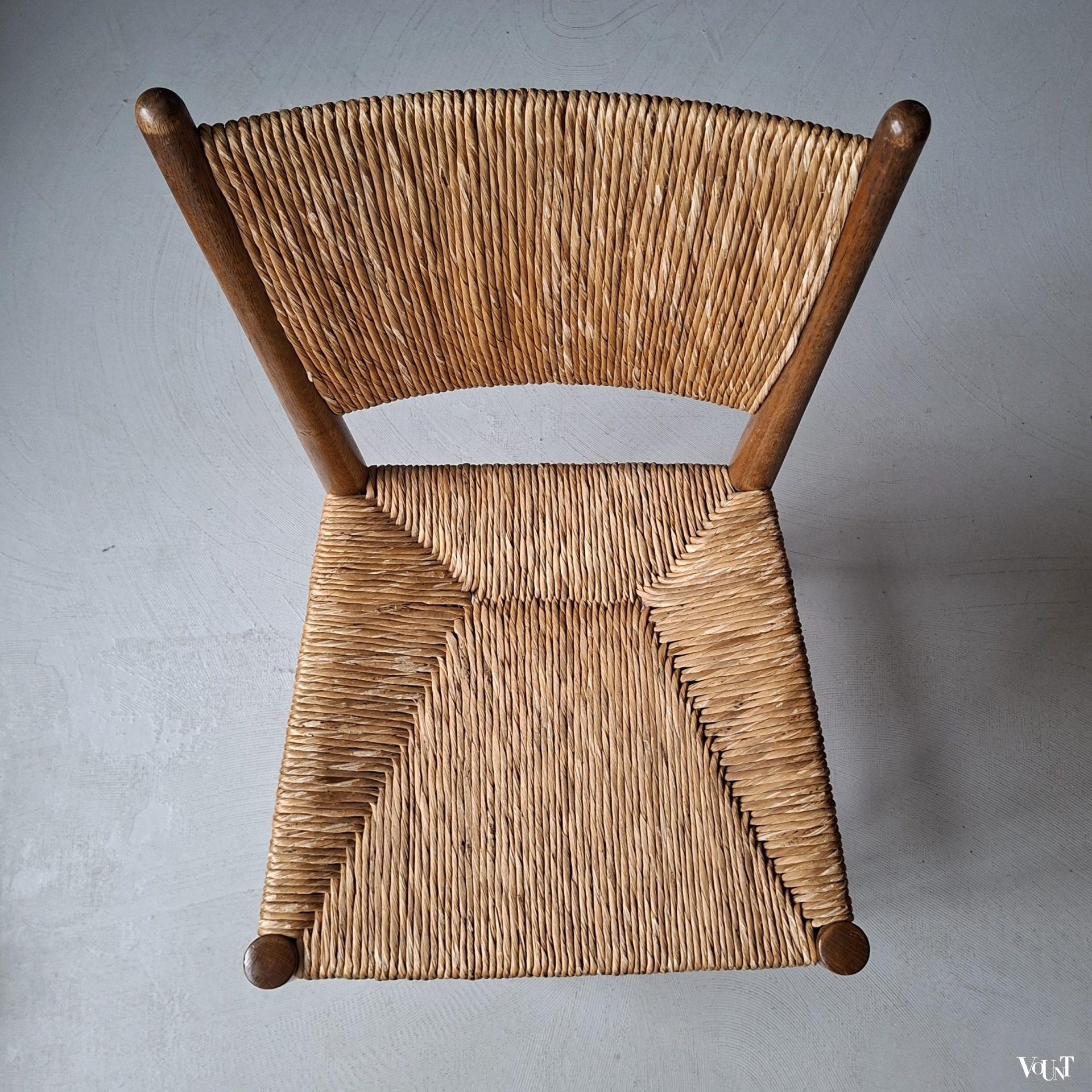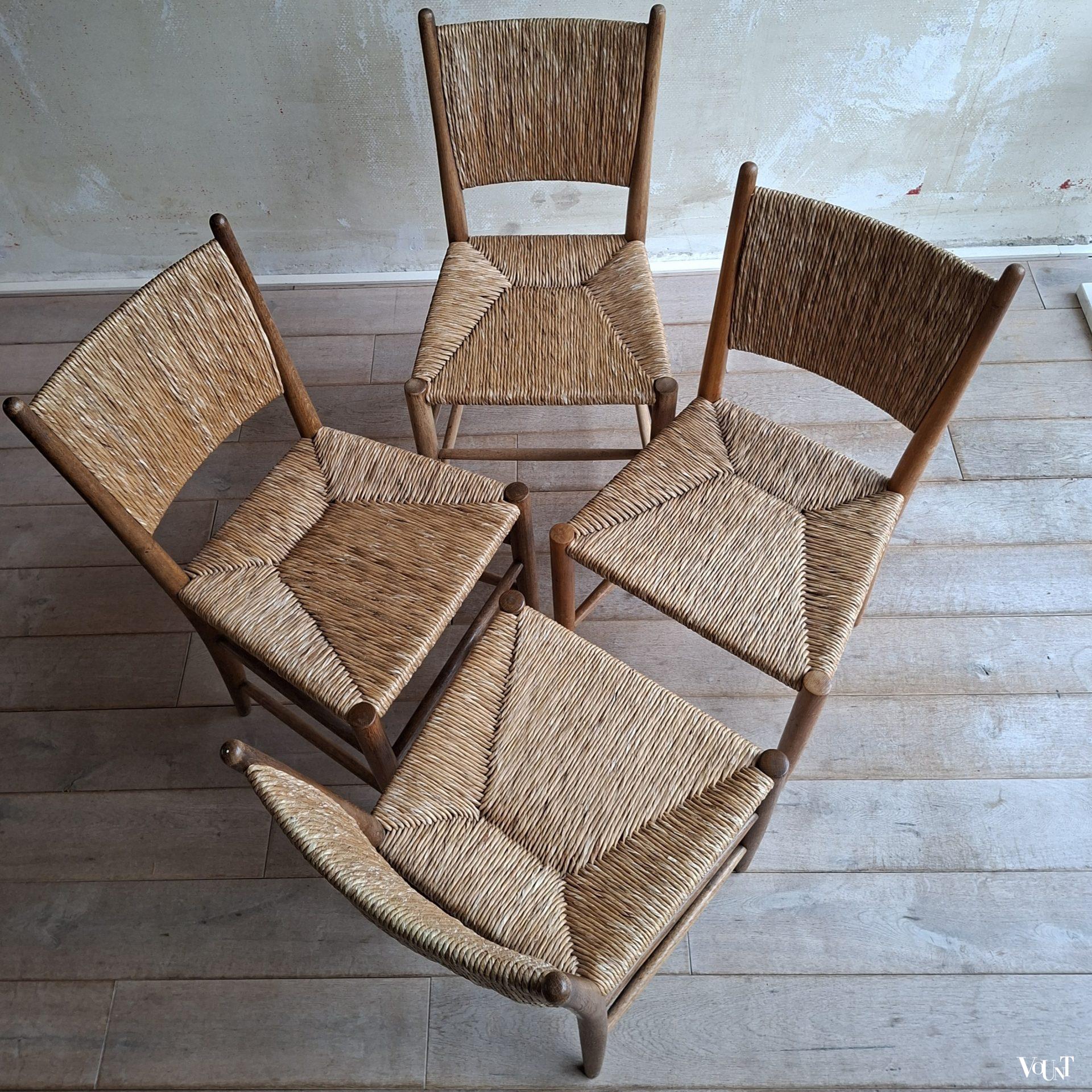 Deze set van 4 jaren ’50 stoelen komt uit Frankrijk. Ze hebben een biezen zitting en rugleuning. Een van de stoelen heeft een afwijkend onderstel/andere wijze waarop de spijlen tussen de poten zijn aangebracht. Zie de 1e en de laatste foto. Hout en biezen zijn in goede en originele conditie.