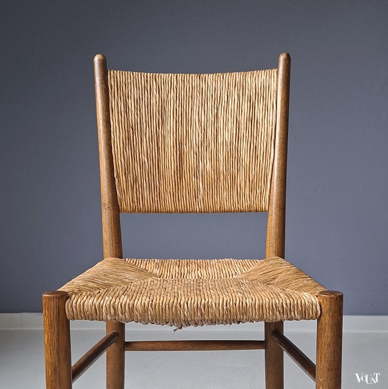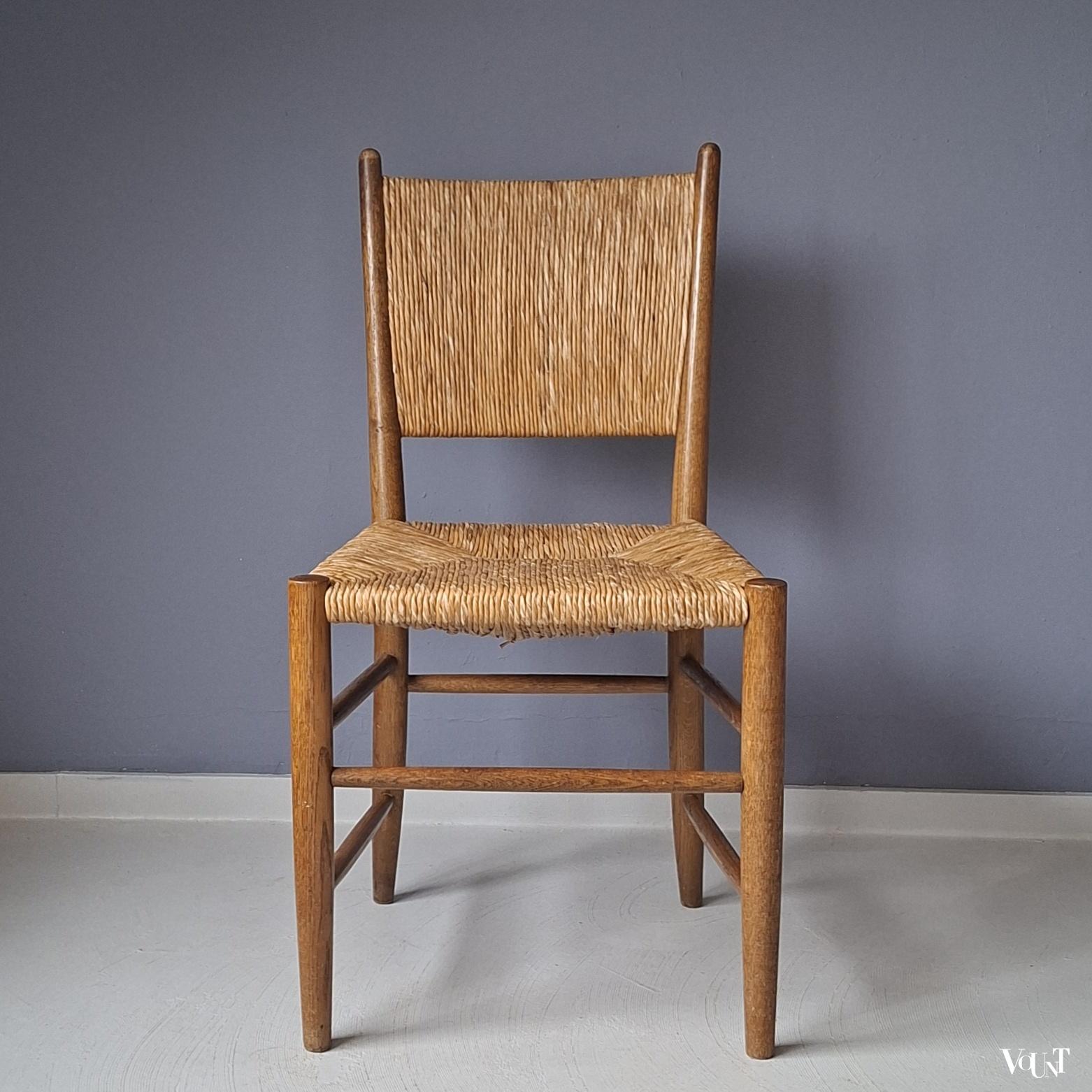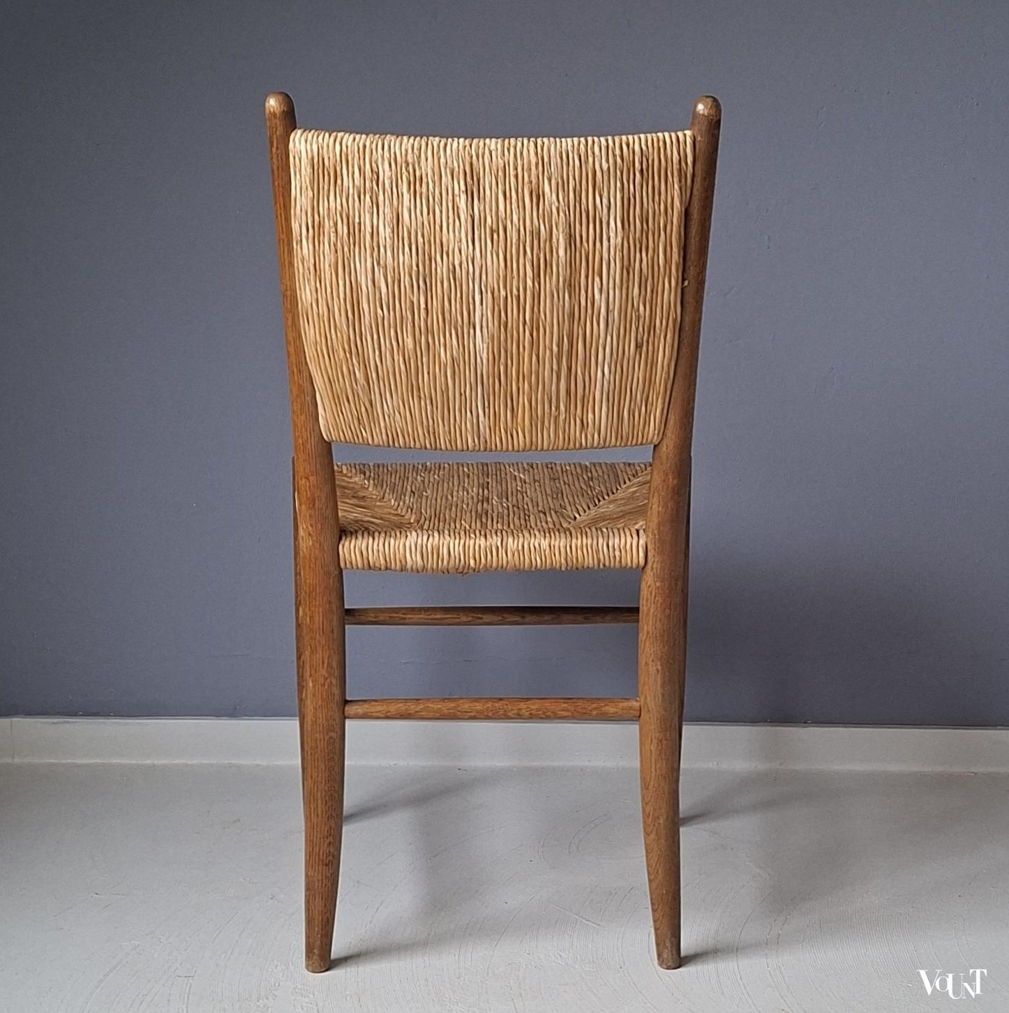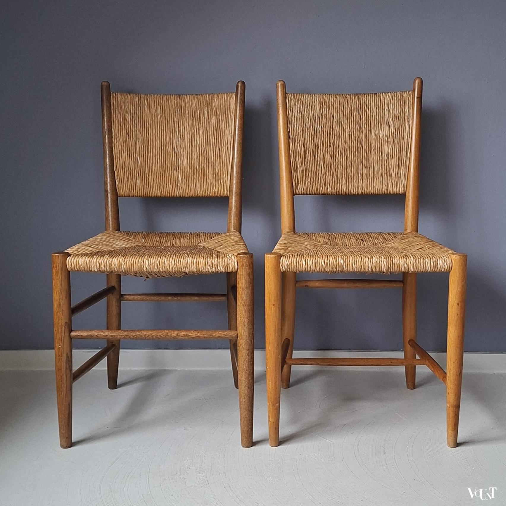 Deze set van 4 jaren ’50 stoelen komt uit Frankrijk. Ze hebben een biezen zitting en rugleuning. Een van de stoelen heeft een afwijkend onderstel/andere wijze waarop de spijlen tussen de poten zijn aangebracht. Zie de 1e en de laatste foto. Hout en biezen zijn in goede en originele conditie.