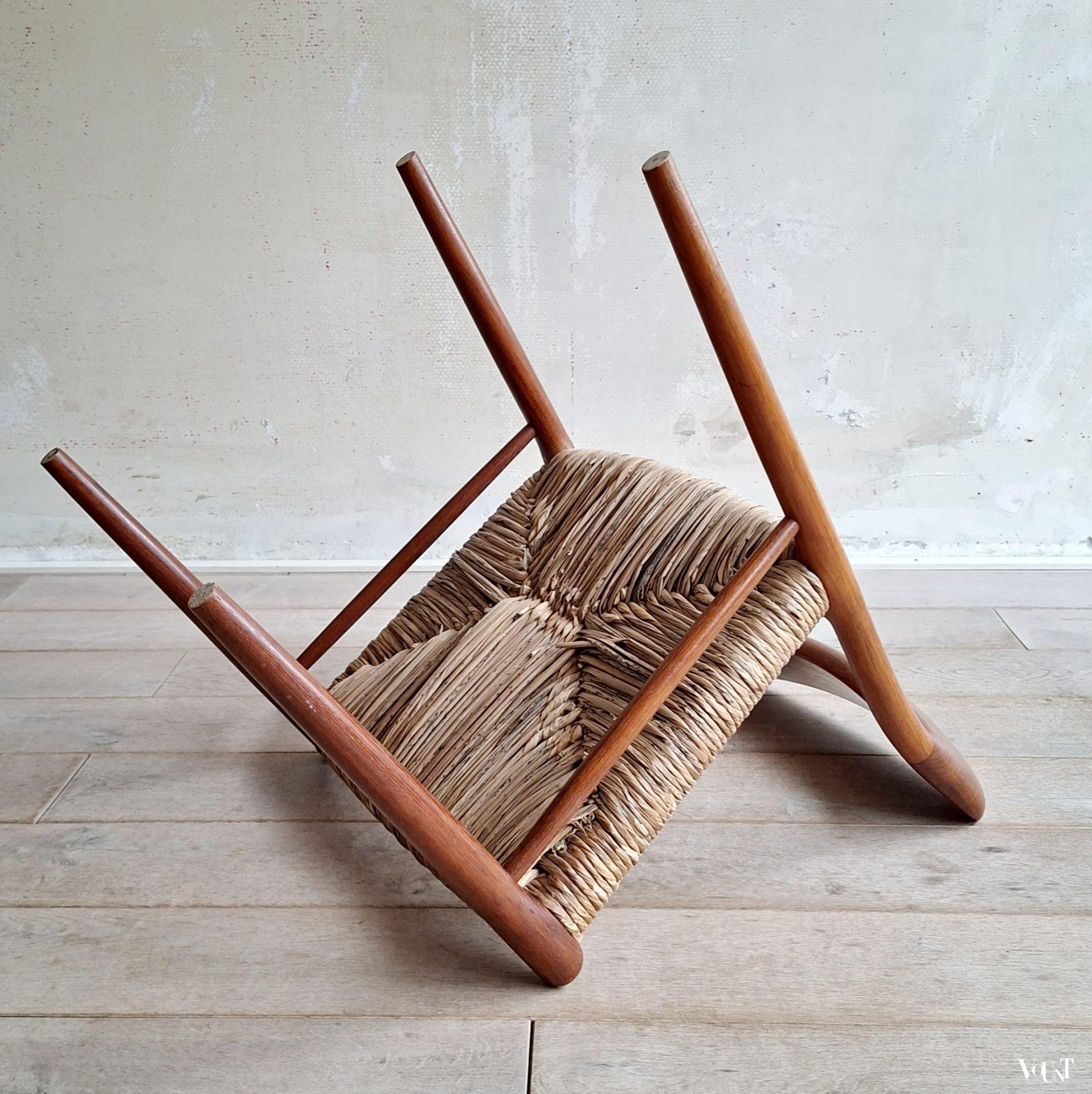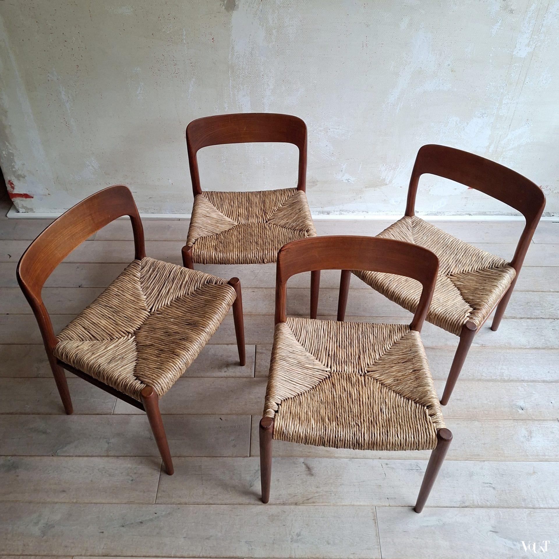 Deze set stoelen dateert uit de jaren ’50 en is gemaakt van teakhout en biezen (deze combinatie kom je minder vaak tegen). De stoelen, hout en biezen, zijn in mooie conditie. Een van de stoelen iets lager is dan de andere 3. (Valt op het eerste gezicht niet op, maar zie je wel als je de stoelen naast elkaar zet). Zie de 2e foto.