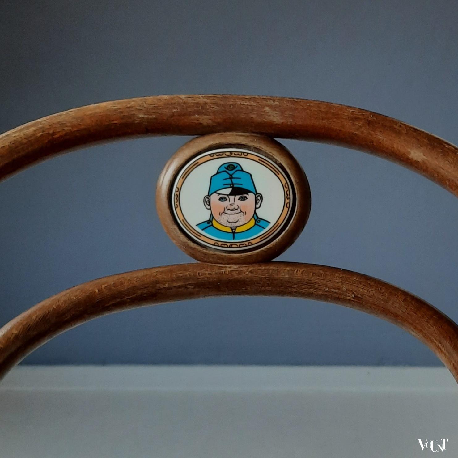 Deze stoel werd door de Tsjechische firma Ton* speciaal vervaardigd voor de eveneens Tsjechische restaurantketen “Svejk Restaurant” (opgericht in 1995). (Zie ook: https://www.svejk.cz/en/about-svejk-restaurant/history/). De in 1859 door Michael Thonet ontworpen stoel nr. 14 is hiervoor door Ton speciaal voorzien van een “medaillon” (of zoals in de Thonet-catalogus van 1906 wordt vermeld: “Lehnring”) met afbeelding van “de brave soldaat Svejk”, een creatie van de Tsjechisch illustrator, kunstschilder en schrijver Josef Lada (1887-1957) bij het boek van de Tsjechische schrijver Jaroslav Hasek (1883 – 1923): De lotgevallen van de brave soldaat Svejk. Aan de achterzijde is de stoel voorzien van een metalen merkplaatje van Ton.