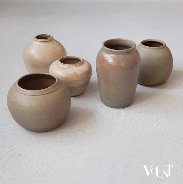 Mooie set van 5 aardewerken vaasjes. Gemerkt NvD; voor ons tot nu toe niet herleidbaar. Alle 5 in goede, onbeschadigde conditie.