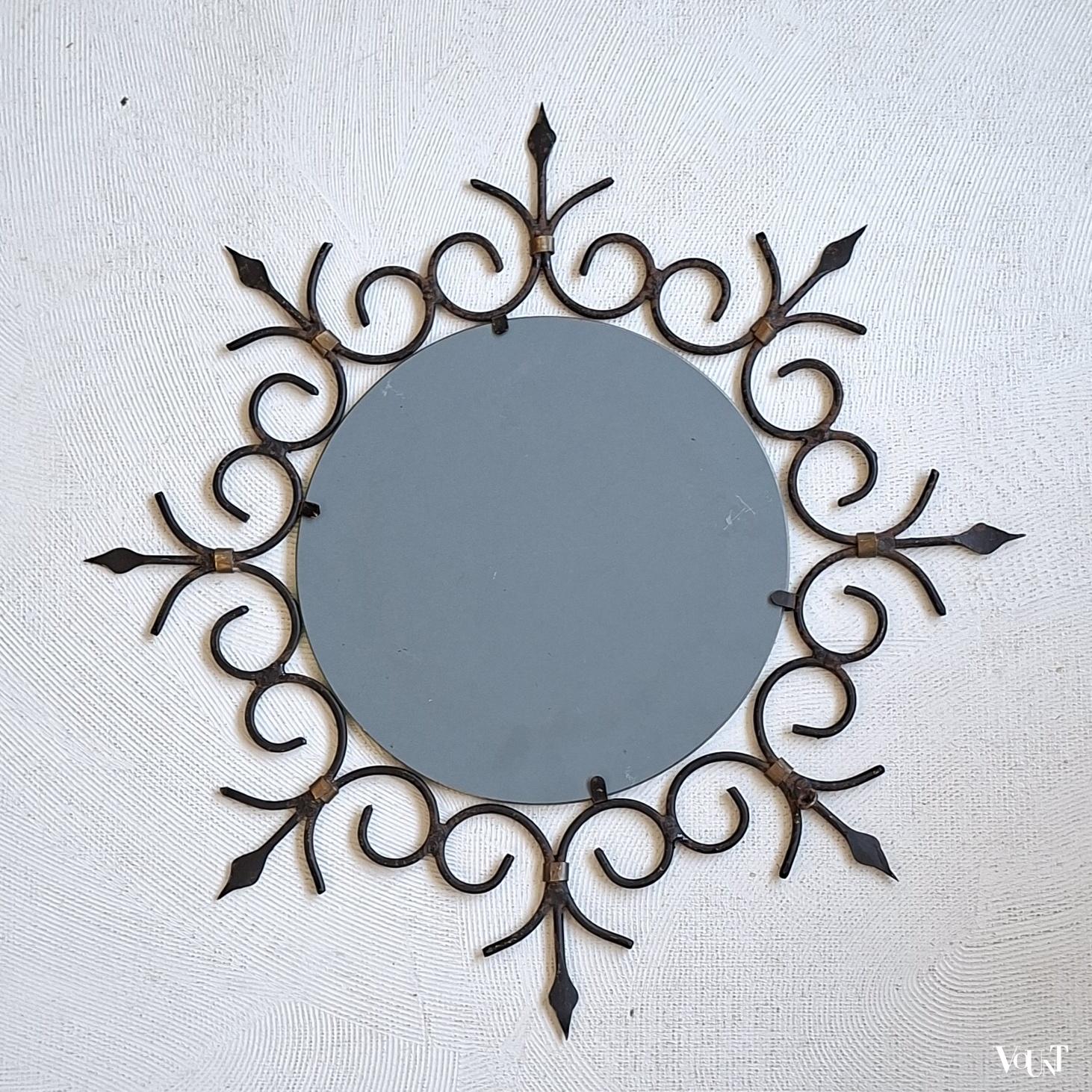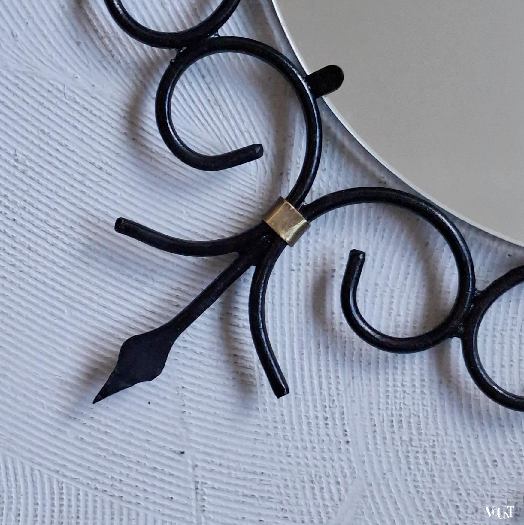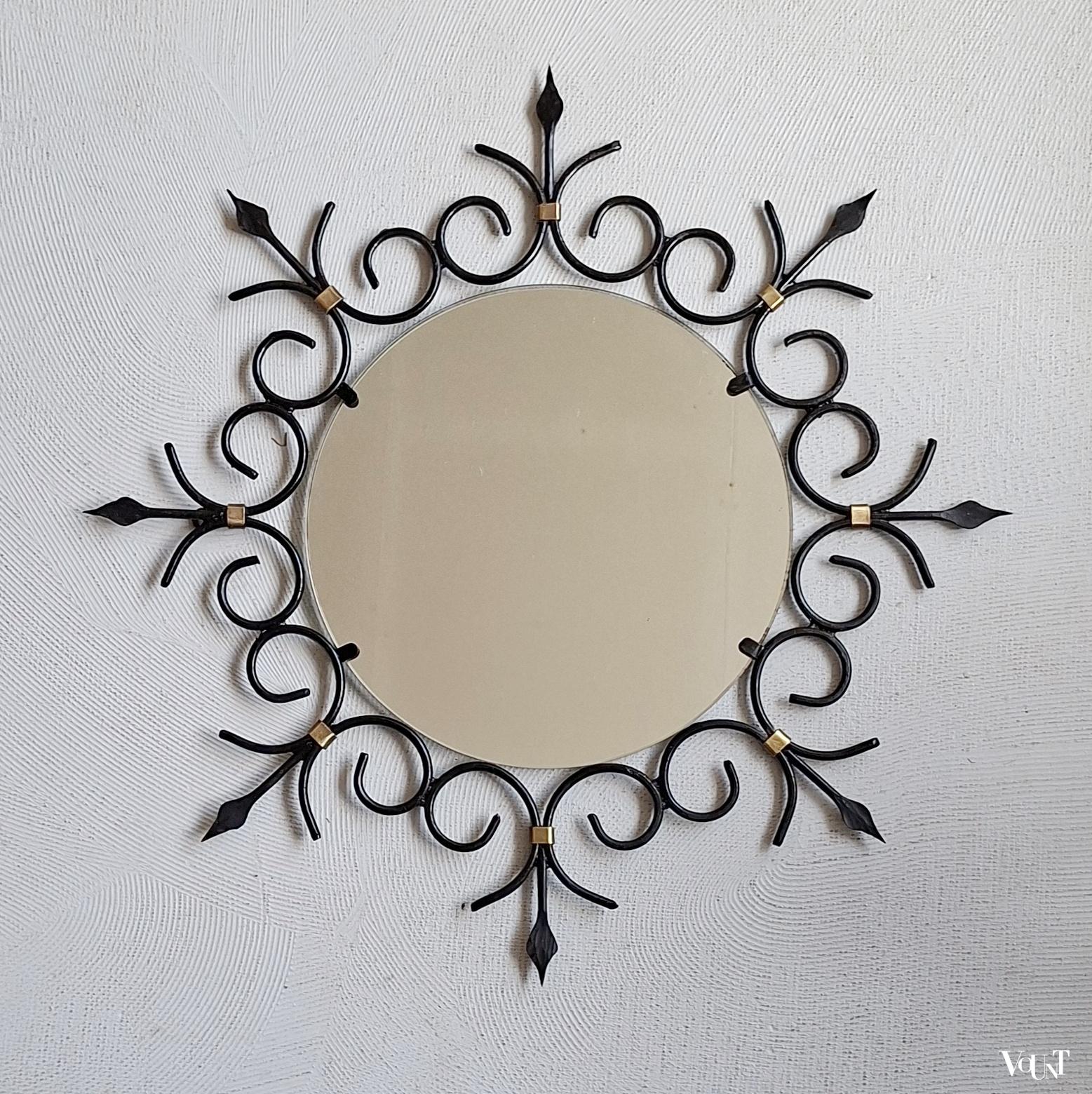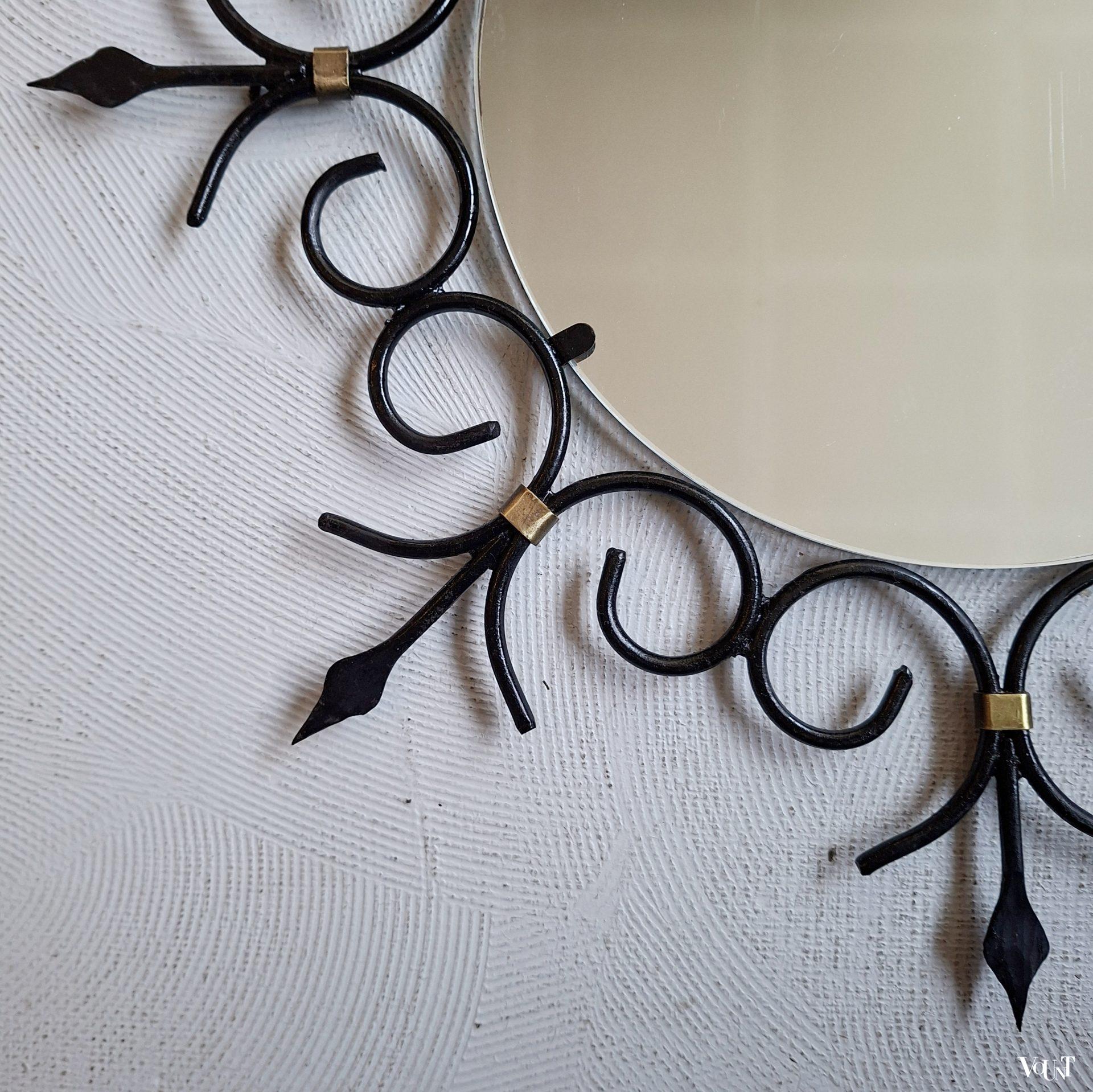 Deze Franse jaren ’60 spiegel is gemaakt van smeedijzer. Zwart met messing accenten.