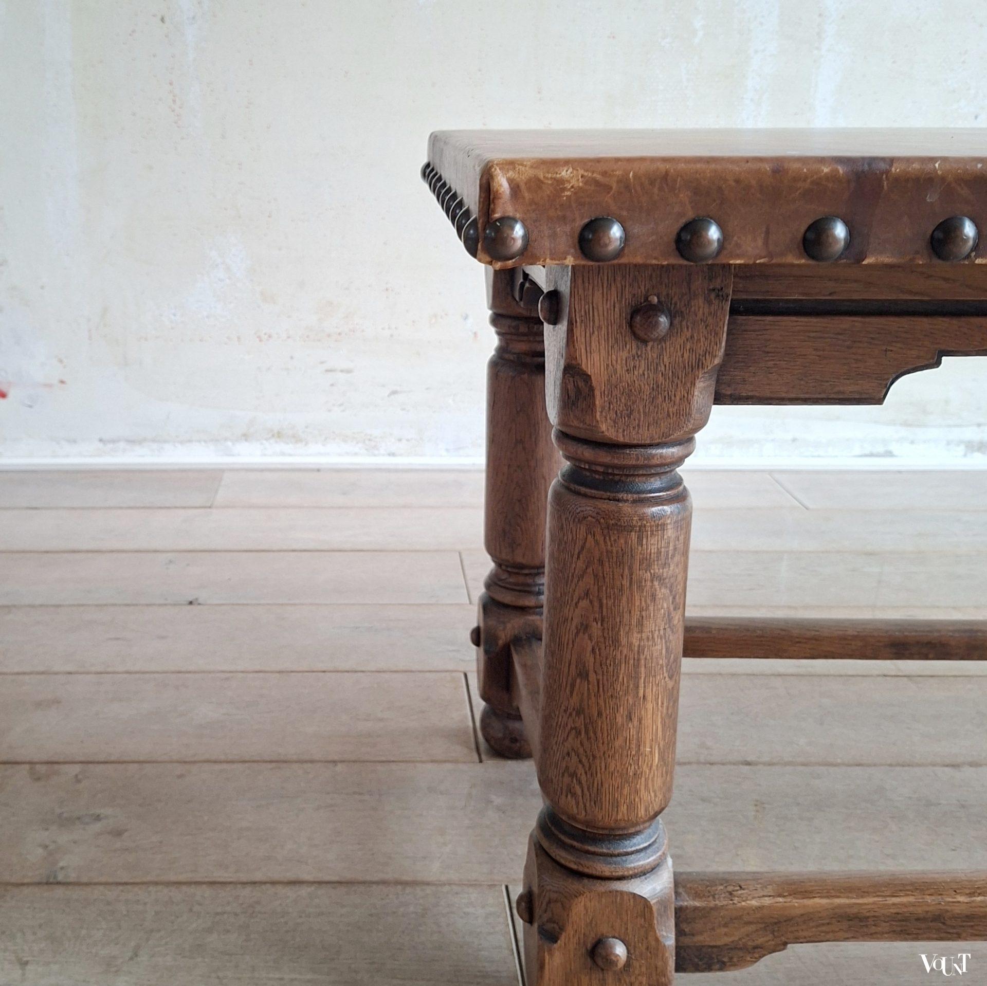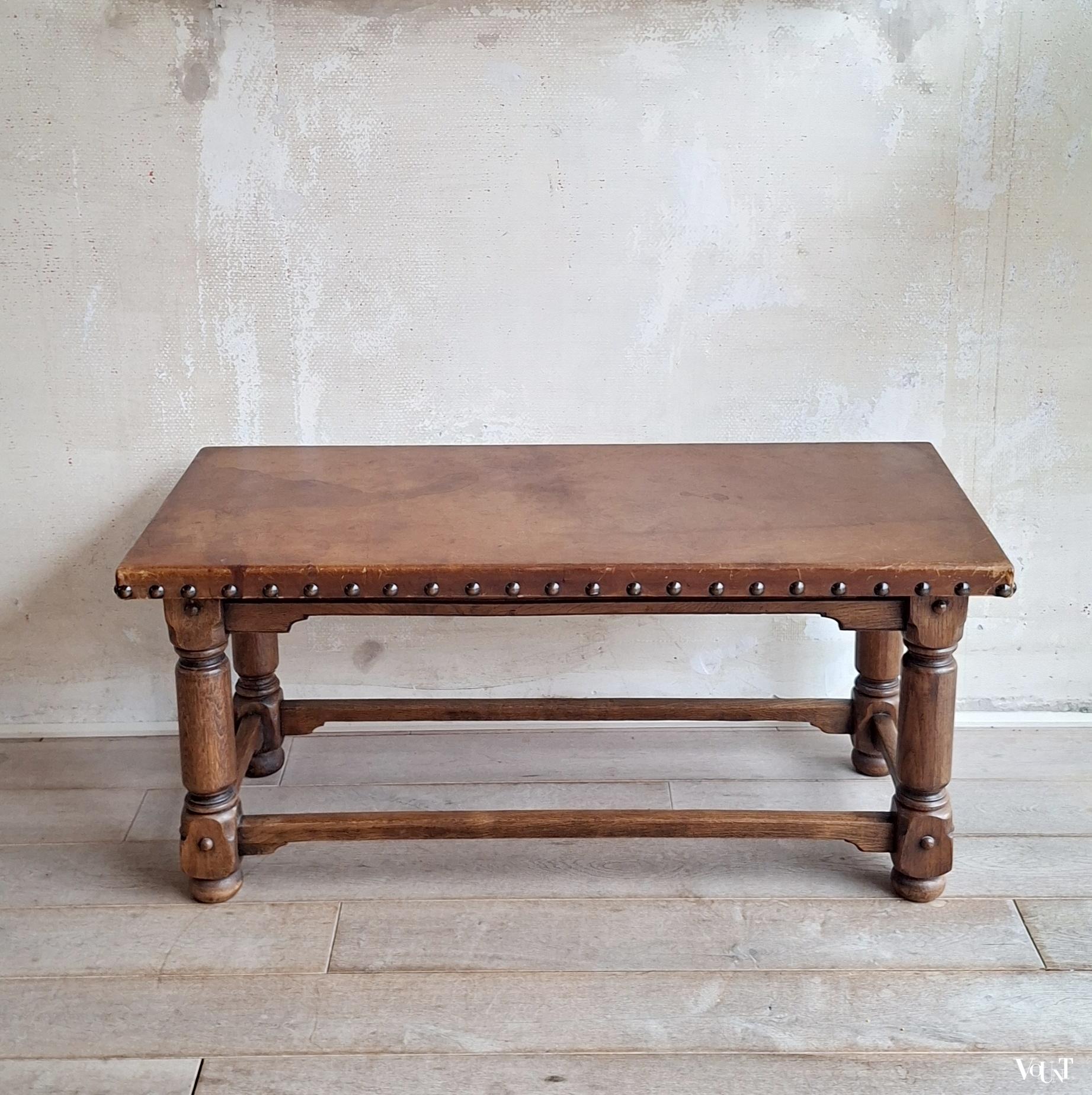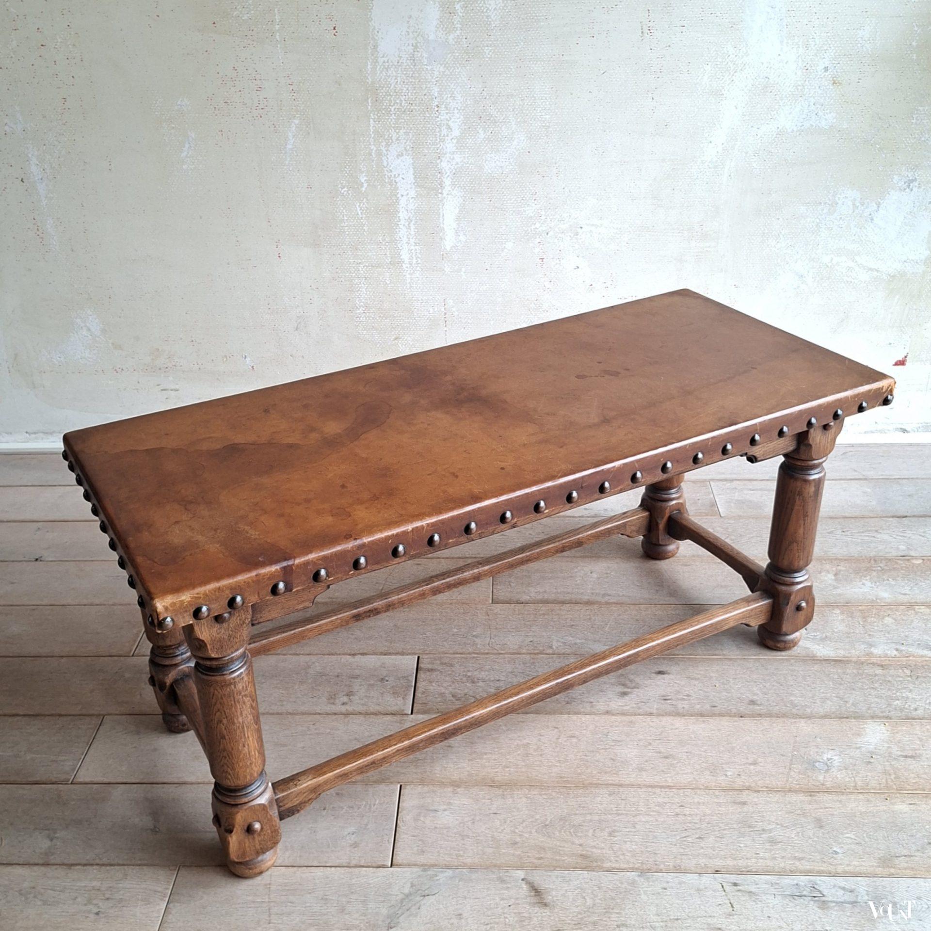 Deze jaren ’50 Spaanse salontafel kan eventueel ook als bank in een hal o.i.d. gebruikt worden. Stevig. Het leer heeft gebruikssporen in de vorm van vlekken: draagt bij aan het stoere uiterlijk. In goede conditie.