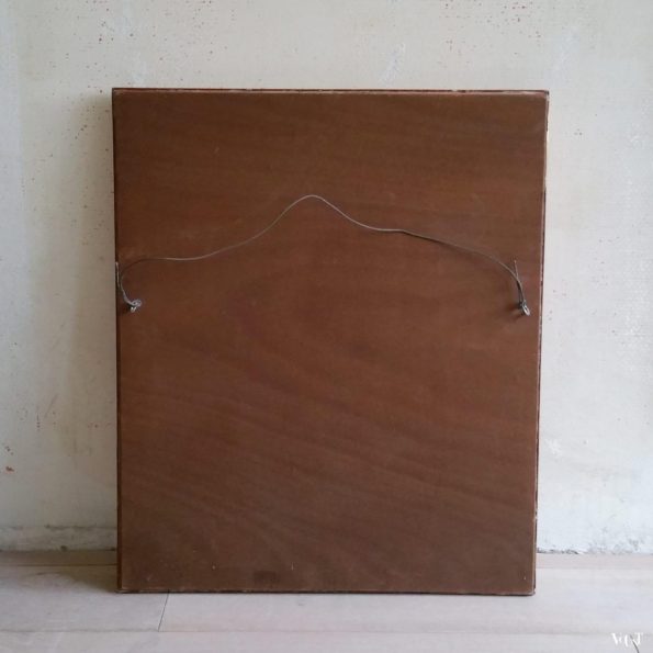Deze spiegel dateert uit de jaren ’60/’70 en komt uit Frankrijk. Hij heeft een goudkleurige houten lijst die voorzien is van een klavermotief. De achterkant is bedekt met een houten paneel. Beide, spiegelglas en lijst, zijn in zeer goede staat.