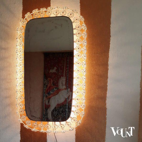 Deze spiegel met facetrand heeft een metalen frame, een dubbele rand van kunststof bloemen en verlichting met trekkoordje. Ontwerp uit de jaren ’50 van de Oostenrijkse designer Emil Stejnar voor Rupert Nikoll.  Deels verweerd (foxed) spiegelglas (geen chips o.i.d.). Indien gewenst, kan het spiegelglas gemakkelijk vervangen worden. Wij hebben het vanwege het karakter van de spiegel (patina) zo gelaten. Behalve de nieuwe bedrading, dus in originele staat. Normale sporen van ouderdom en gebruik. Kan opgehangen worden met behulp van een oog in het achterpaneel. Heeft 4 lichtpunten achter de spiegel, waardoor er een zee van licht achter tevoorschijn komt, genoeg om bijvoorbeeld een slaapkamer of hal te verlichten. Voorzien van trekkoordje.