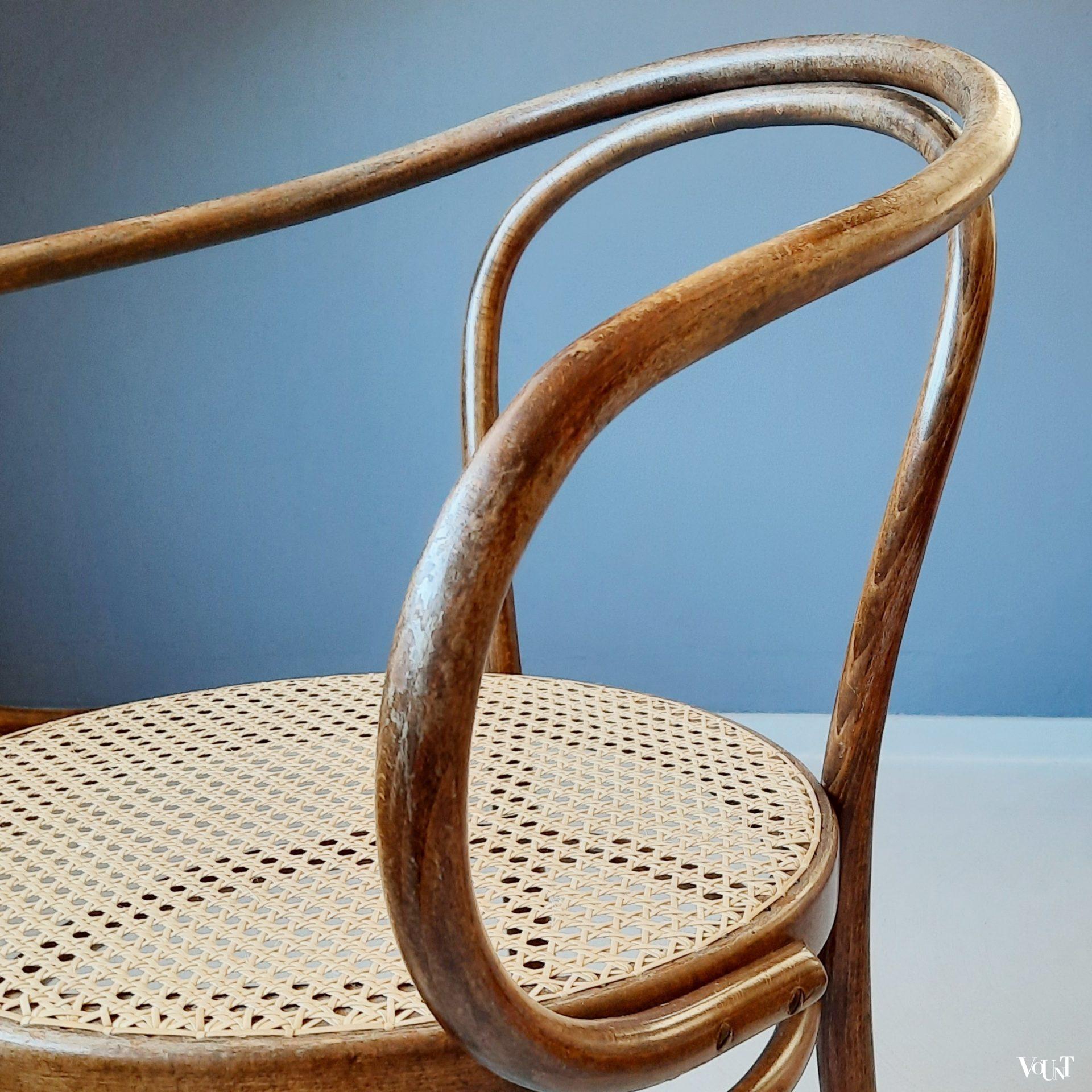 De B9 / 209 stoel of Wiener Stuhl werd rond 1900 ontworpen door J & J Kohn/Thonet. De stoel heeft mede bekendheid gekregen doordat het een favoriet was van de Franse ontwerper Le Corbusier en ook een plek kreeg in zijn interieurs. Deze 209 stoel is ca. jaren ’70 geproduceerd door ZPM Radomsko, een voormalige, na WO II genationaliseerde Thonet-fabriek in Polen. In goede conditie, zowel het hout als de rotan webbing. Voor de leeftijd normale gebruikssporen (slijtage van de laklaag). Nieuwe (2023) met de hand geweven rotan zitting.