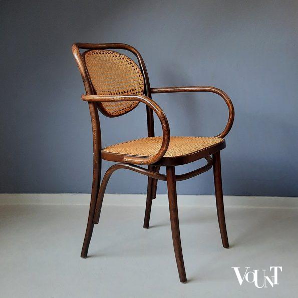 Deze donkerbruine beukenhouten bentwood stoel met rotan webbing in zitting en rugleuning is gemaakt in een voormalige, na W.O. II genationaliseerde Thonet-fabriek in Polen, ZPM Radomsko. Jaren ’70. In goede conditie. Voor de leeftijd normale gebruikssporen. De met de hand geweven rotan webbing van zitting is recentelijk vervangen; die van de rugleuning is intact. Restant papieren label onder de zitting. Ook mooi als bureaustoel.