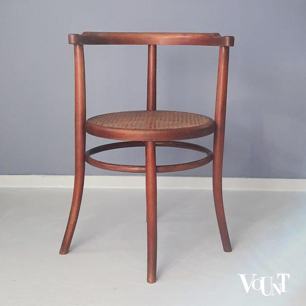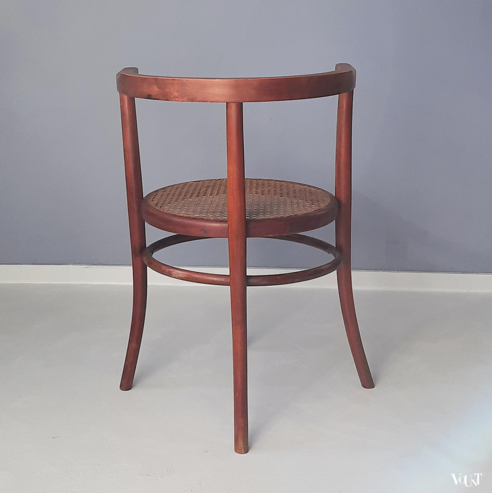 Deze bentwood (onder invloed van stoom gebogen houten) stoelt staat afgebeeld in de catalogus van Fischel van 1915 als stoel “No. 19 E”. D.G. Fischel Sons werd in 1870 Niemes/Mimom, tegenwoordig in Tsjechië, opgericht door David Gabriel Fischel. Later had het bedrijf ook een vestiging in Wenen. Het bedrijf heeft tot 1939 bestaan. De stoel is in goede conditie, zowel het hout als de rotan webbing van de zitting. Onder de zitting gemerkt “Fischel Austria”.