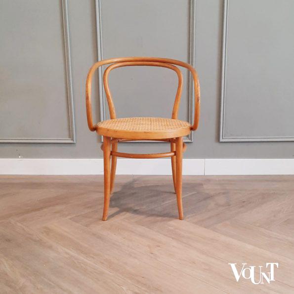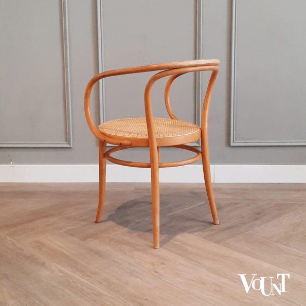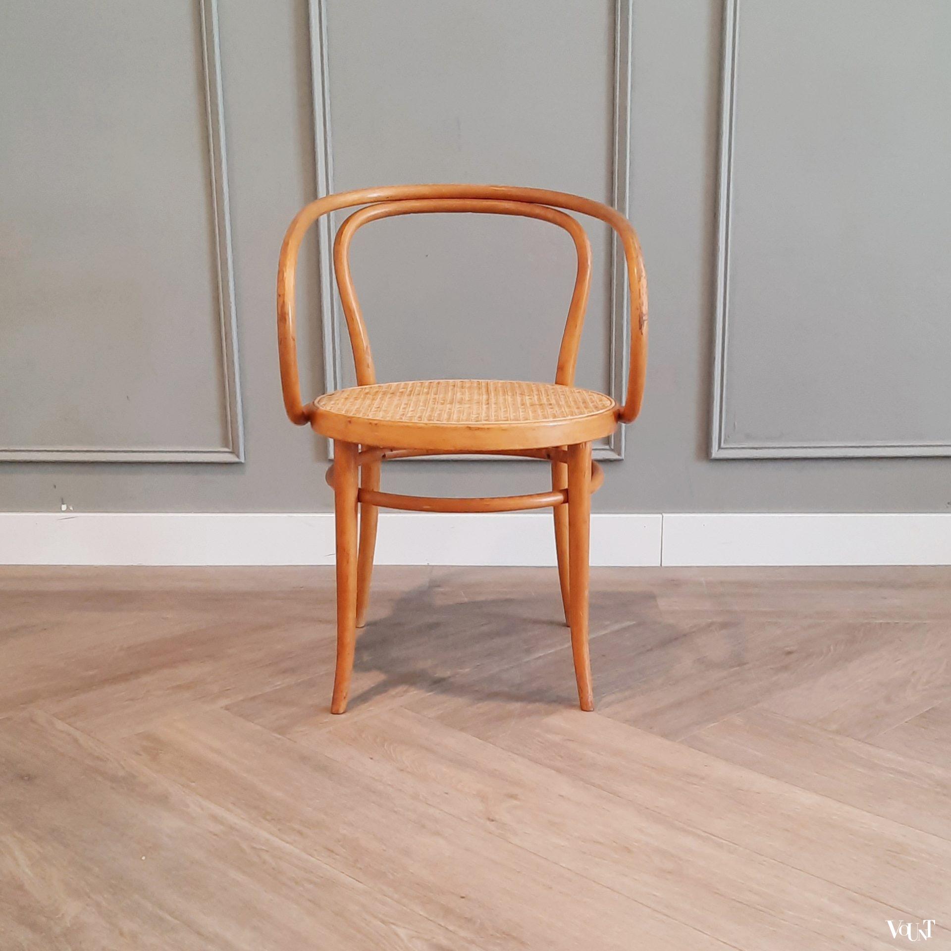 De 209 stoel of “Wiener Stuhl” werd rond 1900 ontworpen door Thonet. De stoel heeft mede bekendheid gekregen doordat het een favoriet was van de Franse ontwerper Le Corbusier en deze ook een plek kreeg in zijn interieuren. Dit exemplaar is begin jaren ’70 geproduceerd door Thonet (Duitsland). Het papieren Thonet-label is niet meer aanwezig, maar de omtrek daarvan wel. Hoewel orgineel voorzien van een geprefabriceerde rotan zitting, is deze in tussentijd vervangen door een met de hand geweven zitting. Omdat die inmiddels ook versleten was, hebben wij deze  weer laten vervangen door een nieuwe geprefabriceerde rotan zitting. De stoel heeft voor de leeftijd normale gebruikssporen.