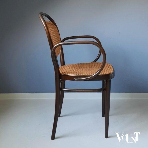 Deze nr. 215 (koffiehuis) stoel (RF staat voor de uitvoering met armleuningen) is in 1977 geproduceerd door Thonet (Duitsland), zoals aangegeven onder de zitting. De stoel werd in 1859 ontworpen door Michael Thonet, de oprichter van Thonet. Bruin beukenhouten frame en een rotan zitting en rugleuning. In heel goede conditie.