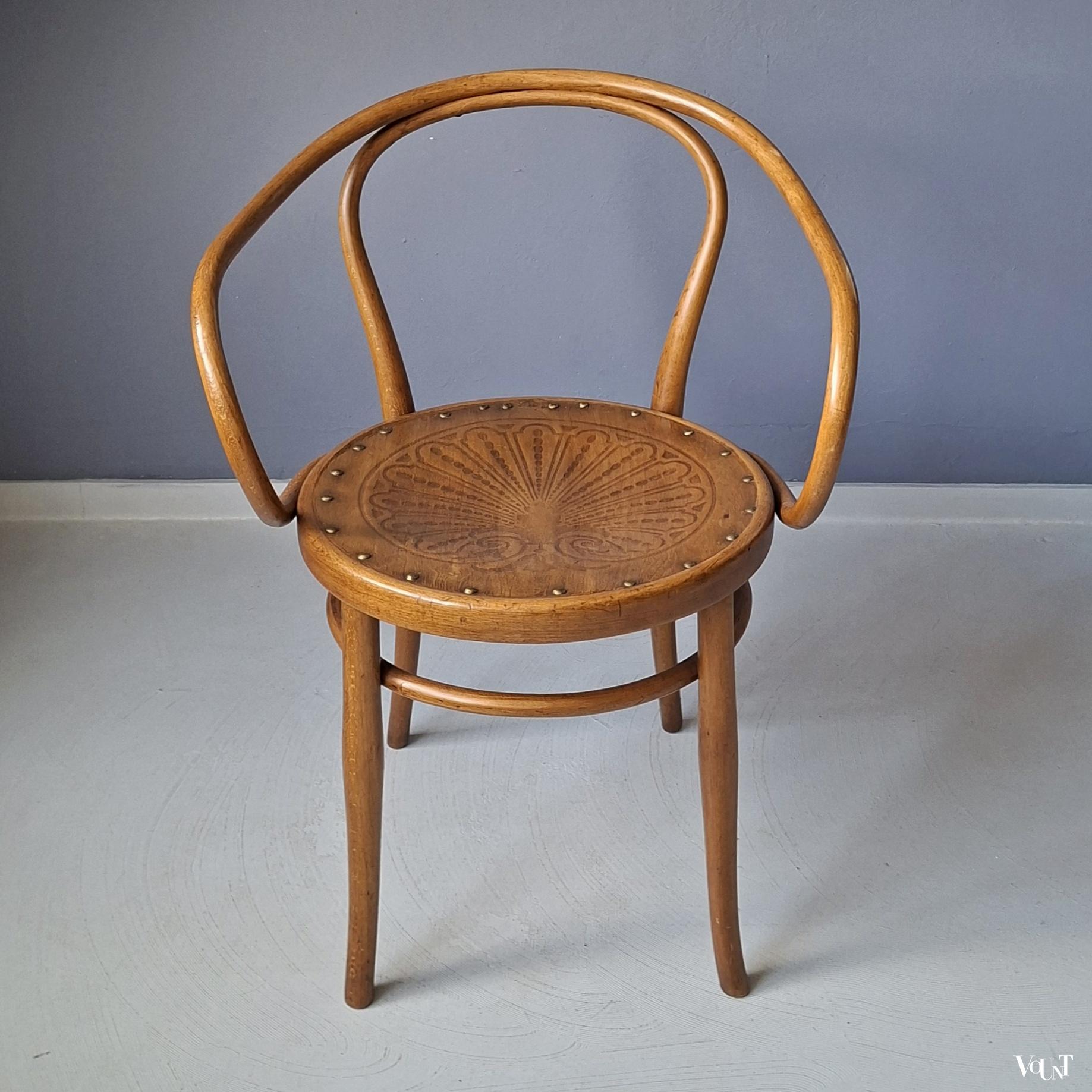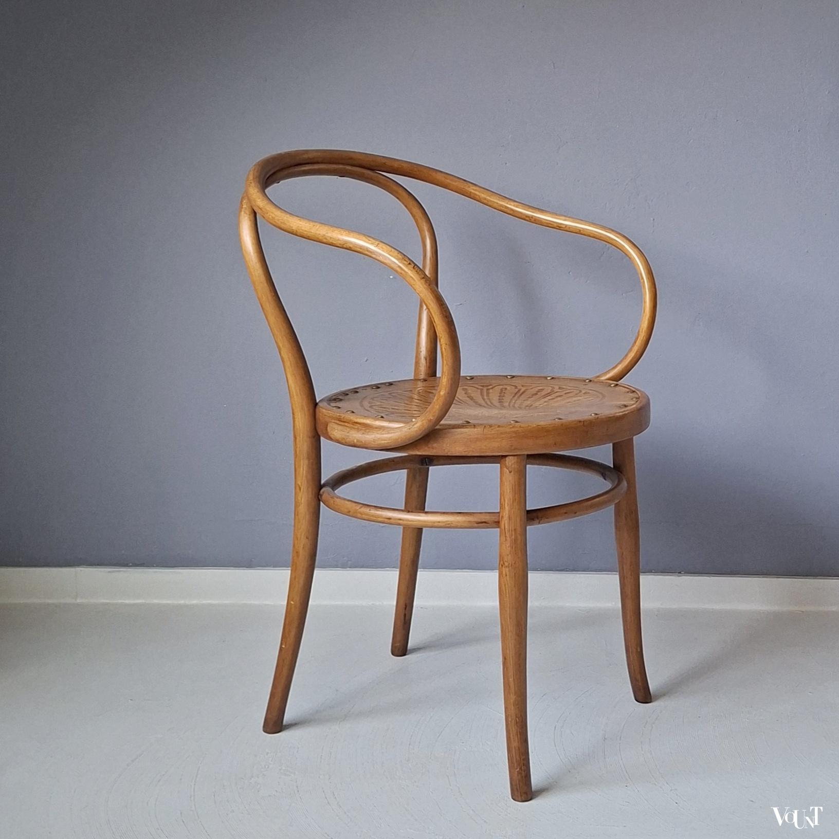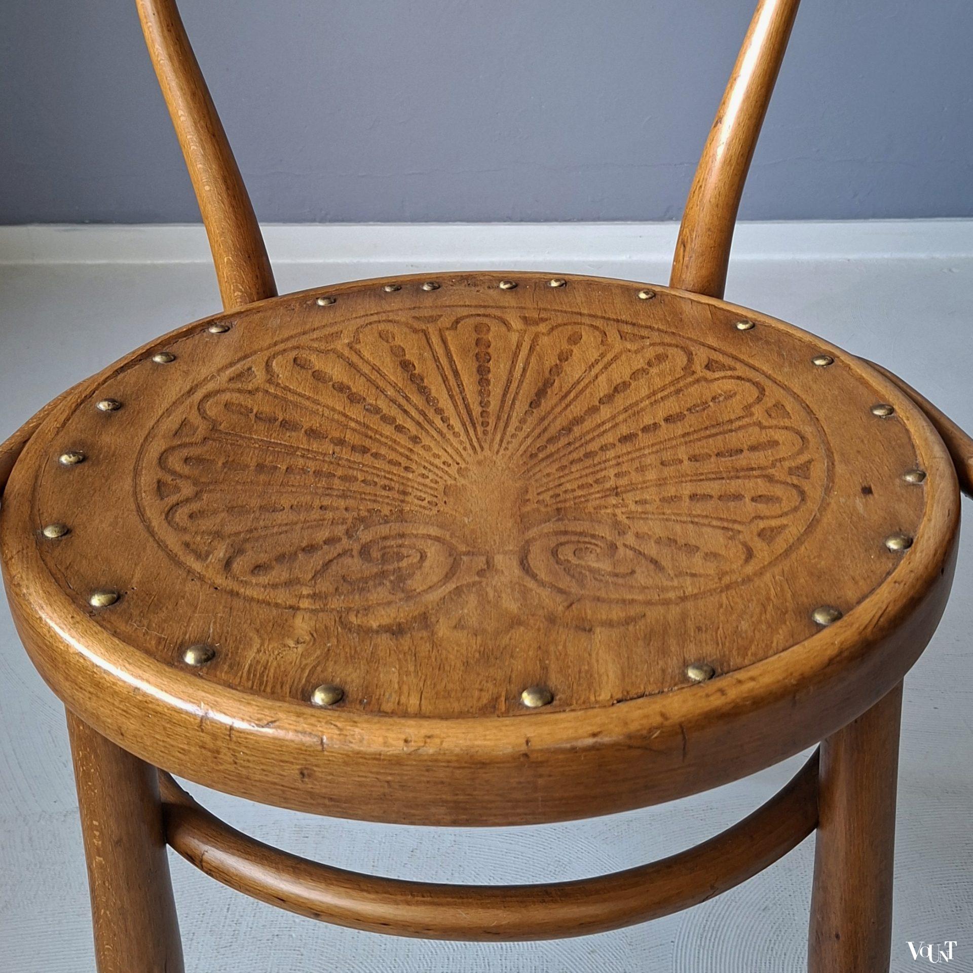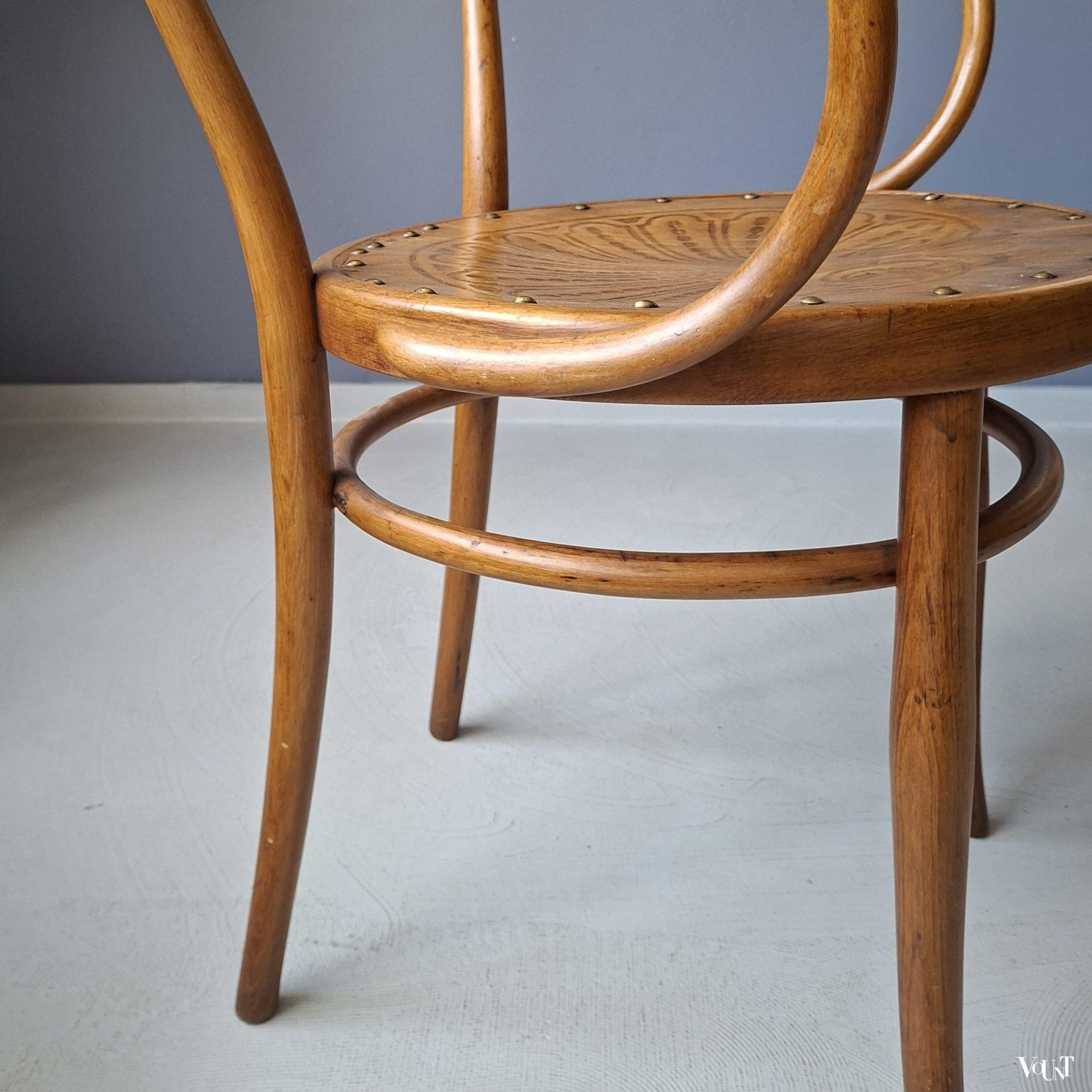 Deze bentwood beukenhouten honingkleurige stoel werd rond 1900 ontworpen door Jacob & Josef Kohn en later ook uitgevoerd door Thonet (als stoel nr. B9/6009 (later nr. 209) of wel de Wiener Stuhl). In de uitvoering door J & J Kohn is dit stoel nr. 712. Zeker gezien de leeftijd (productie rond 1900) in goede conditie. Plywood zitting. Enkele verspreide oude/behandelde houtwormgaatjes. Deze stoel kom je niet veel meer tegen.