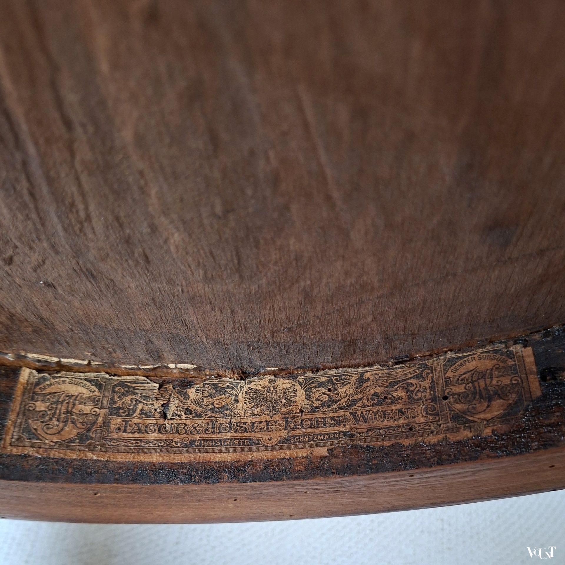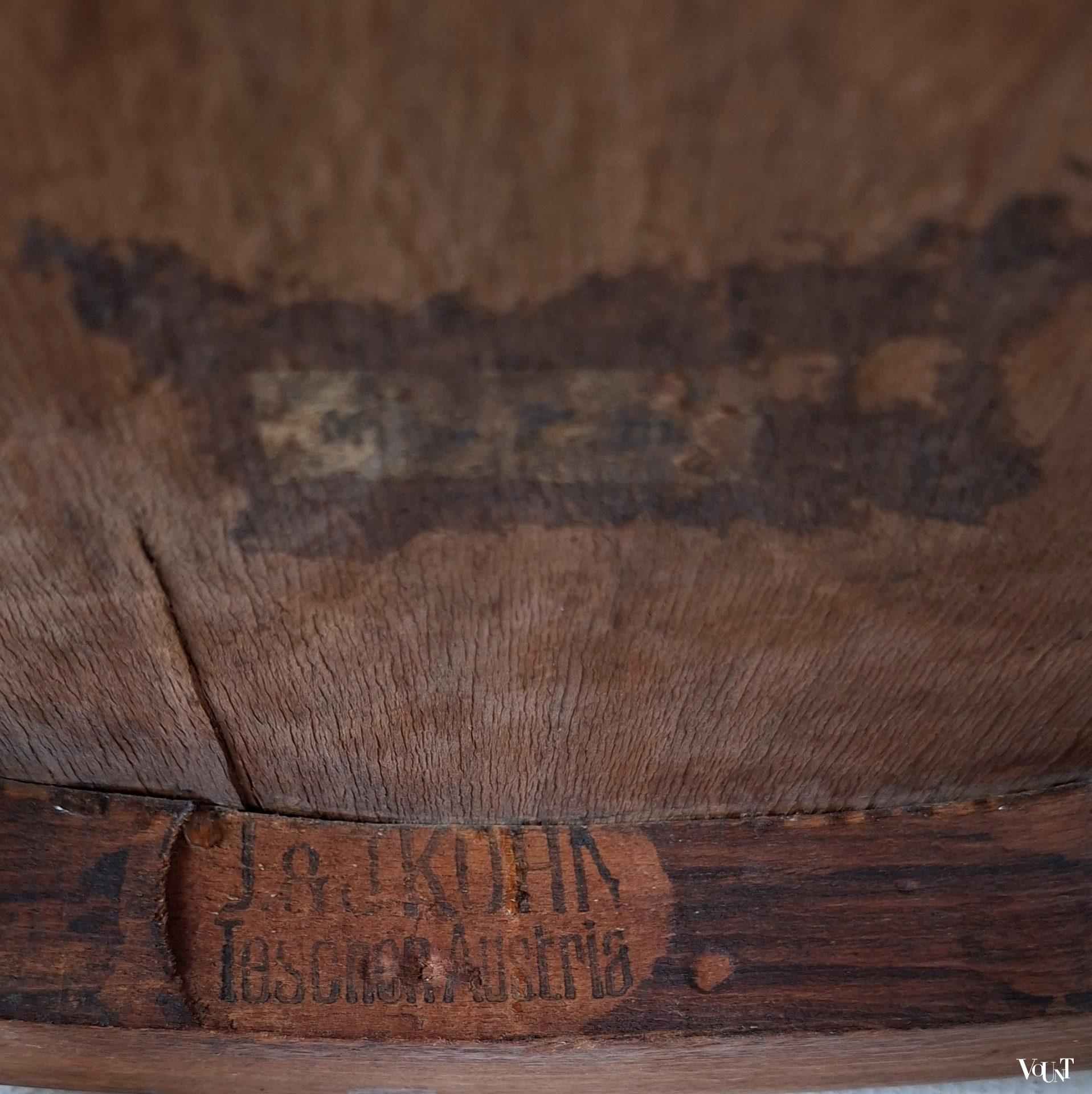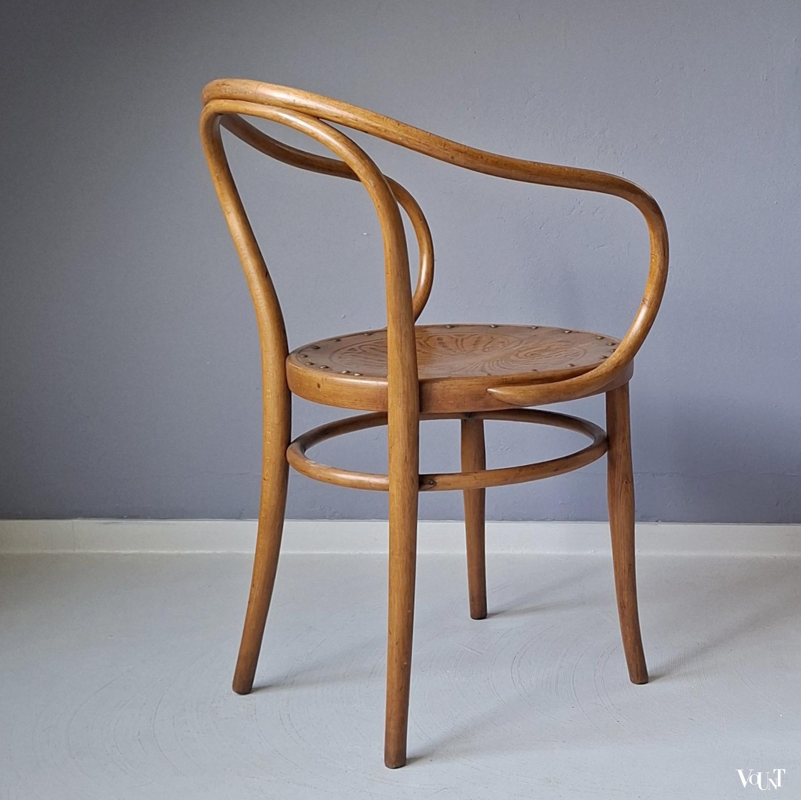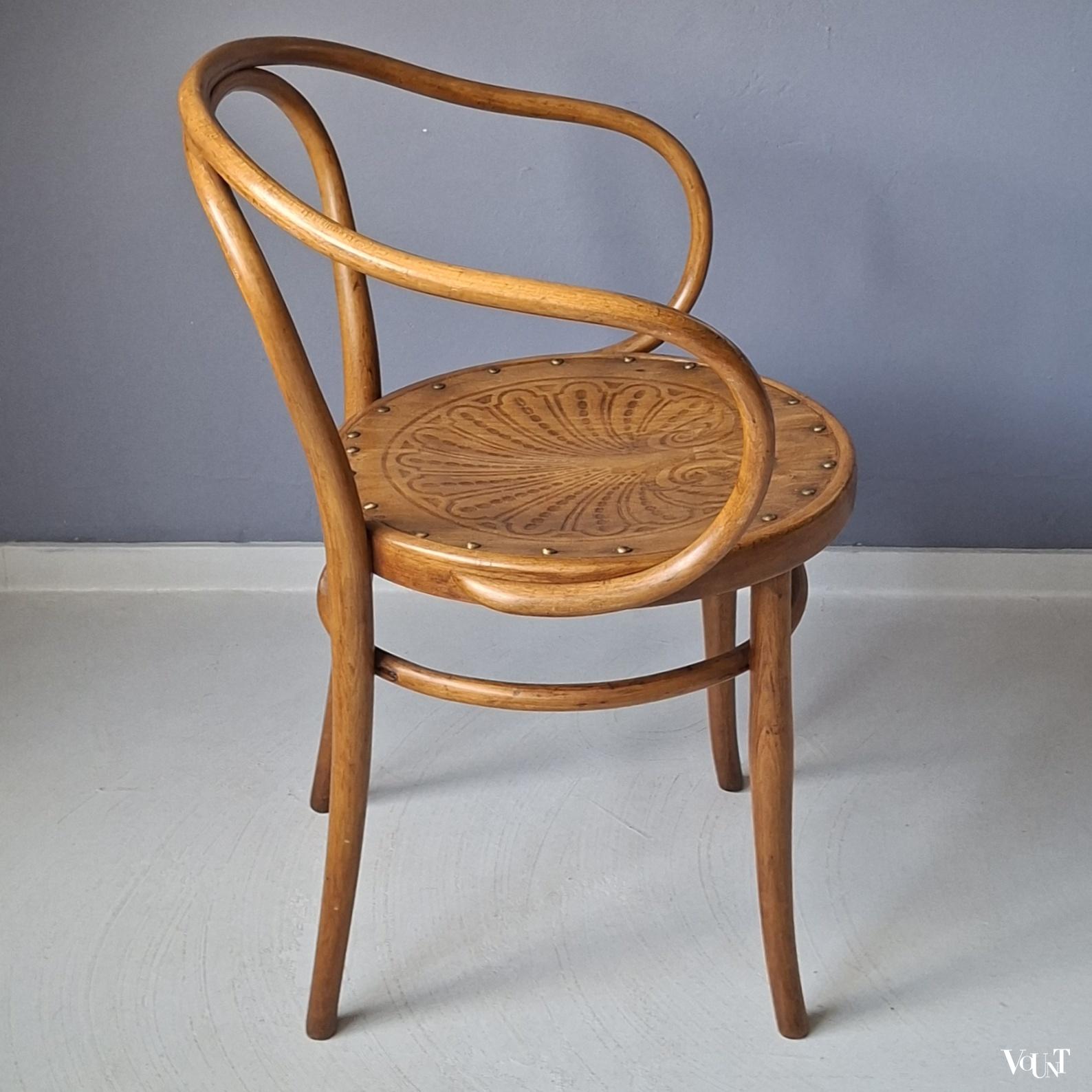 Deze bentwood beukenhouten honingkleurige stoel werd rond 1900 ontworpen door Jacob & Josef Kohn en later ook uitgevoerd door Thonet (als stoel nr. B9/6009 (later nr. 209) of wel de Wiener Stuhl). In de uitvoering door J & J Kohn is dit stoel nr. 712. Zeker gezien de leeftijd (productie rond 1900) in goede conditie. Plywood zitting. Enkele verspreide oude/behandelde houtwormgaatjes. Deze stoel kom je niet veel meer tegen.