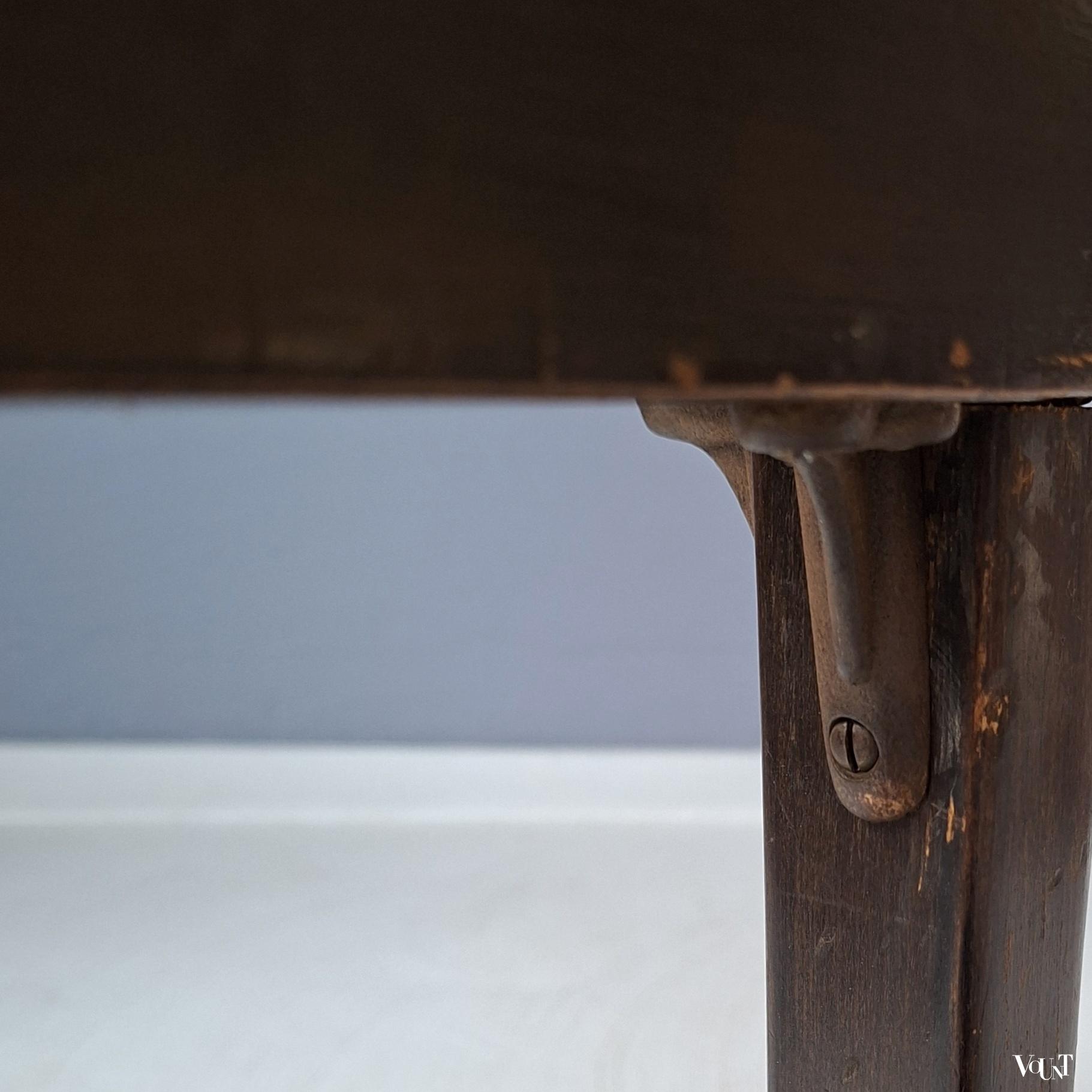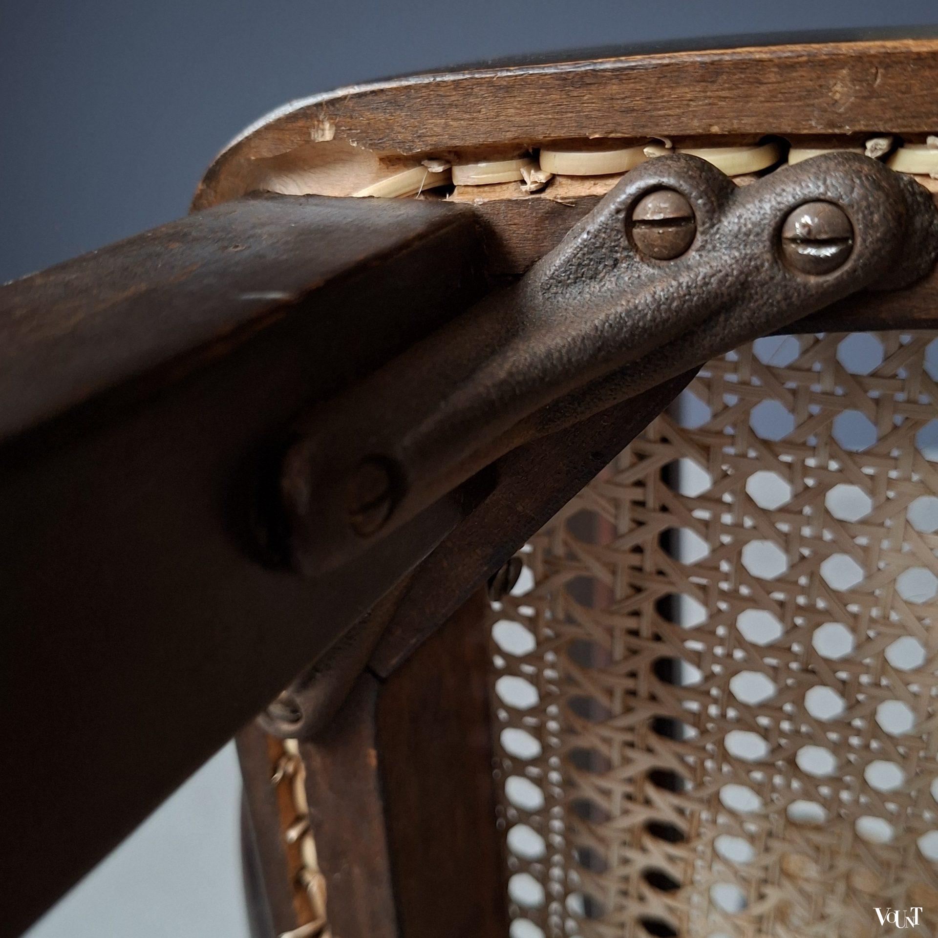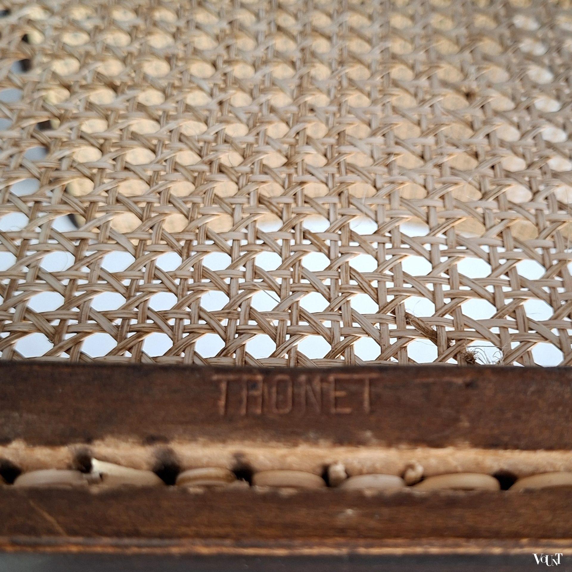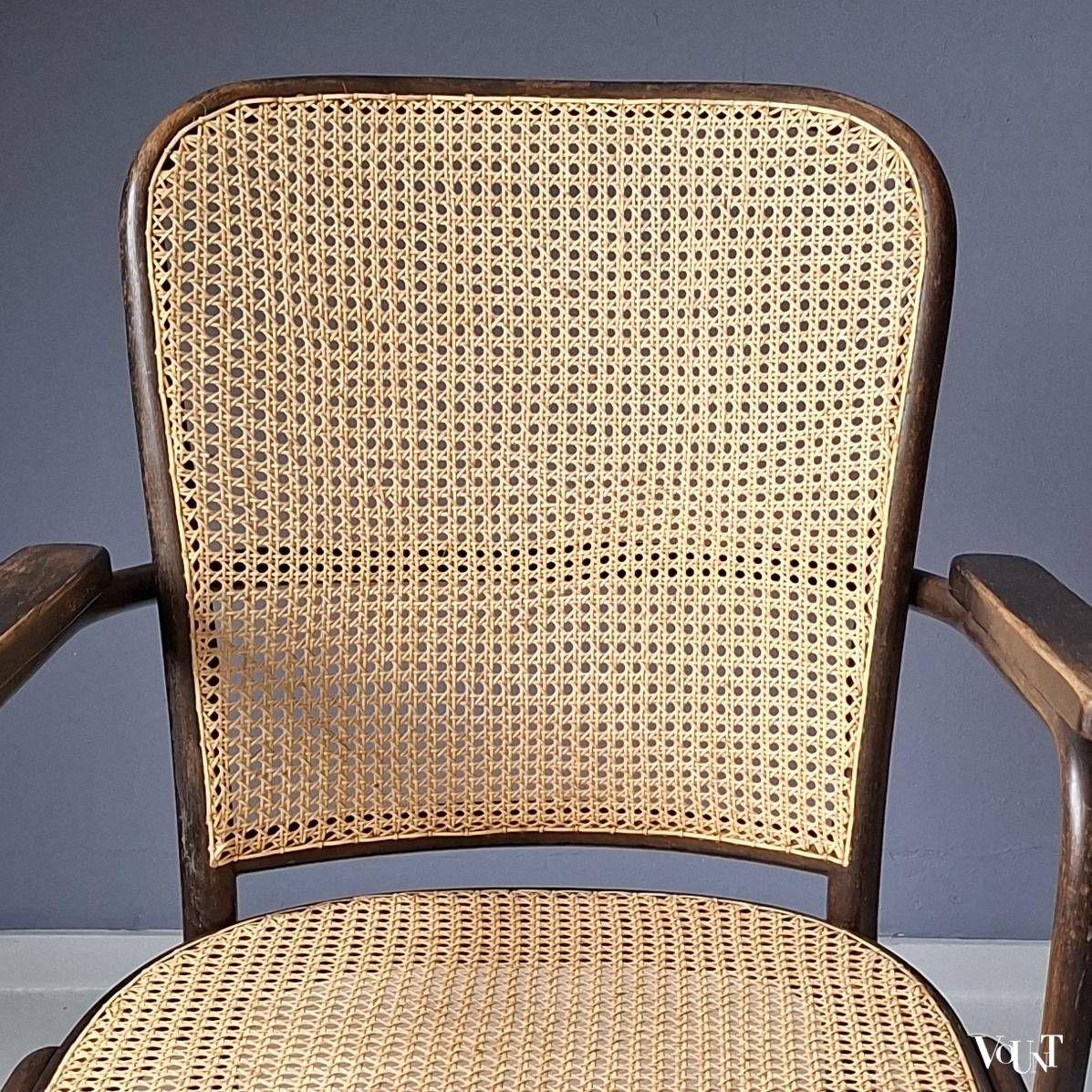 Stoel nr. A 413/2 F staat afgebeeld in de Thonet Mundus catalogus van 1930. Ontworpen door de bekende Oostenrijkse/Zweedse architect Josef Frank (1885-1967). De stoel is in goede conditie. Deze heeft nog de originele, naar een mooi patina afgesleten donkerbruine verflaag. De stoel heeft zowel in rugleuning als zitting een nieuwe (2026) op de oorspronkelijke wijze met de hand geweven rotan webbing. De voorpoten van de stoel zijn aan de binnenzijde voorzien van metalen hoekijzers, identiek aan de Praag of nr. A 811 stoelen van Thonet uit de jaren ’30 (zie: https://www.vount.nl/product/praag-of-a-811-f-stoel-josef-hoffmann-voor-thonet-jaren-30/). Gemerkt “THONET” in het hout onder de zitting.