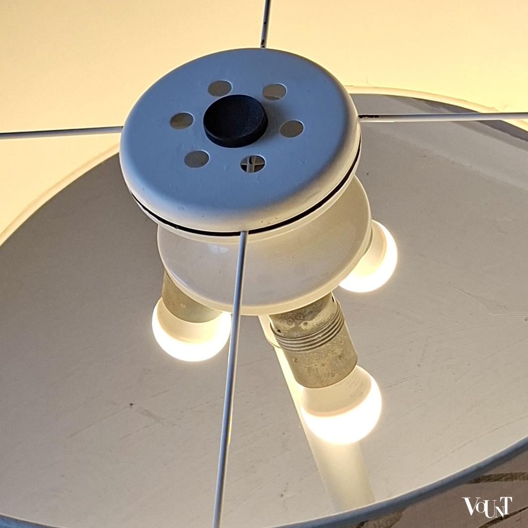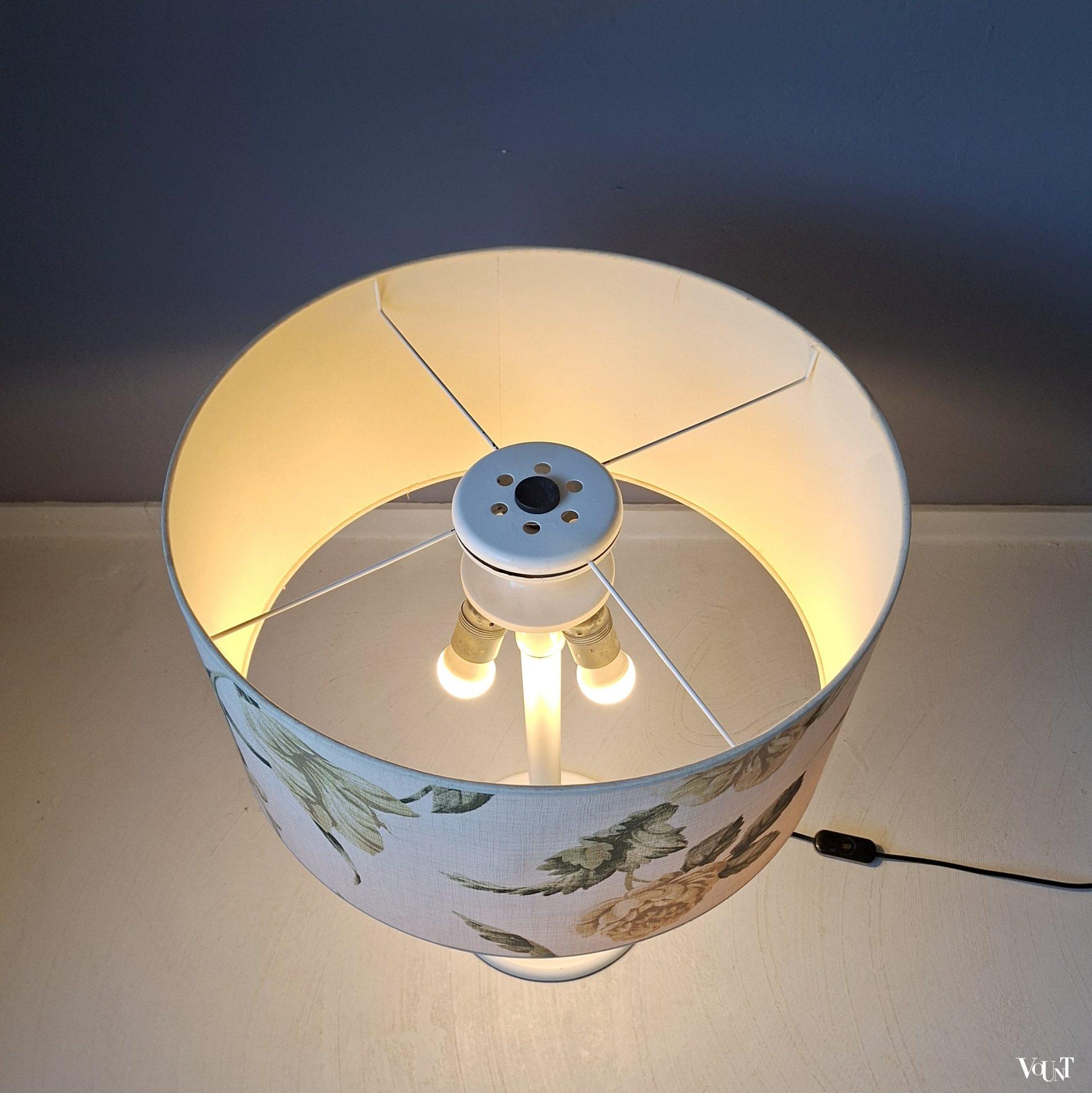 Deze grote jaren ’70/’80 tafellamp met kap met bloemenpatroon is in goede conditie. De voet en de bovenkant van de kaphouder zijn waarschijnlijk een keertje bijgewerkt. Geeft goed licht, 3 fittingen. Stevige en vrij zware lamp (metaal). Producent onbekend.