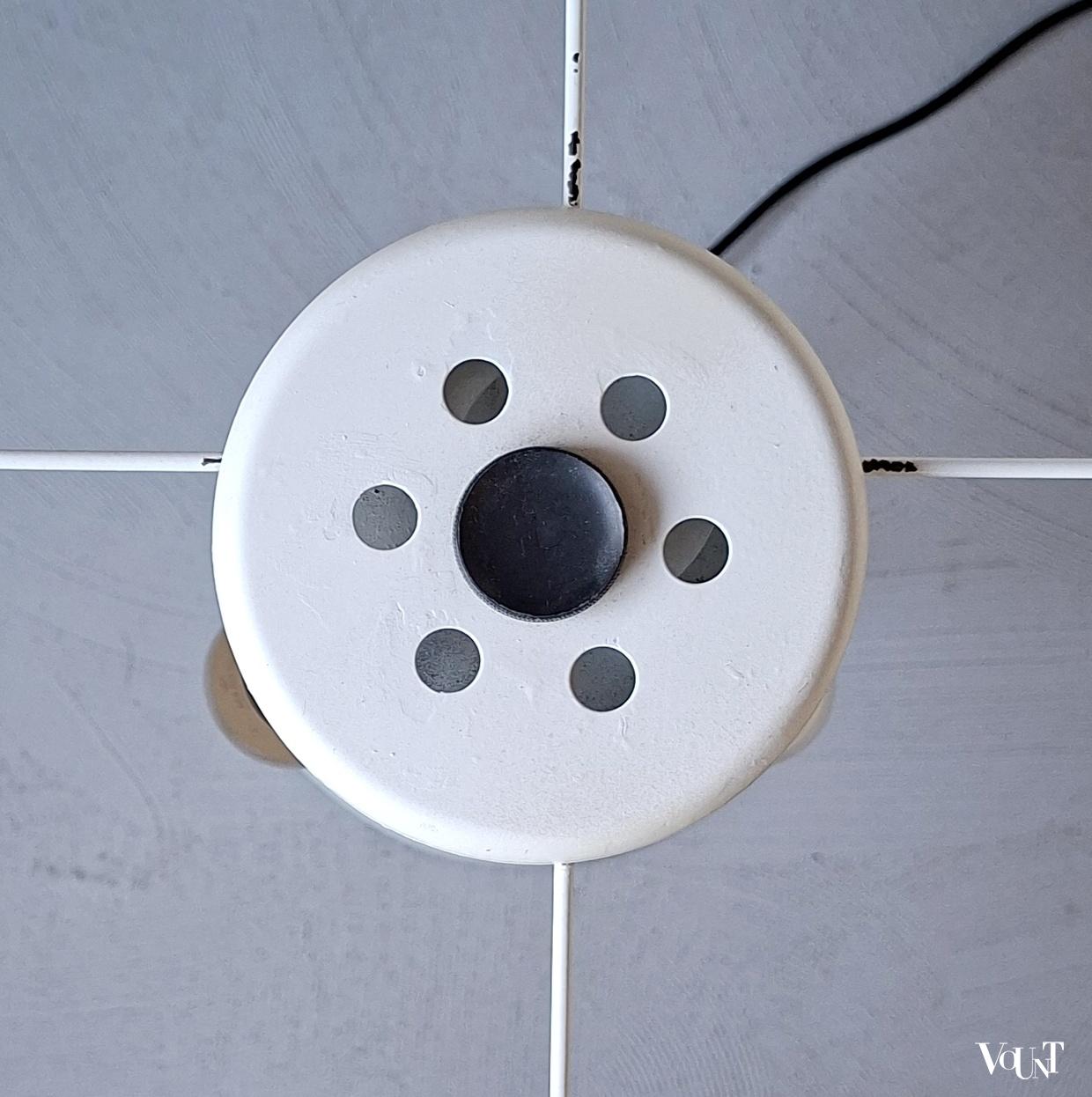 De kap (Ø 50 cm) doet denken aan lampenkappen van Laura Ashley uit de jaren ’70/’80.