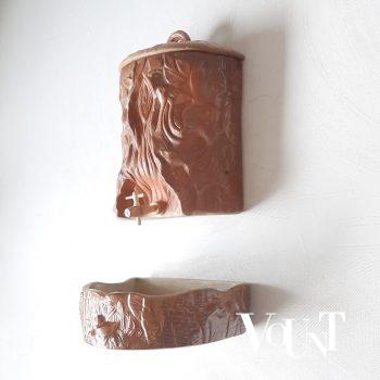 Bijzondere “uilenvaas” van keramiek. Zware kwaliteit. Geen beschadigingen. Waarschijnlijk jaren ’70; zou ook iets ouder kunnen zijn. Niet gesigneerd.