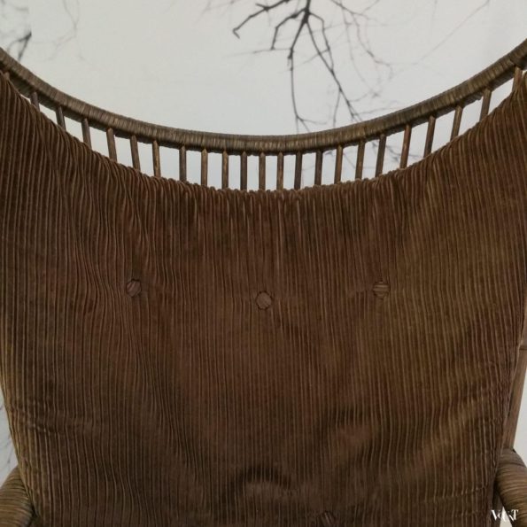 Het ontwerp van deze rotanstoel uit de jaren ’60 is bijzonder vanwege de hoge uitwaaierende rug. Ontwerper/producent vooralsnog onbekend. Mogelijk Rohé Noordwolde. In heel goede staat. De stoel is nog voorzien van het originele bruine ribfluwelen kussen. Dit is nog intact, maar wel plaatselijk verbleekt.