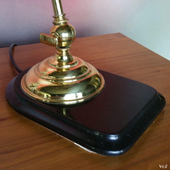 Tegenwoordig heeft Deknudt deze lamp op haar site staan met een groene glazen kap. Persoonlijk vinden wij dit exemplaar met messing kap mooier. Deze kwaliteitslamp heeft een zwarte marmeren voet, een messing trekkoordje en is in verschillende standen te verstellen. Het messing kapje vertoont wel wat gebruikssporen in de vorm van krasjes, maar verder is de lamp in goede, werkende staat. Voorzien van sticker van Lustrerie Deknudt.