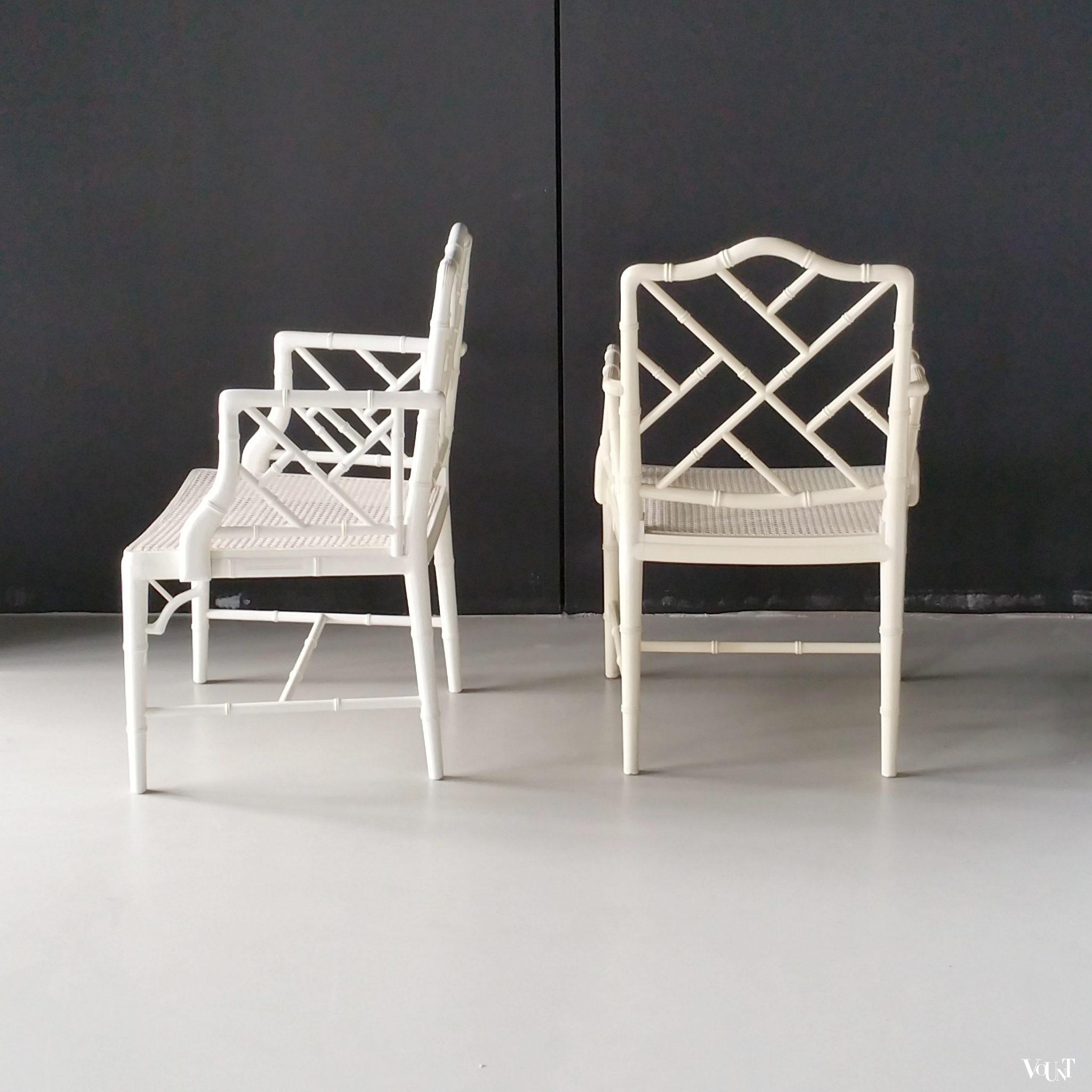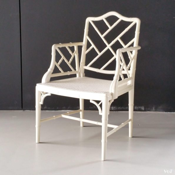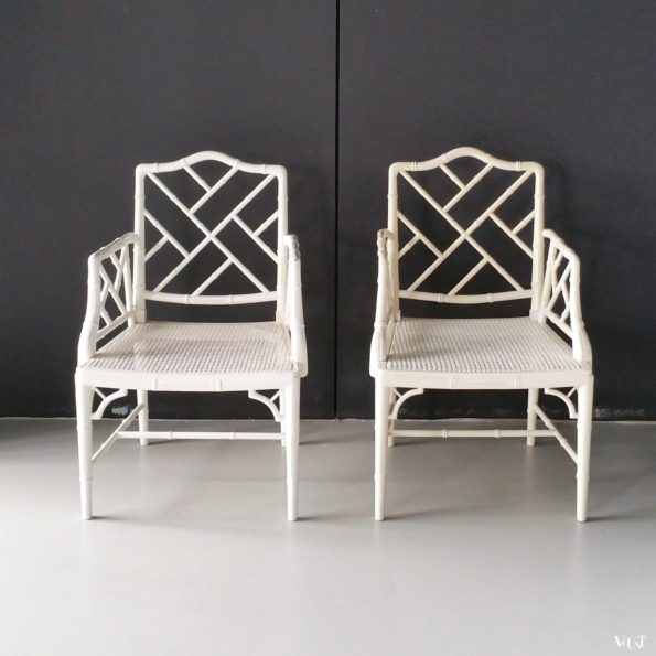 Deze houten wit gelakte faux bamboo Chippendale stoelen uit de jaren ’80 zijn in goede, stabiele staat. De rotan webbing is onbeschadigd. De verf is hier en daar wat afgesleten. Wij hebben 2 van deze stoelen. Per stuk te koop. Eventueel kunnen deze stoelen gecombineerd worden met de stoelen zonder armleuning die ook op onze site worden aangeboden. Deze twee stoelen met armleuning verschillen qua uitvoering iets van elkaar (valt op het eerste oog nauwelijks op).