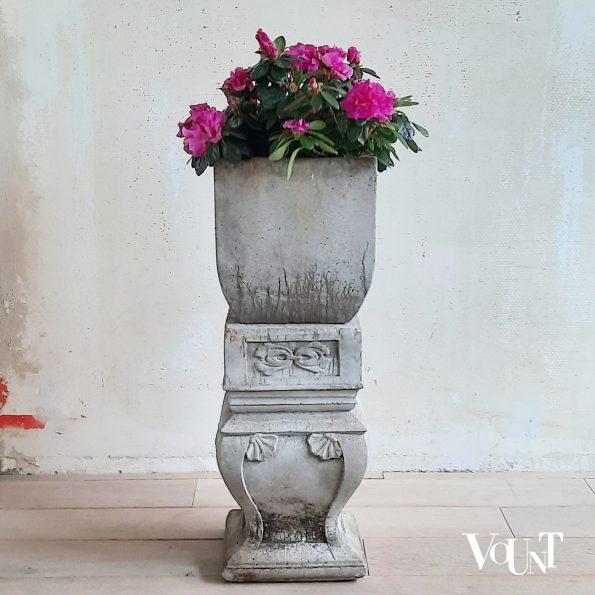 Deze gietstenen tuindecoratie bestaat uit een zuiltje met daarop een losse plantenbak. In goede conditie. Deze heeft voor de leeftijd normale gebruikssporen. Zwaar.