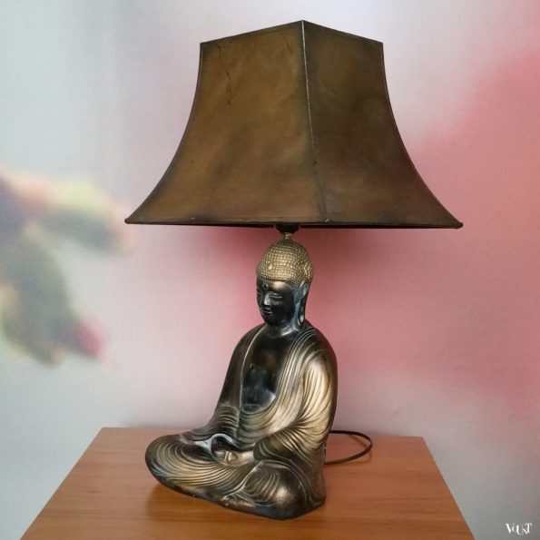 Deze boeddha-lamp van keramiek is van zware kwaliteit en in goede conditie. De kap van de lamp heeft de afgelopen decennia minder goed doorstaan: “battered and bruised”, zoals de Engelsen zeggen. Is dus eigenlijk aan vervanging toe, maar wel origineel.