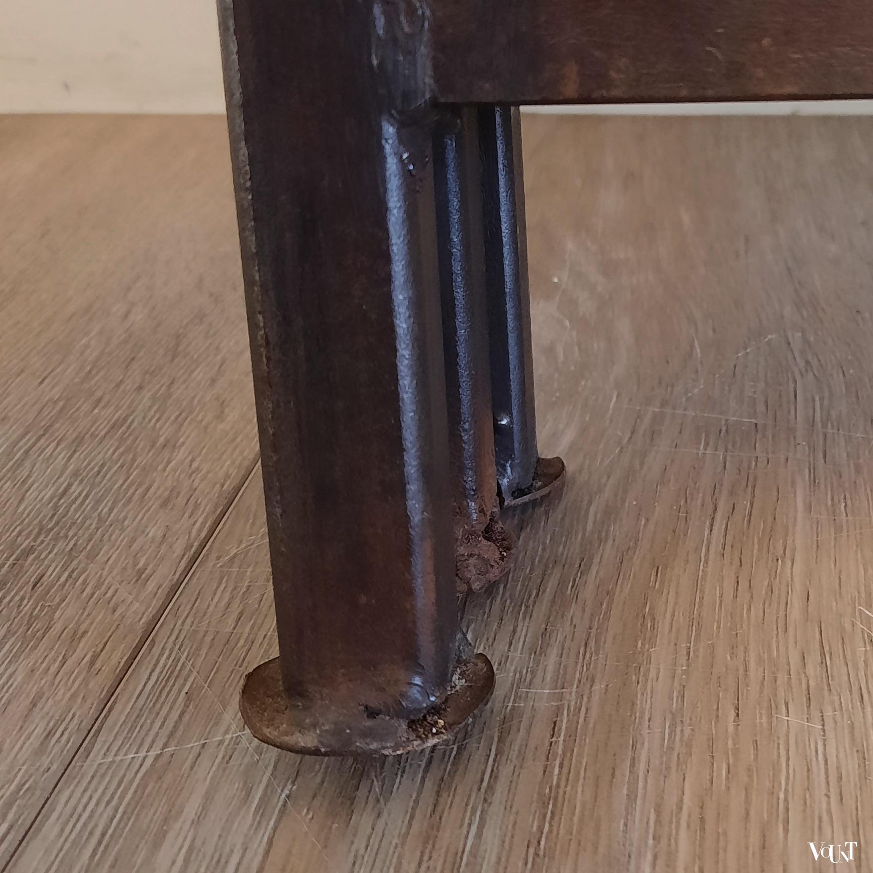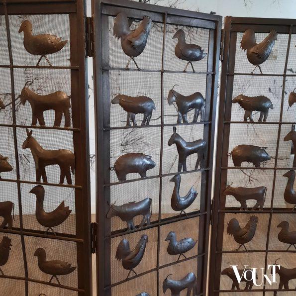 Dit vintage metalen / smeedijzeren kamerscherm wordt vaak toegeschreven aan of is in ieder geval in de stijl van werk van de Franse kunstenaar Jean Touret voor Atelier Marolles, jaren ’50. Er heeft veel ambachtelijk werk in gezeten. Boerderijdieren van metaal in een metalen frame en tegen een achtergrond van een metalen raster. Goed decoratie-item. In mooie conditie.