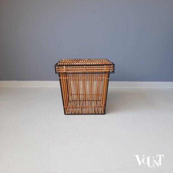 Je kunt hem eigenlijk voor van alles gebruiken: prullenmand, lectuurmand, opbergmand. Zwart metalen frame gecombineerd met rotan. In goede conditie.