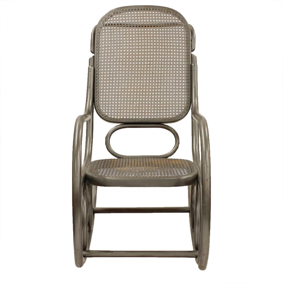 Op Thonet geïnspireerde schommelstoel. Het hout en de webbing van de stoel waren waarschijnlijk oorspronkelijk van een lichte kleur. Door de vorige eigenaar zijn deze zilver gespoten. Dit staat niet eens zo verkeerd. De stoel is in goede gebruikte conditie. De webbing is intact.