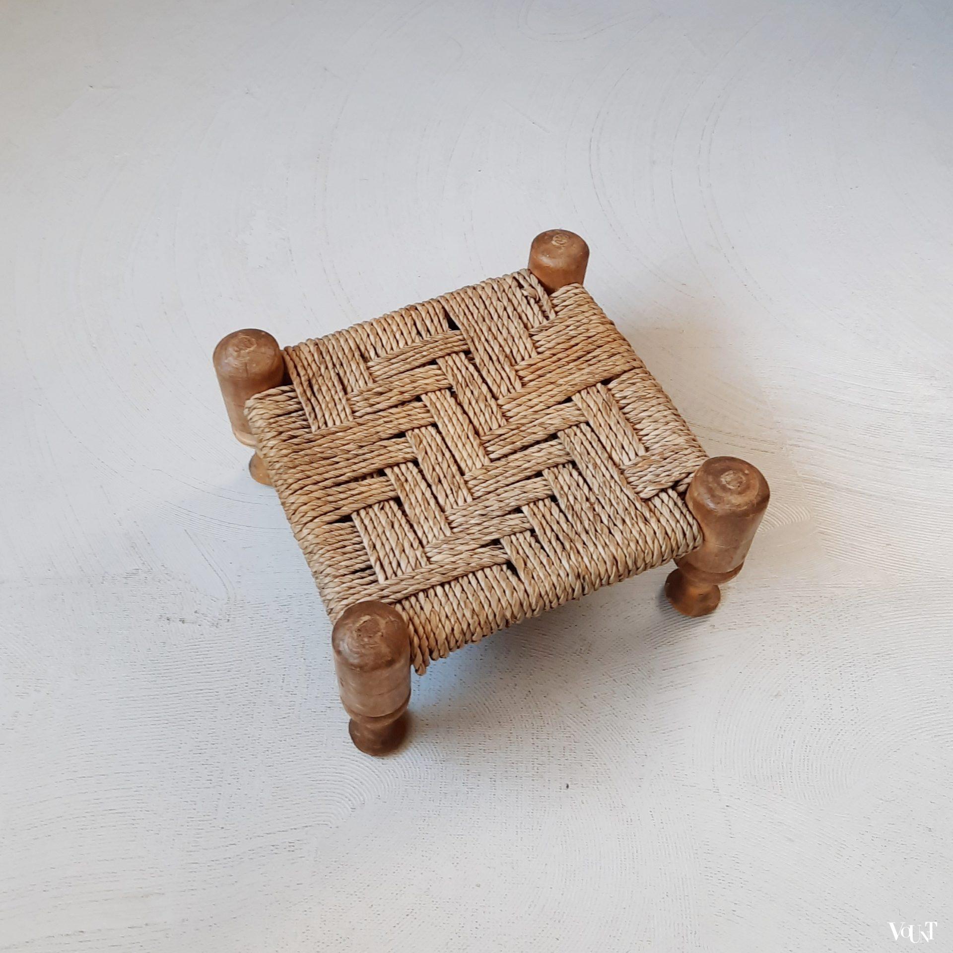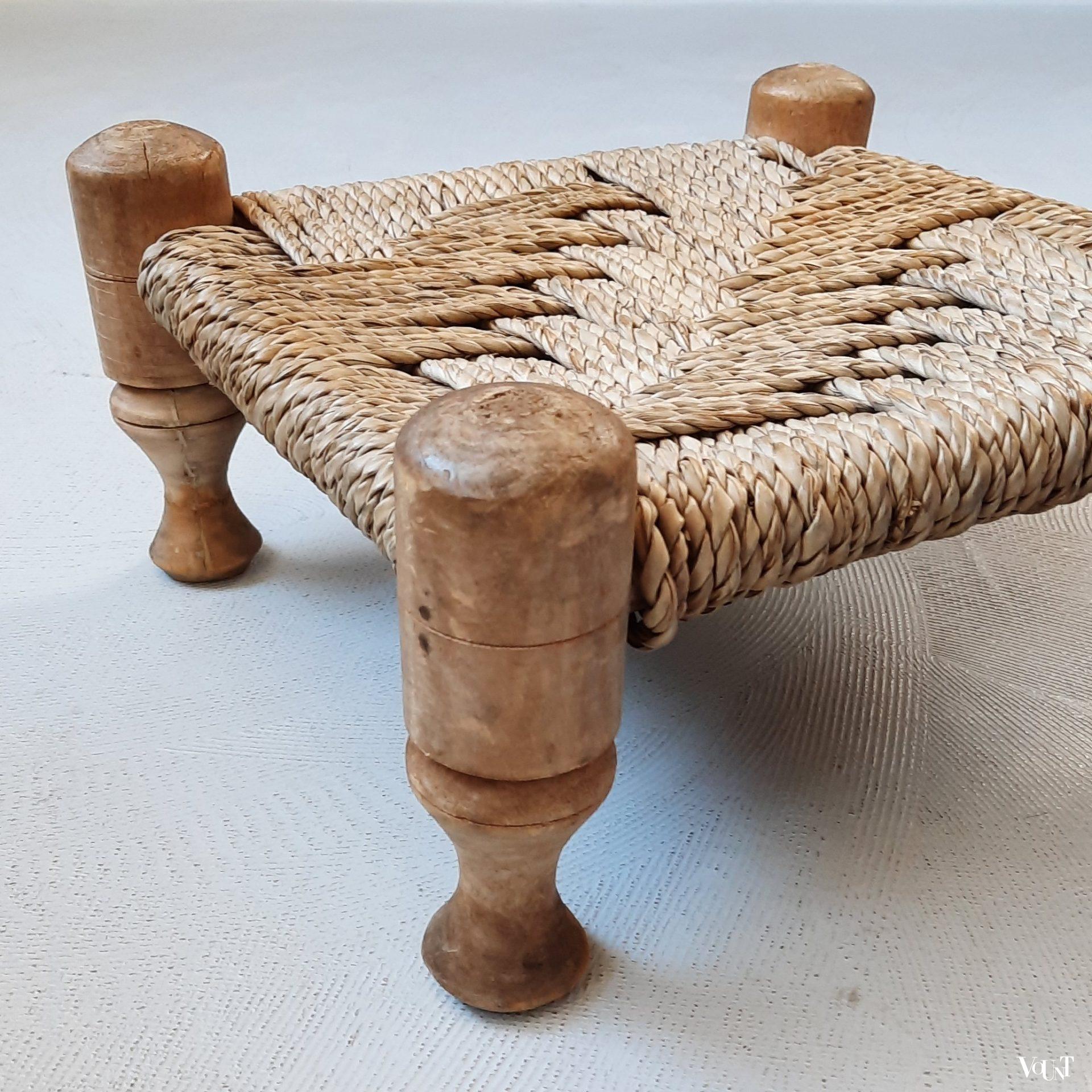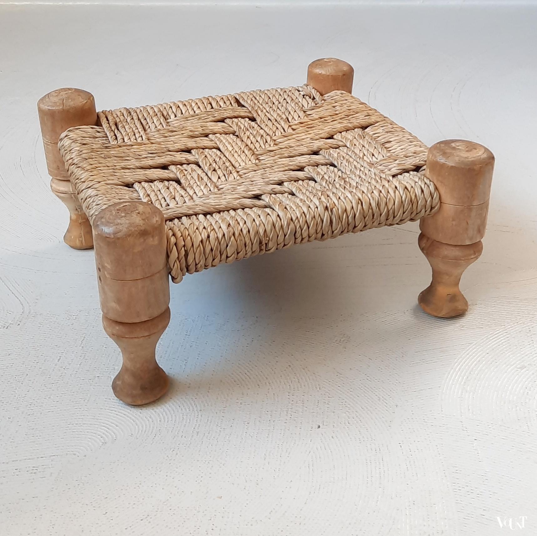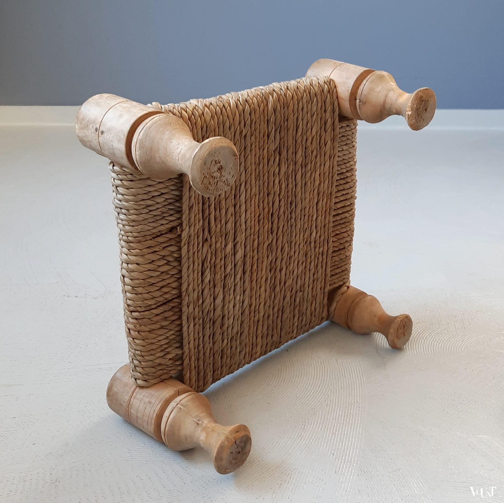Mocht je de stoel hebben, dan staat dit voetenbankje goed bij die stoel van eveneens hout en touw uit de jaren ’60/’70. Zie de laatste foto. (Helaas hebben wij de stoel niet meer op voorraad). Niet voor je voeten? Ook heel geschikt voor naast je stoel of bed om er je boek of tijdschriften op te leggen. In goede conditie.